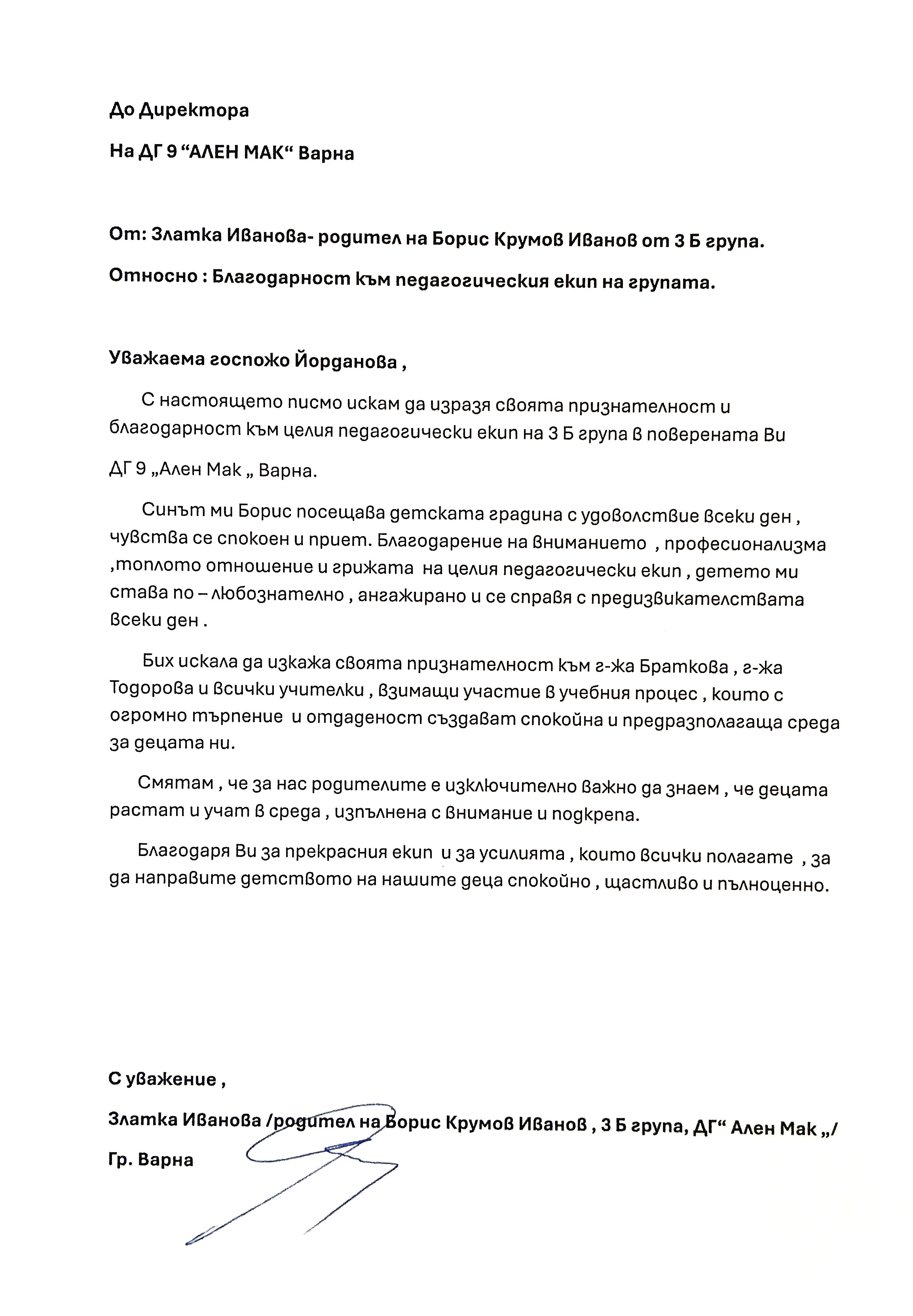 3. Благодарност към педагогическия екип на група "Сръчковци"