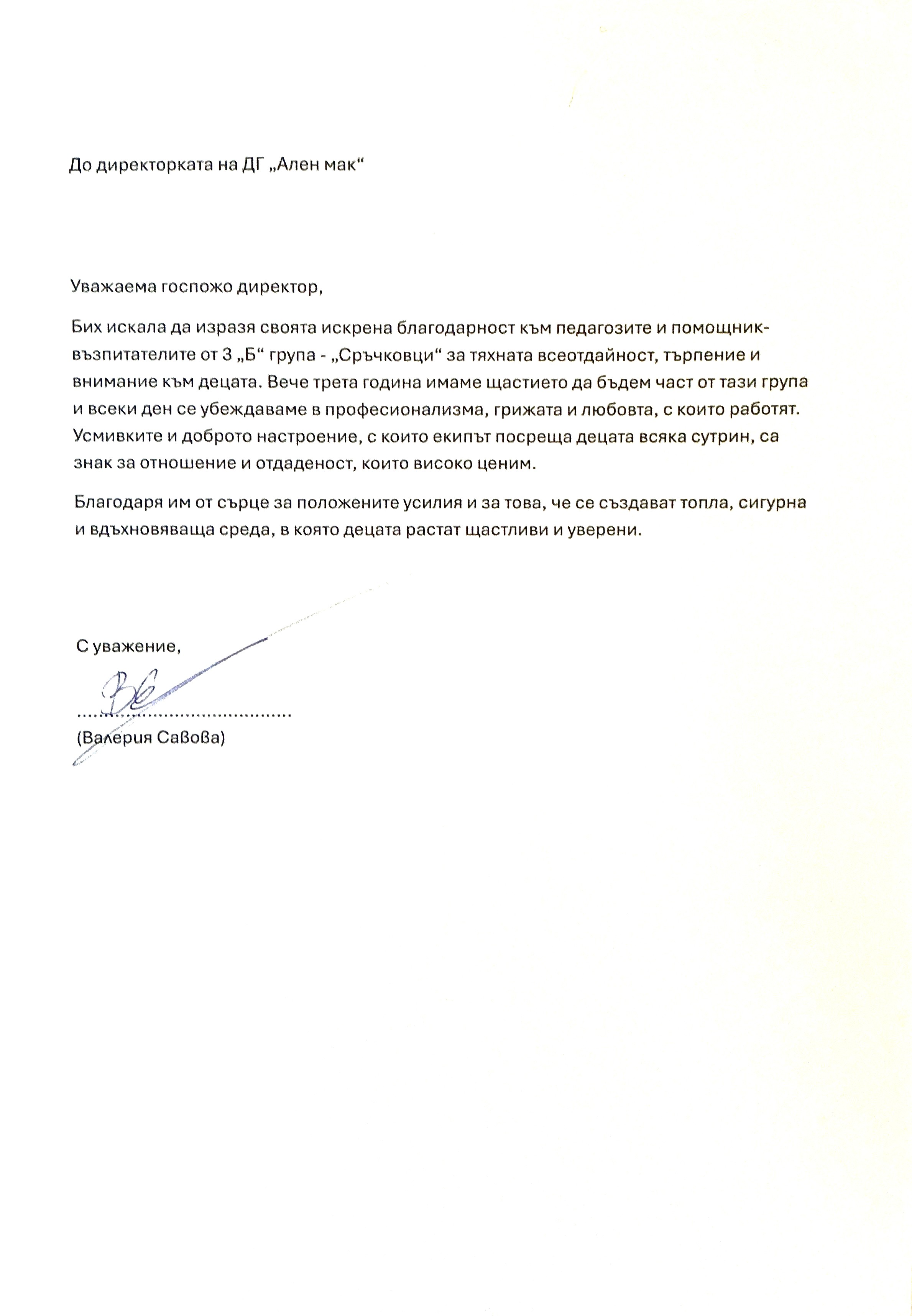 3. Благодарност от Валерия Савова- родител на дете от група "Сръчковци"