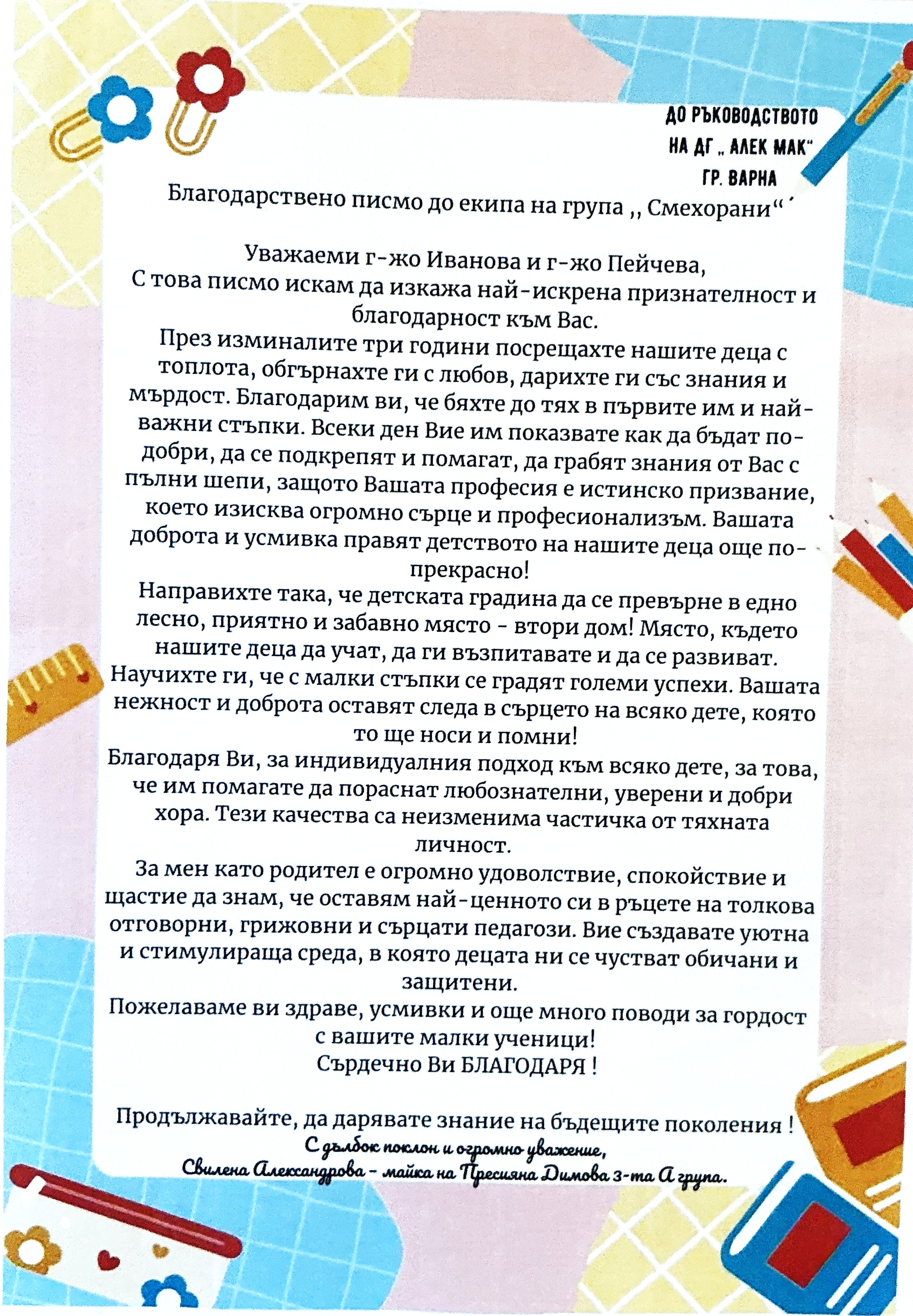 3. Благодарствено писмо до екипа на група "Смехорани"