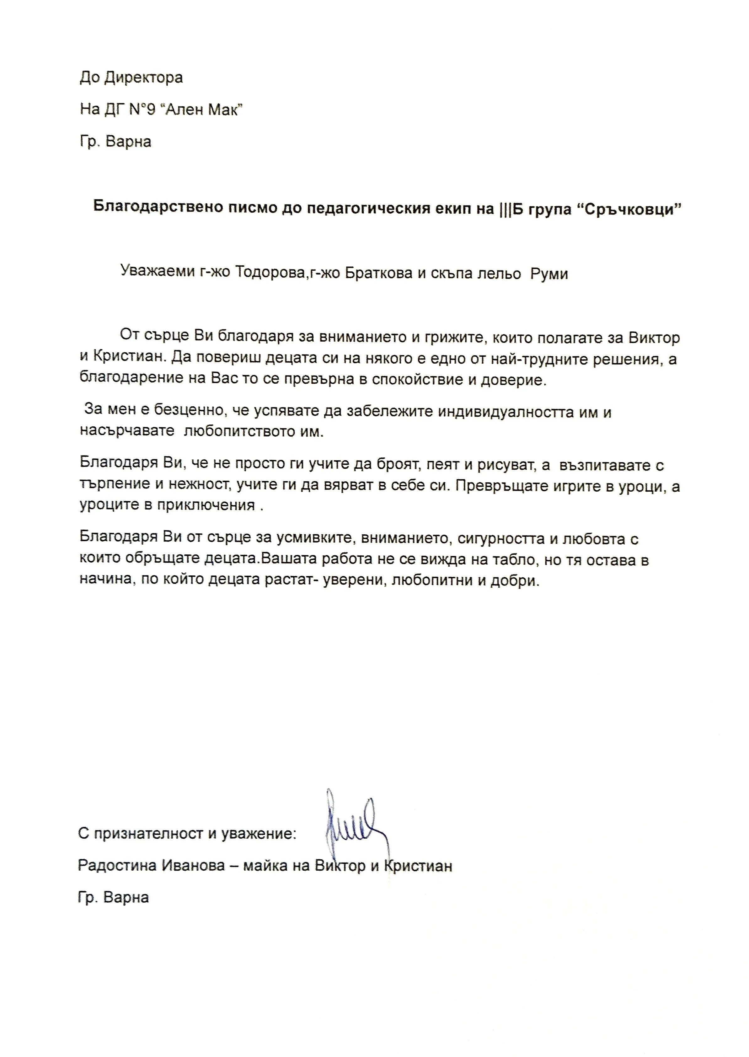 Благодарствено писмо до педагогическия екип на III Б група "Сръчковци"