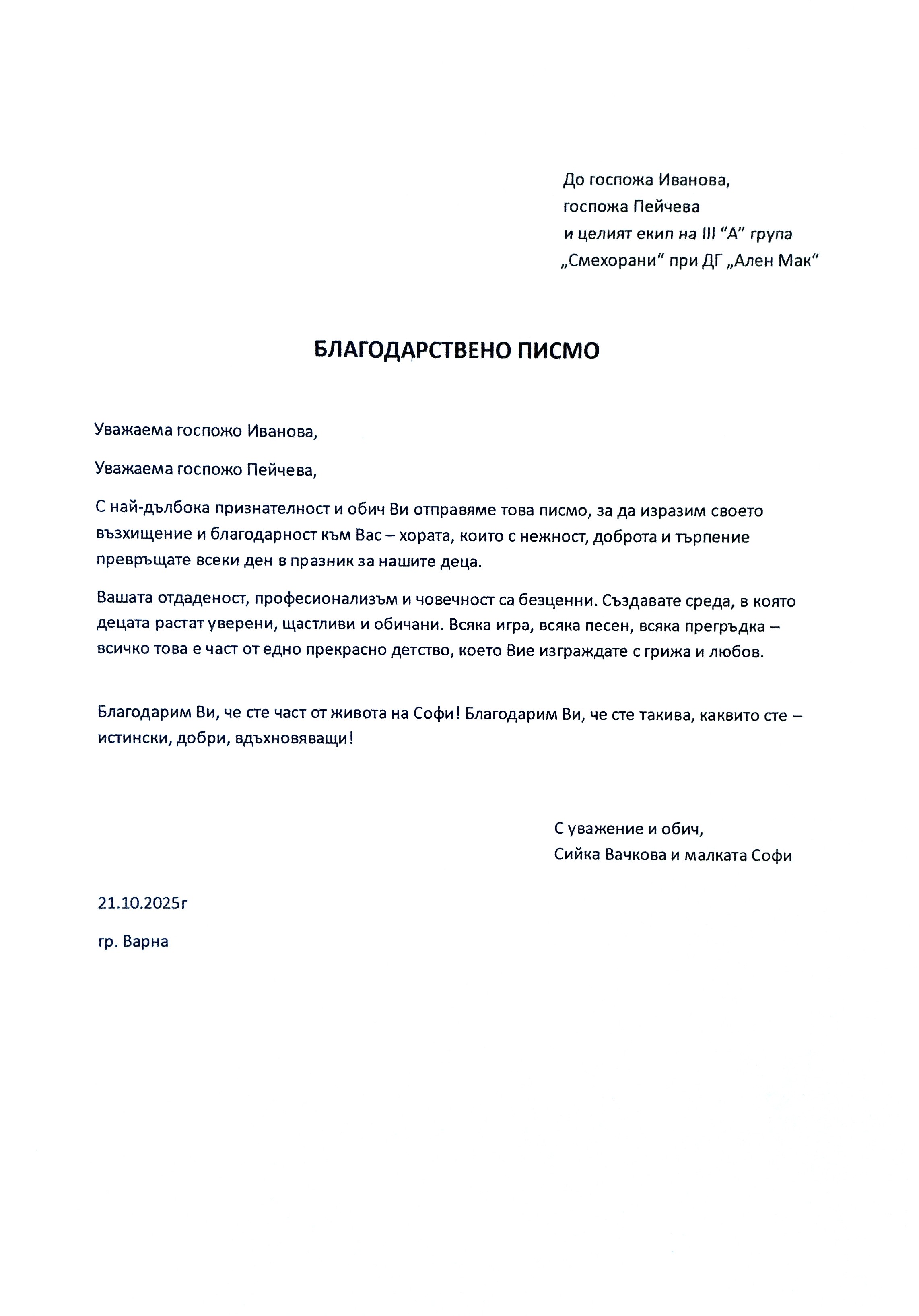 3. Благодарствено писмо към целия екип на III A група "Смехорани"