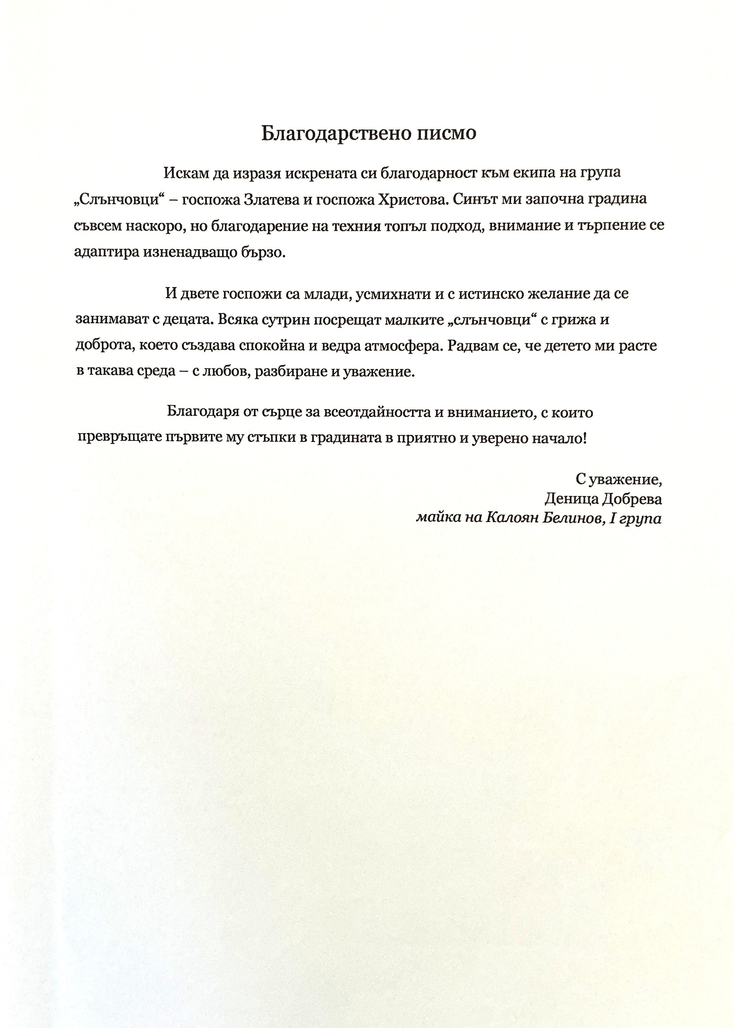 3. Благодарствено писмо към екипа на група "Слънчовци"