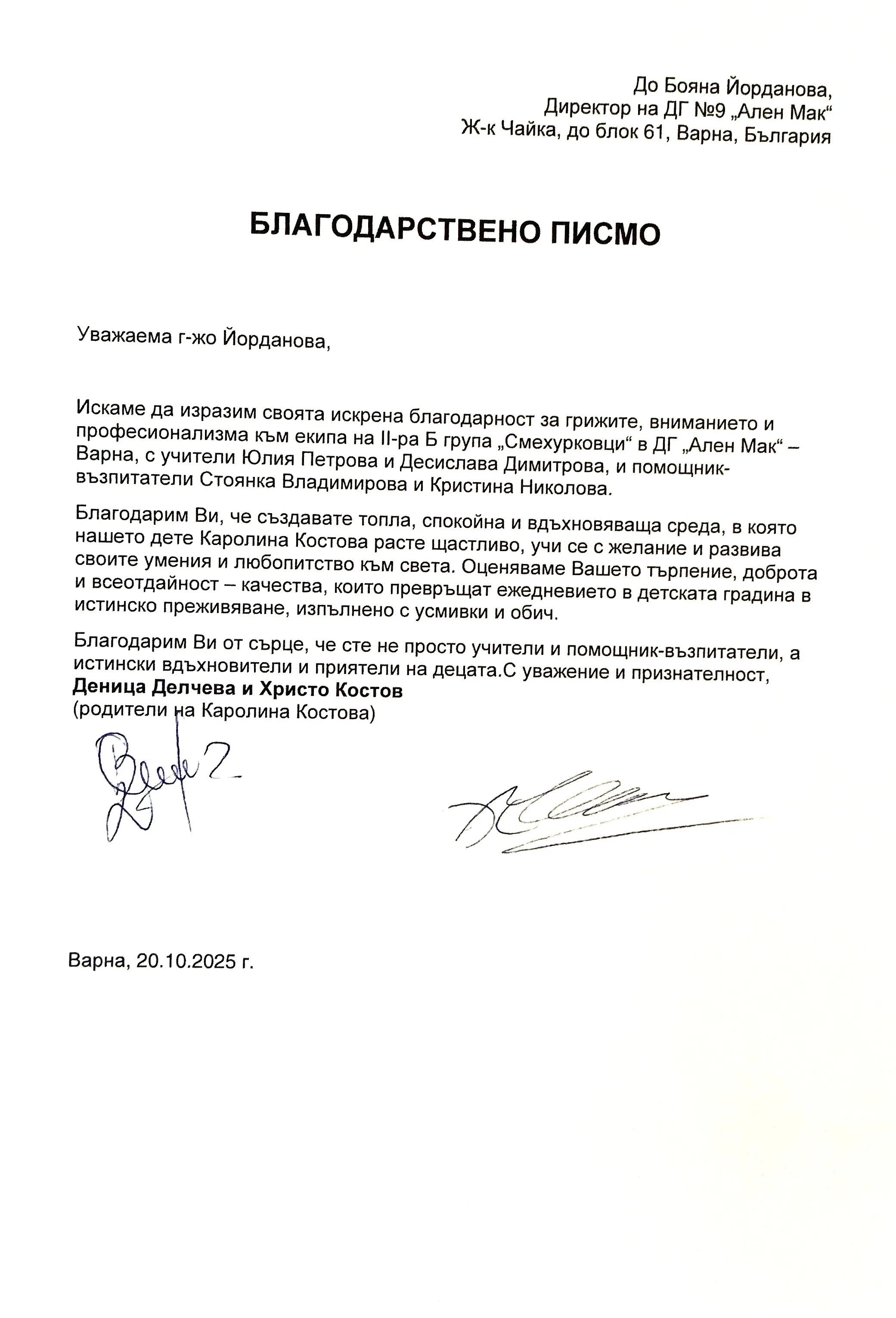 3. Благодарствено писмо към екипа на група "Смехурковци"