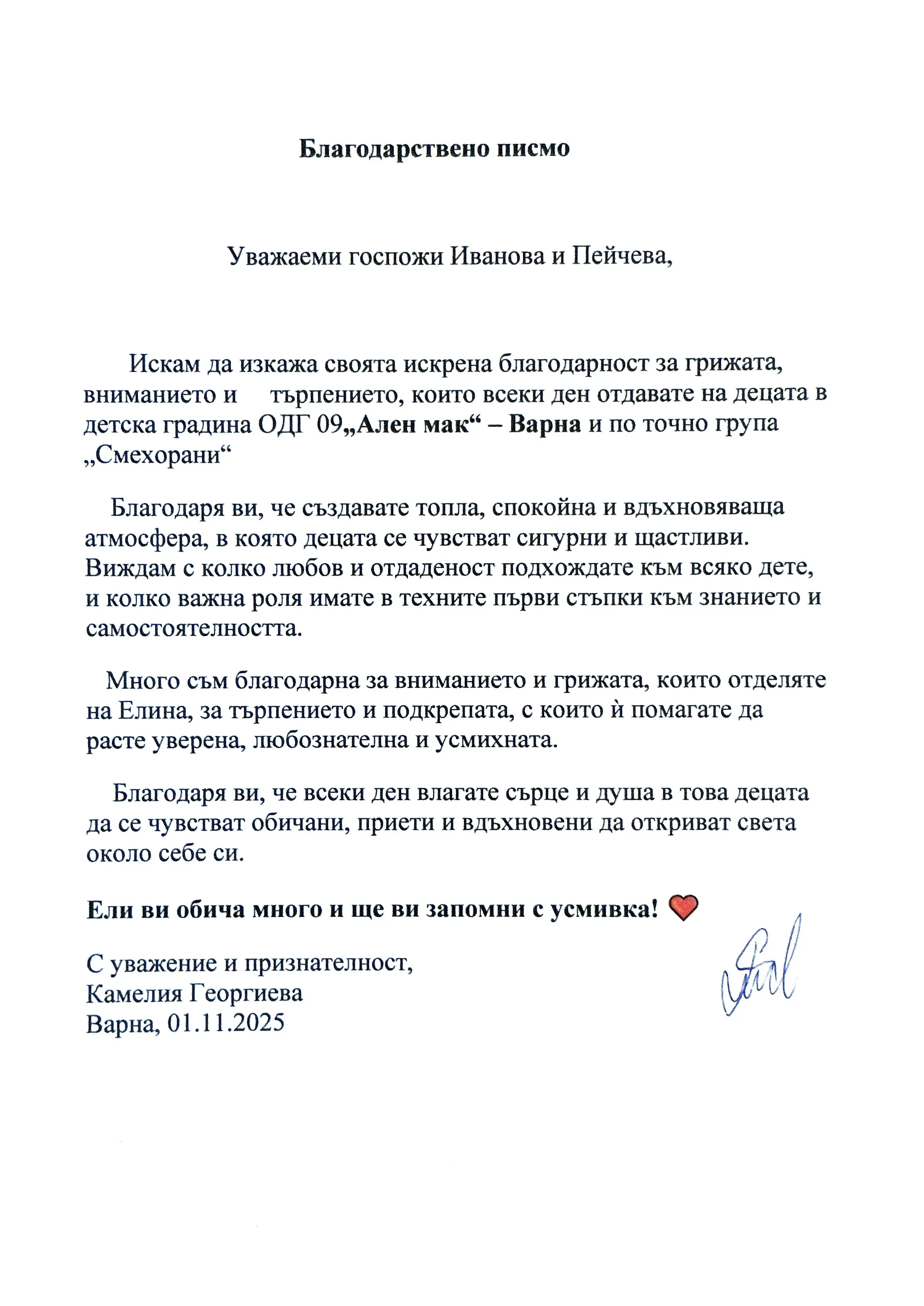 3. Благодарствено писмо към екипа на III A група "Смехорани"