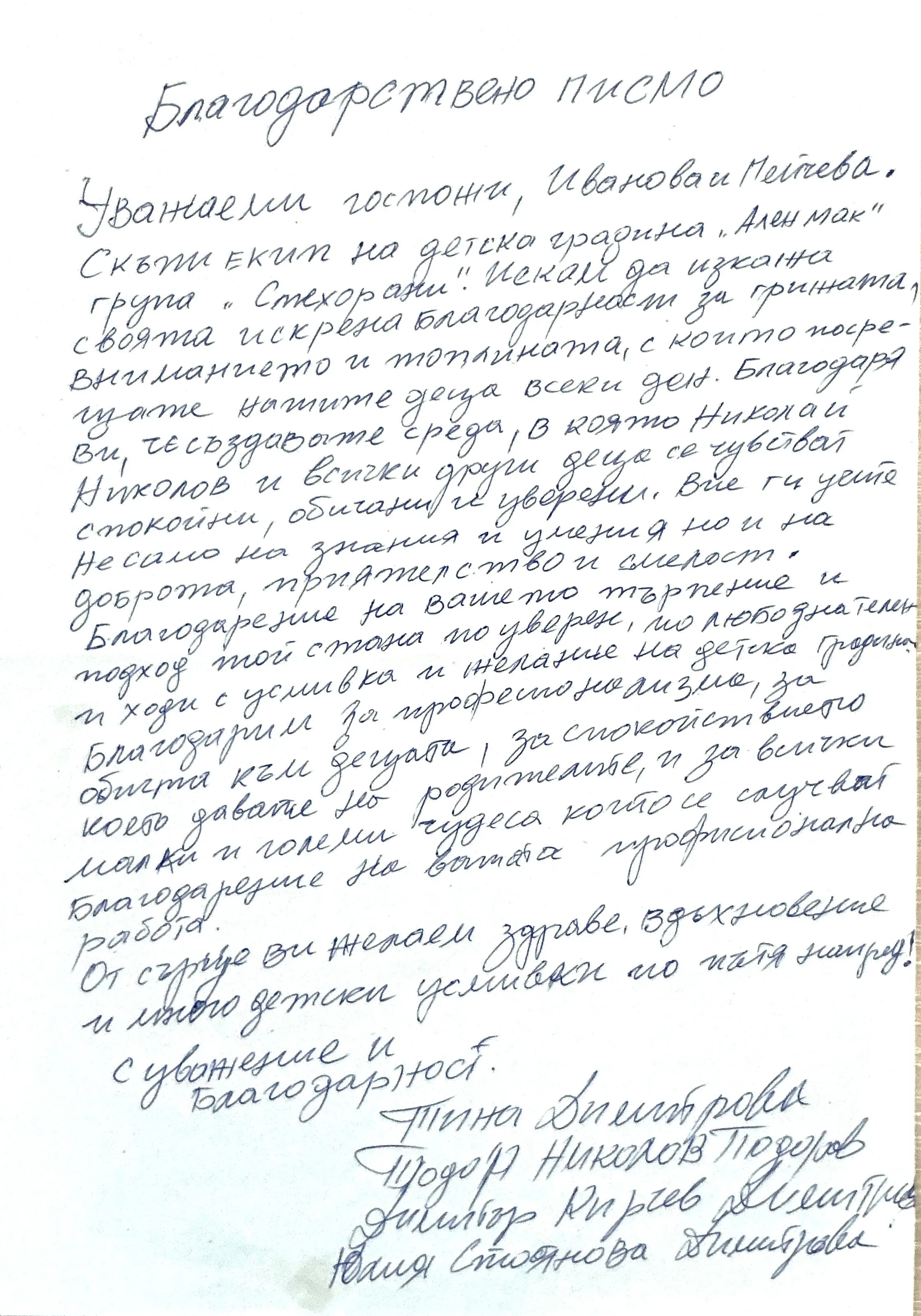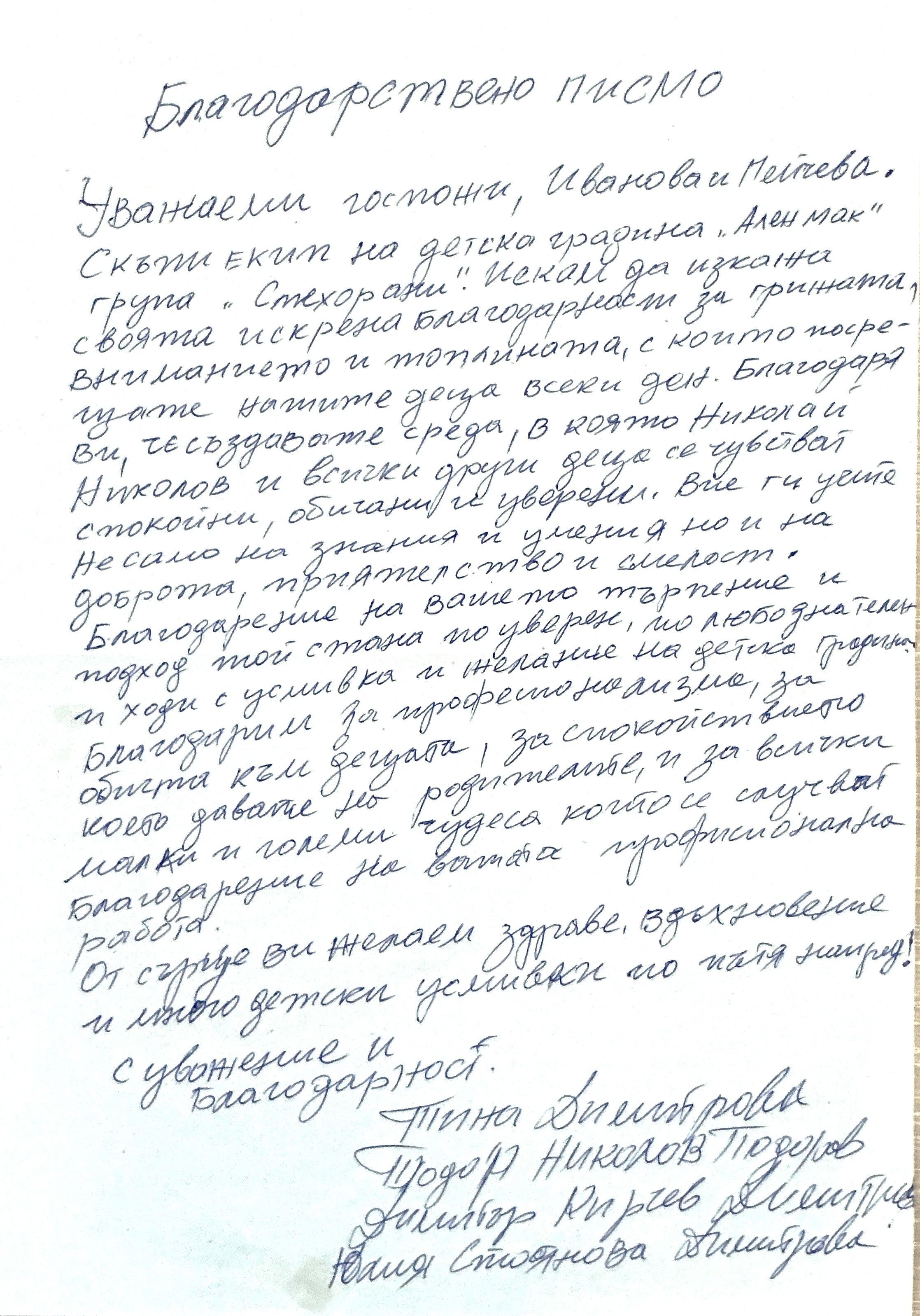 Благодарствено писмо към г-жа Иванова и г-жа Пейчева