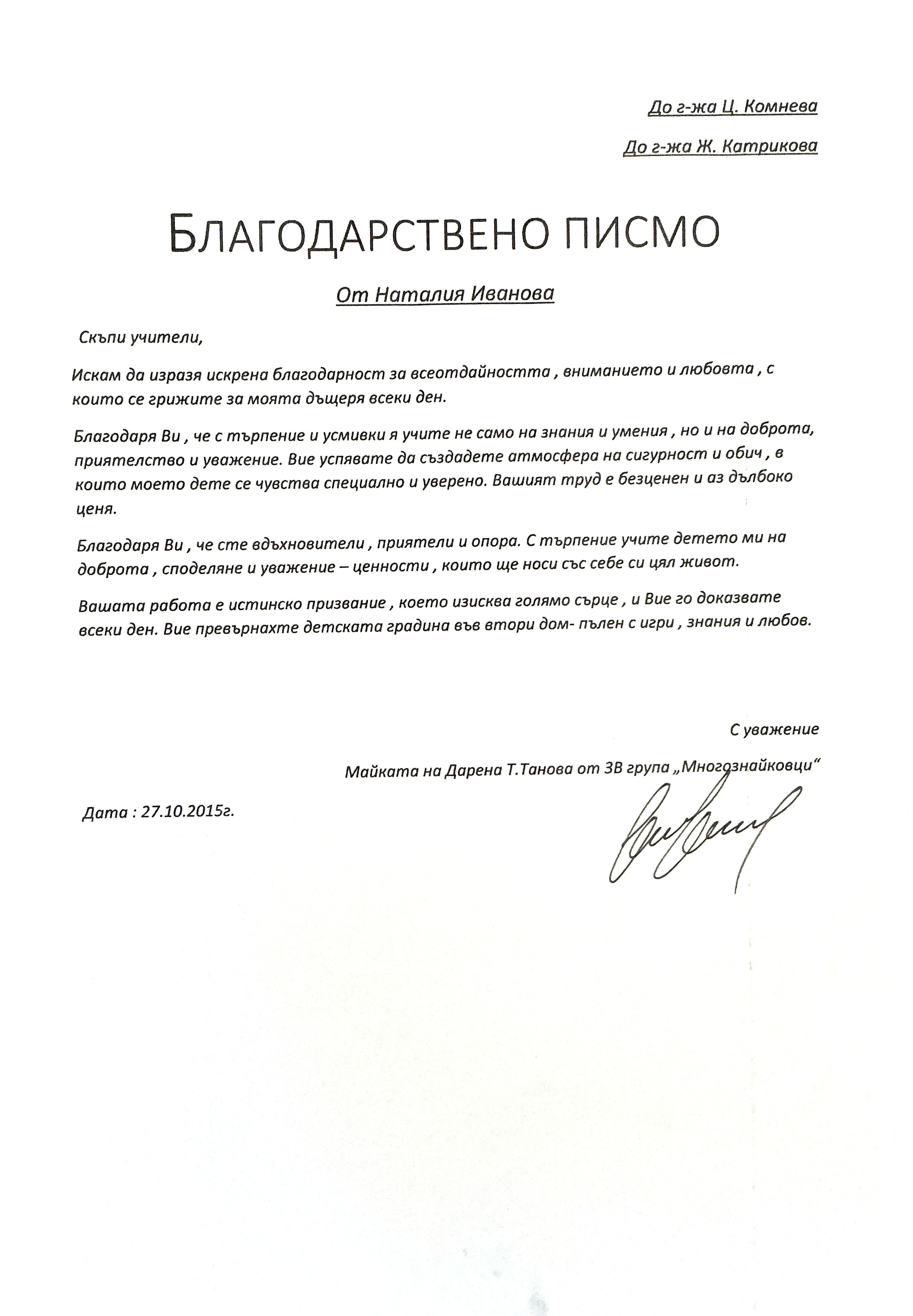 Благодарствено писмо към г-жа Катрикова и г-жа Комнева