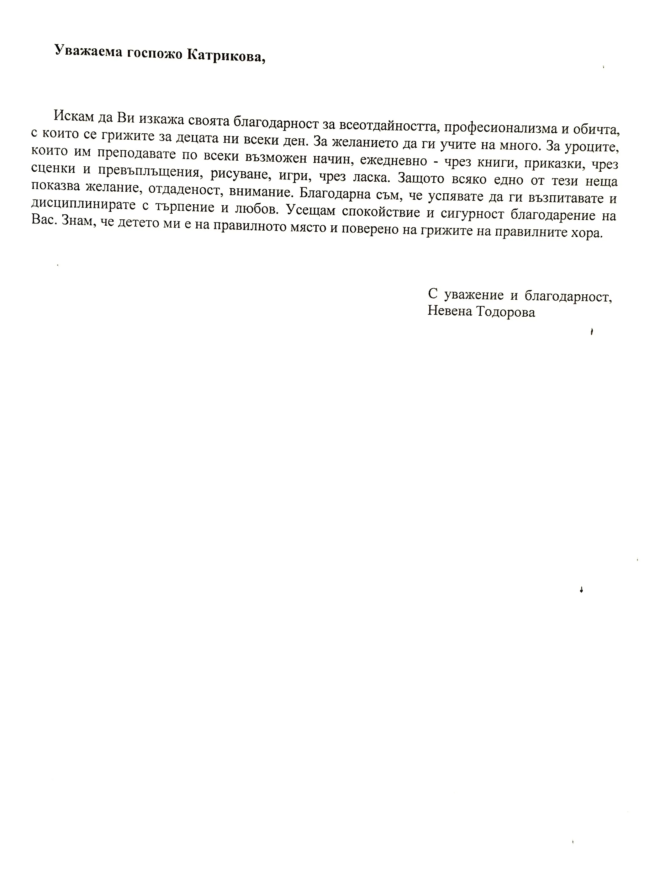 Благодарствено писмо към г-жа Катрикова