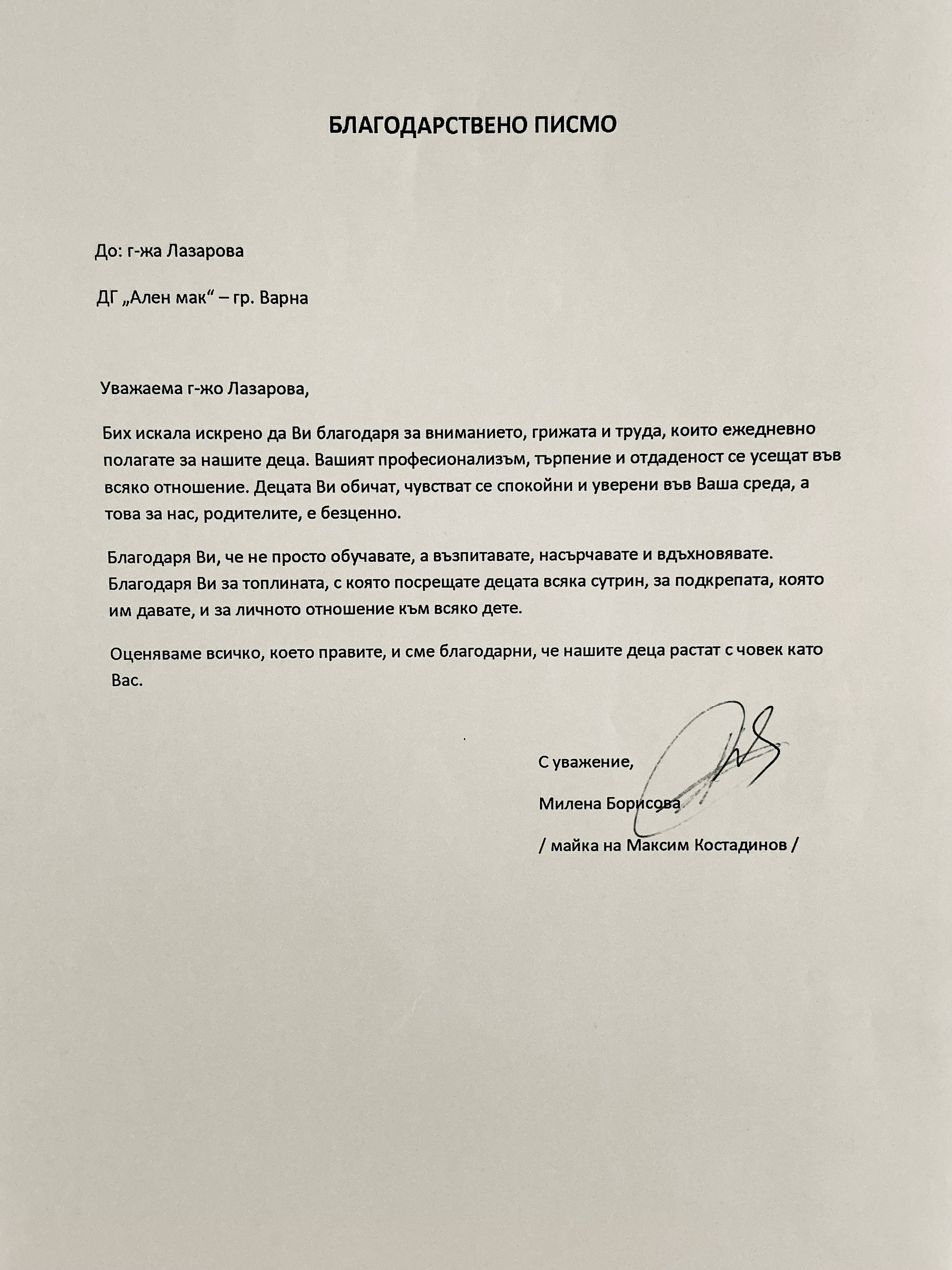 Благодарствено писмо към г-жа Лазарова