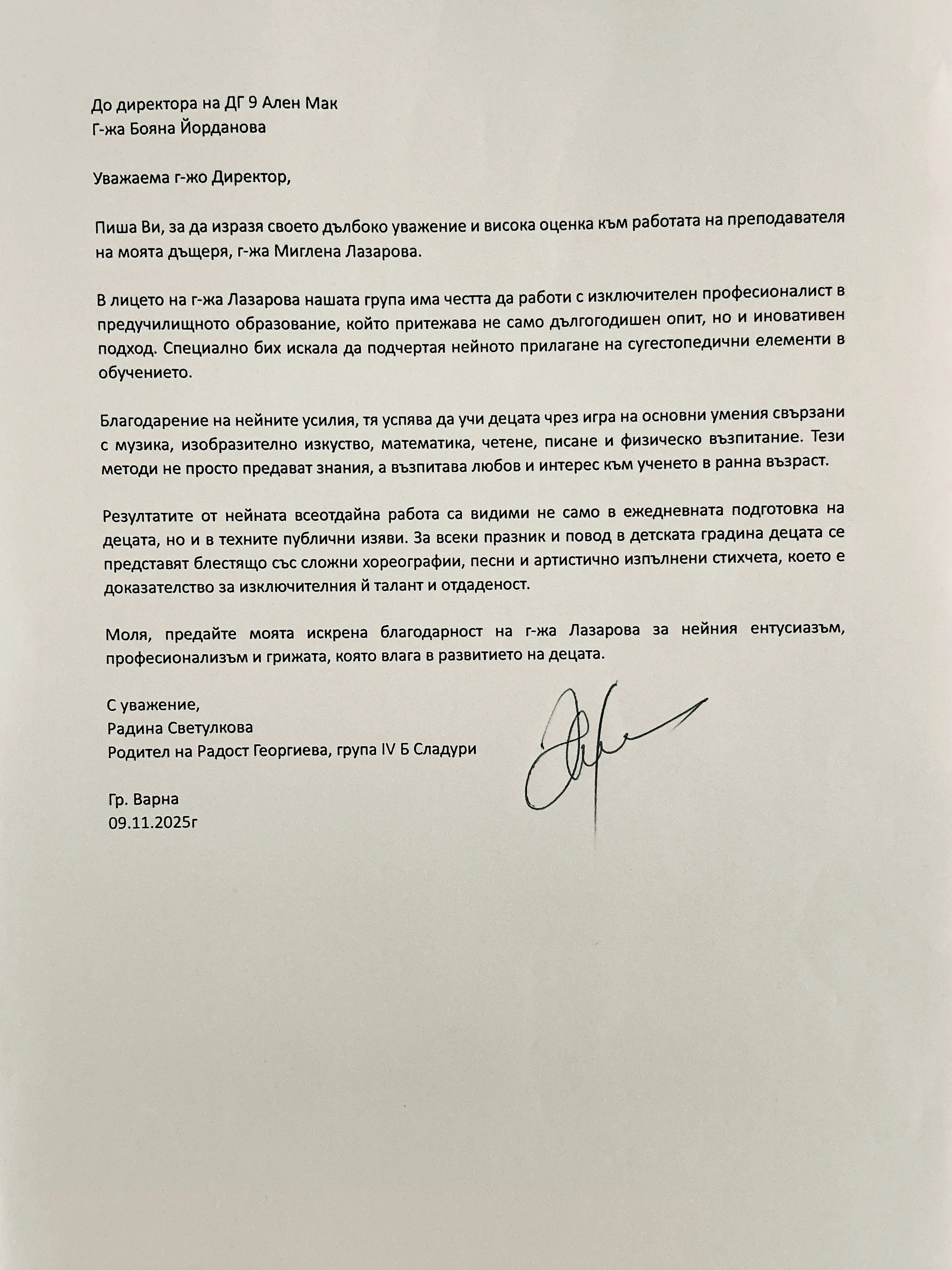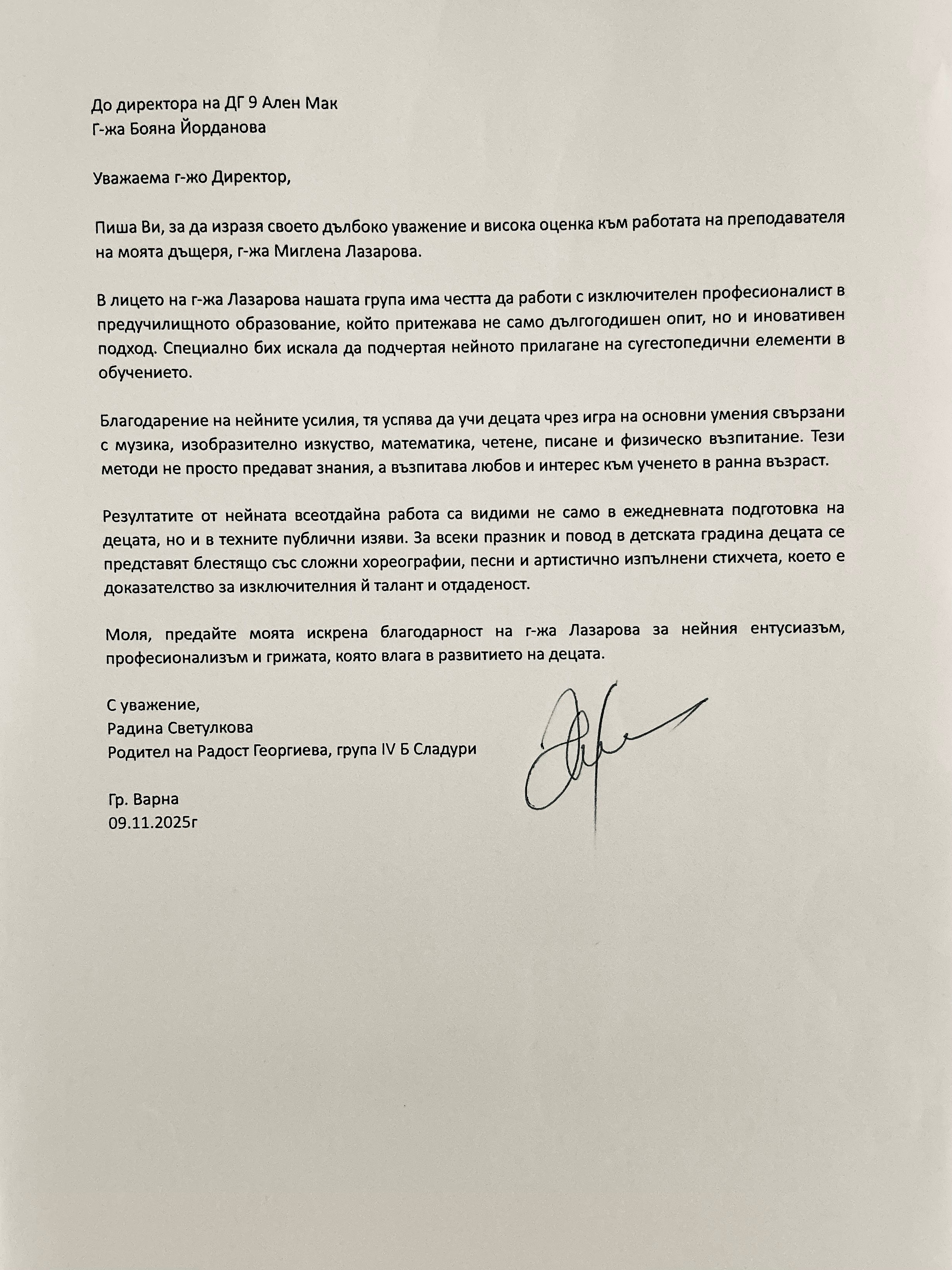 Благодарствено писмо към г-жа М.Лазарова