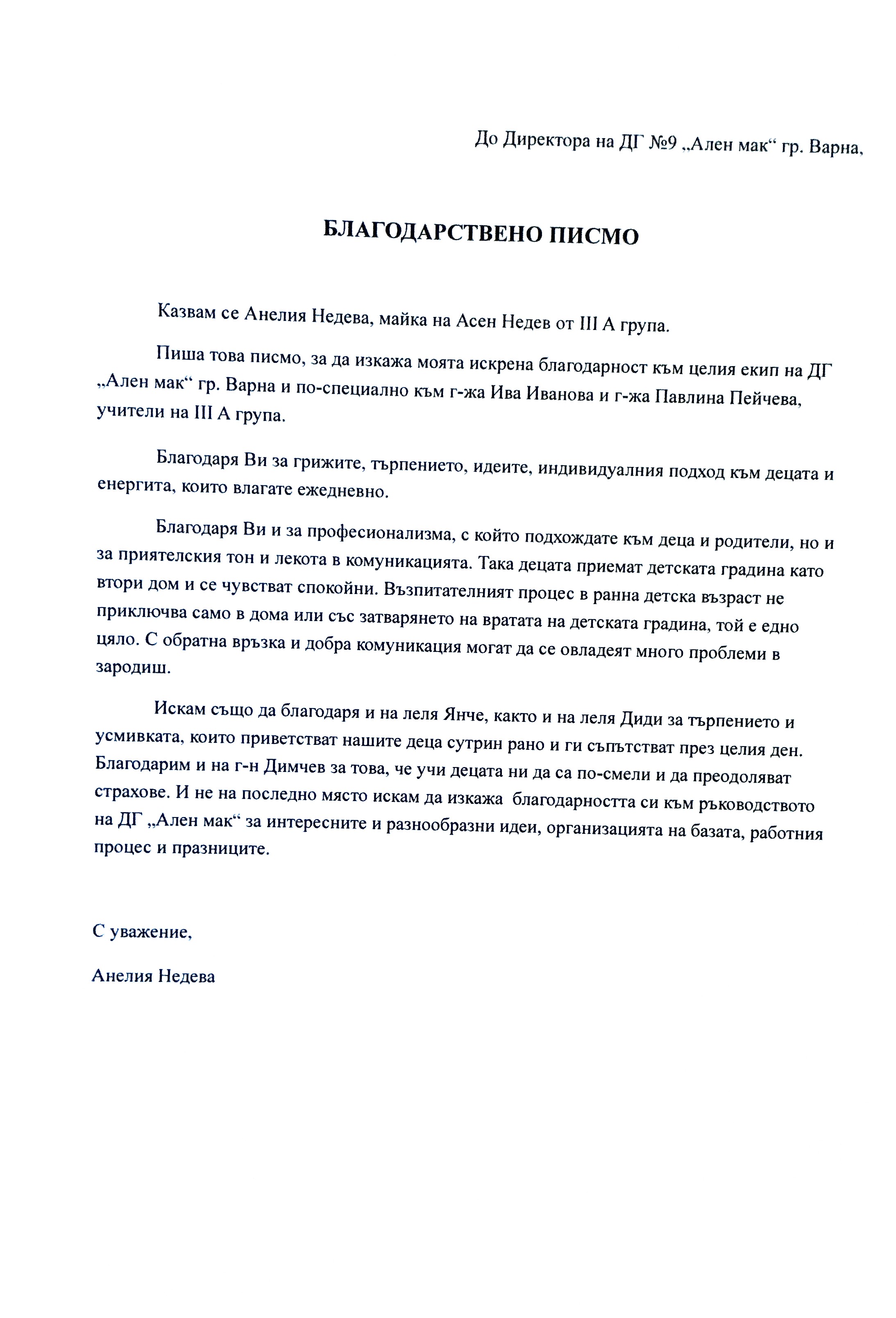 Благодарствено писмо към г-жа Пейчева и г-жа Иванова