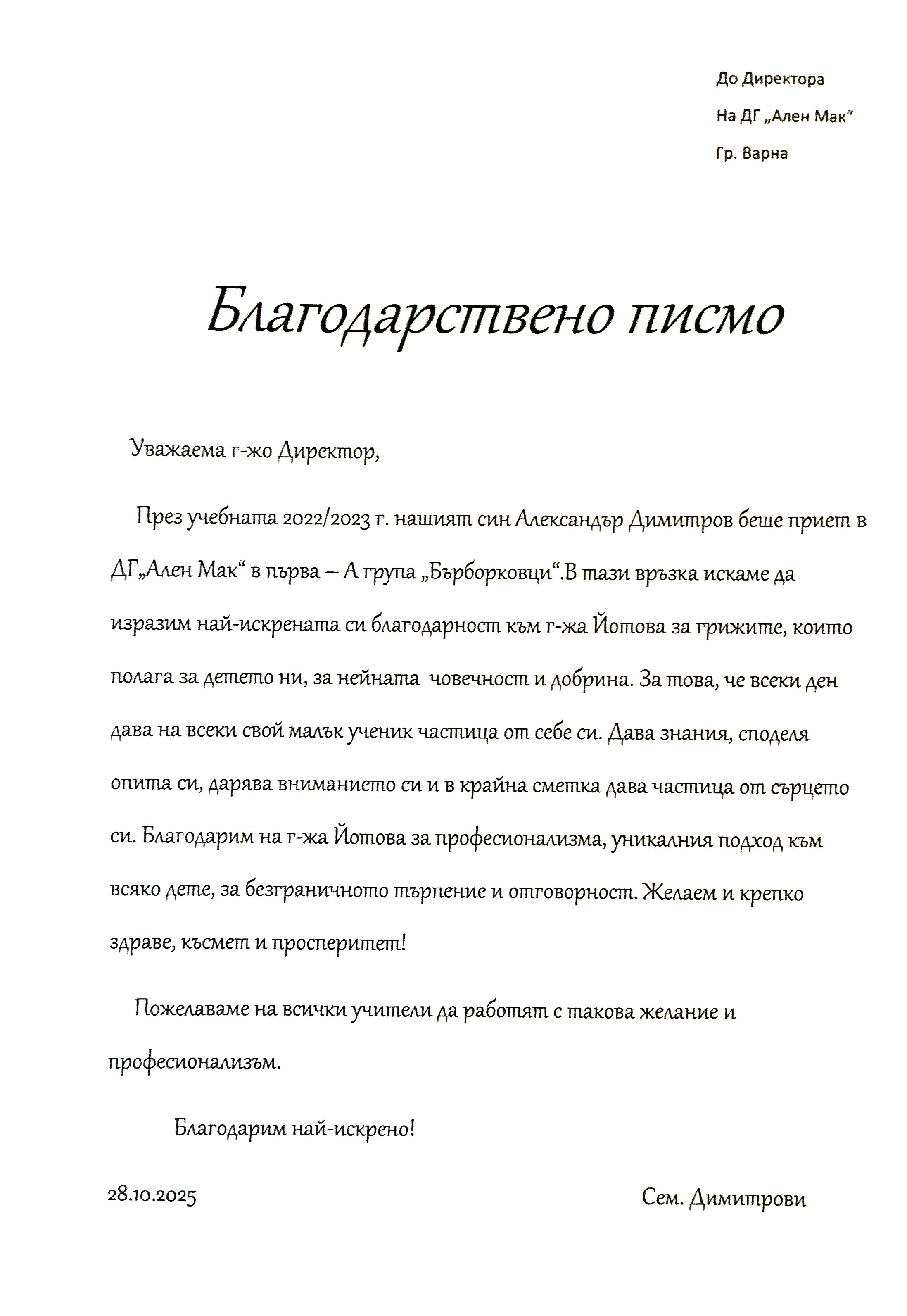 3. Благодарствено писмо към група "Бърборковци"