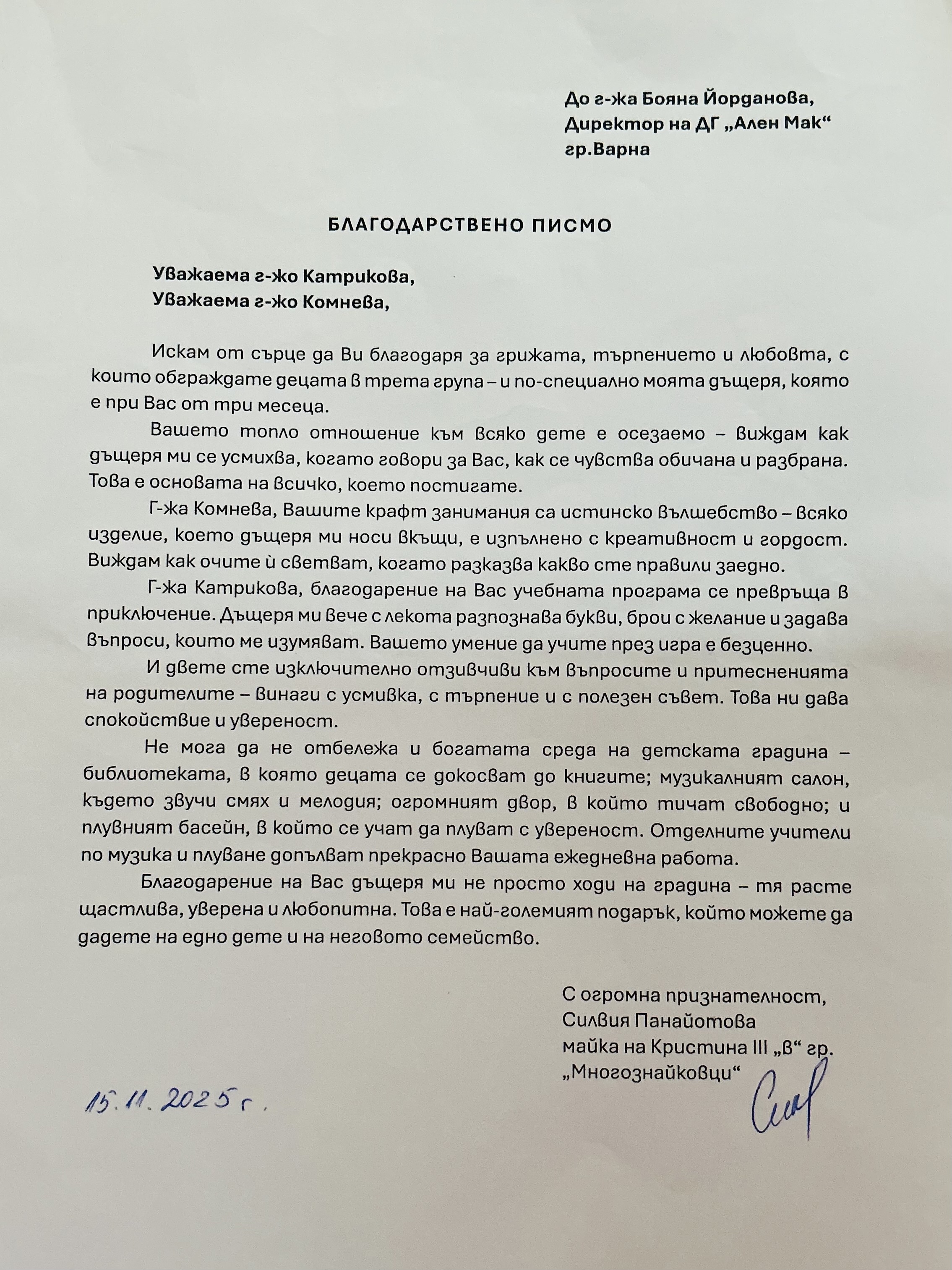 3. Благодарствено писмо към група "Многознайковци"