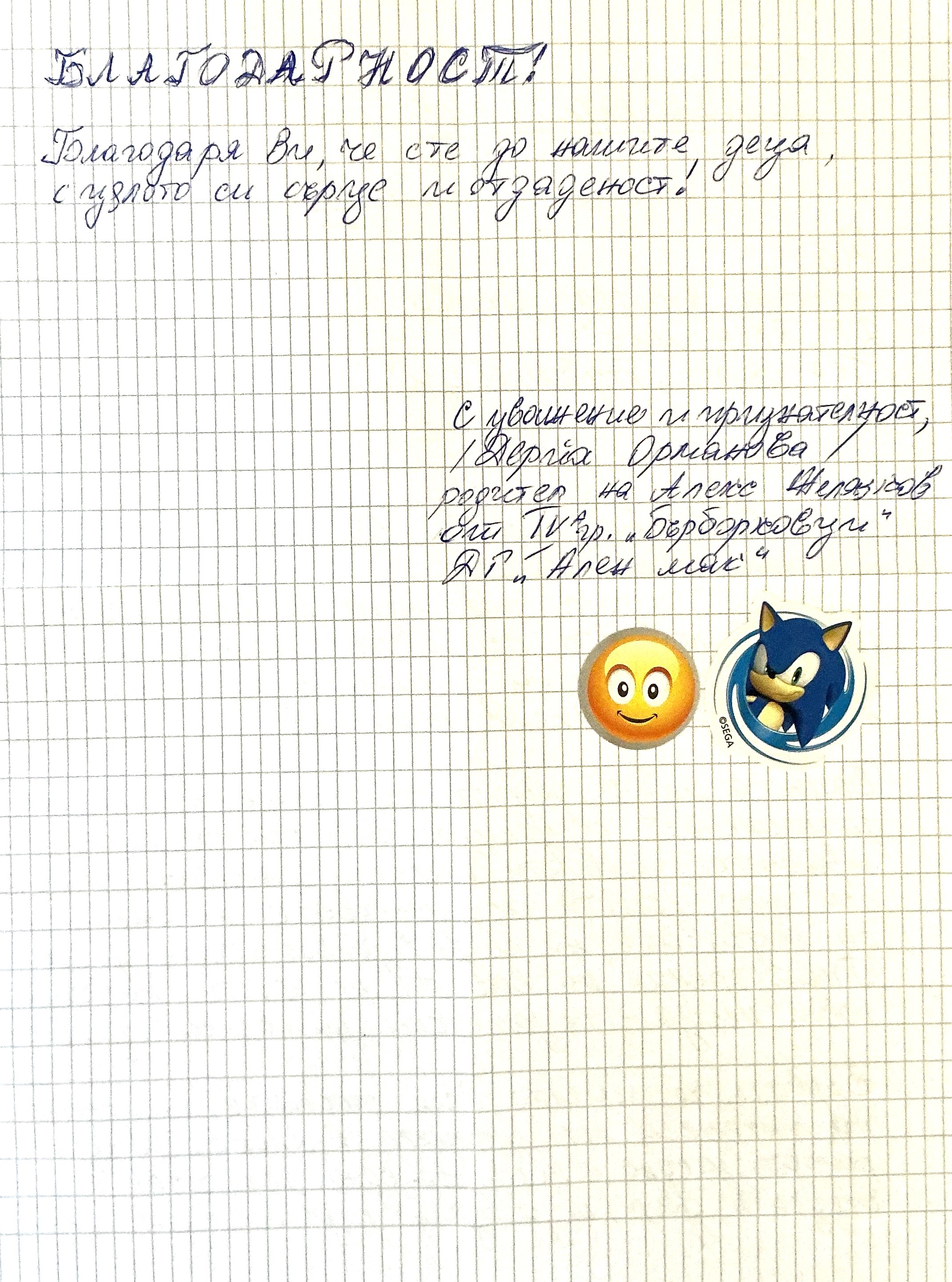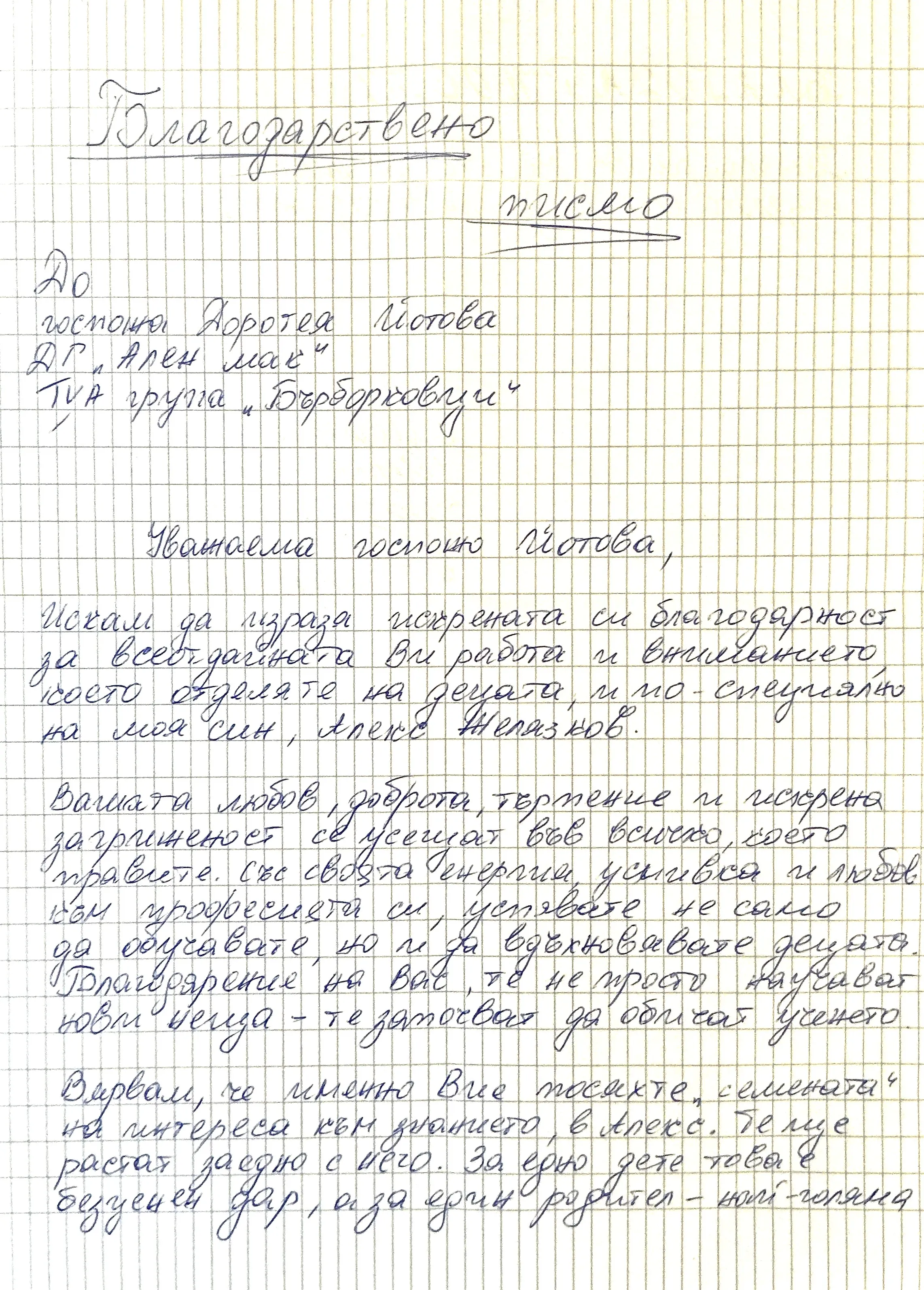 3. Благодарствено писмо към IV А група "Бърборковци"