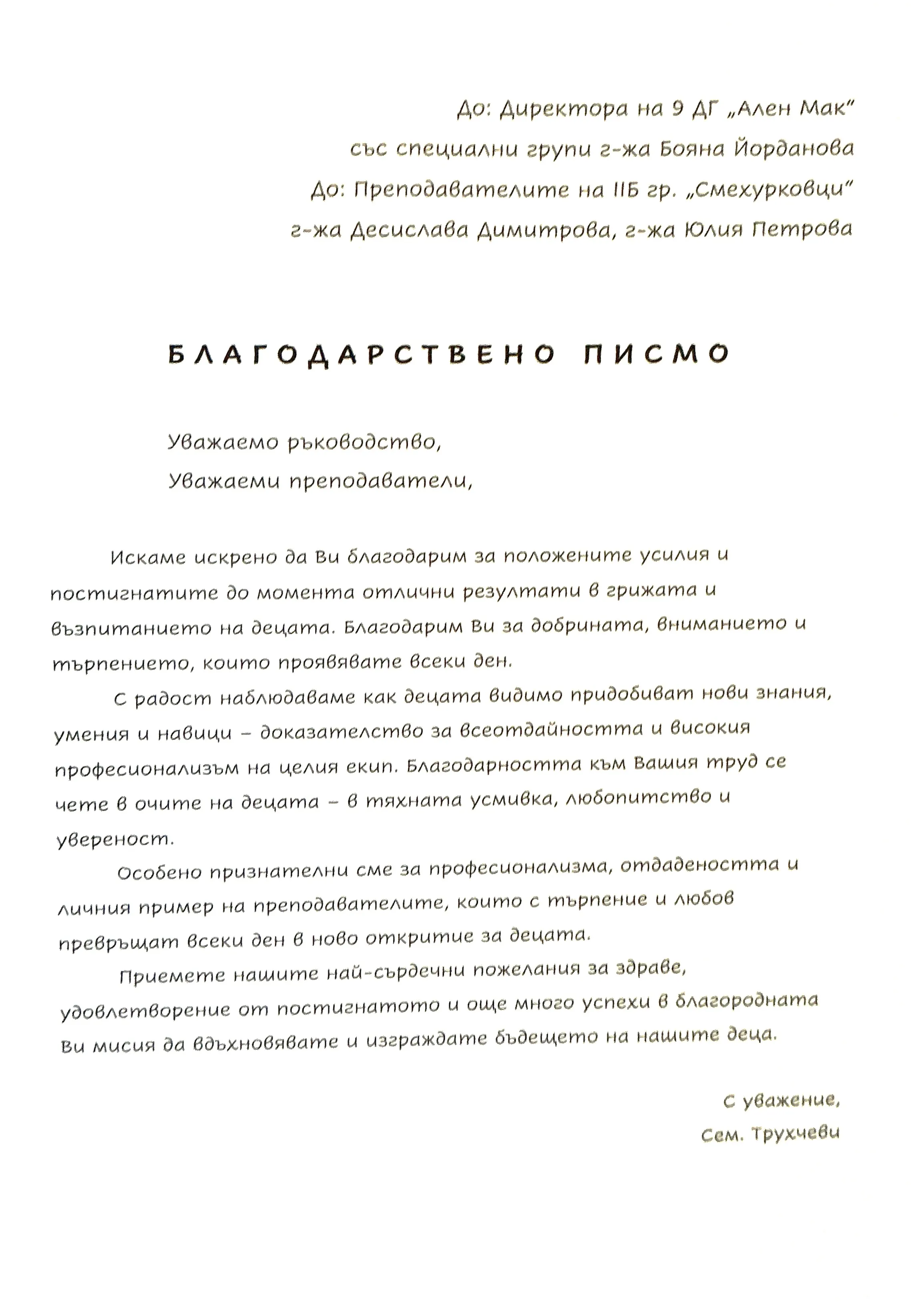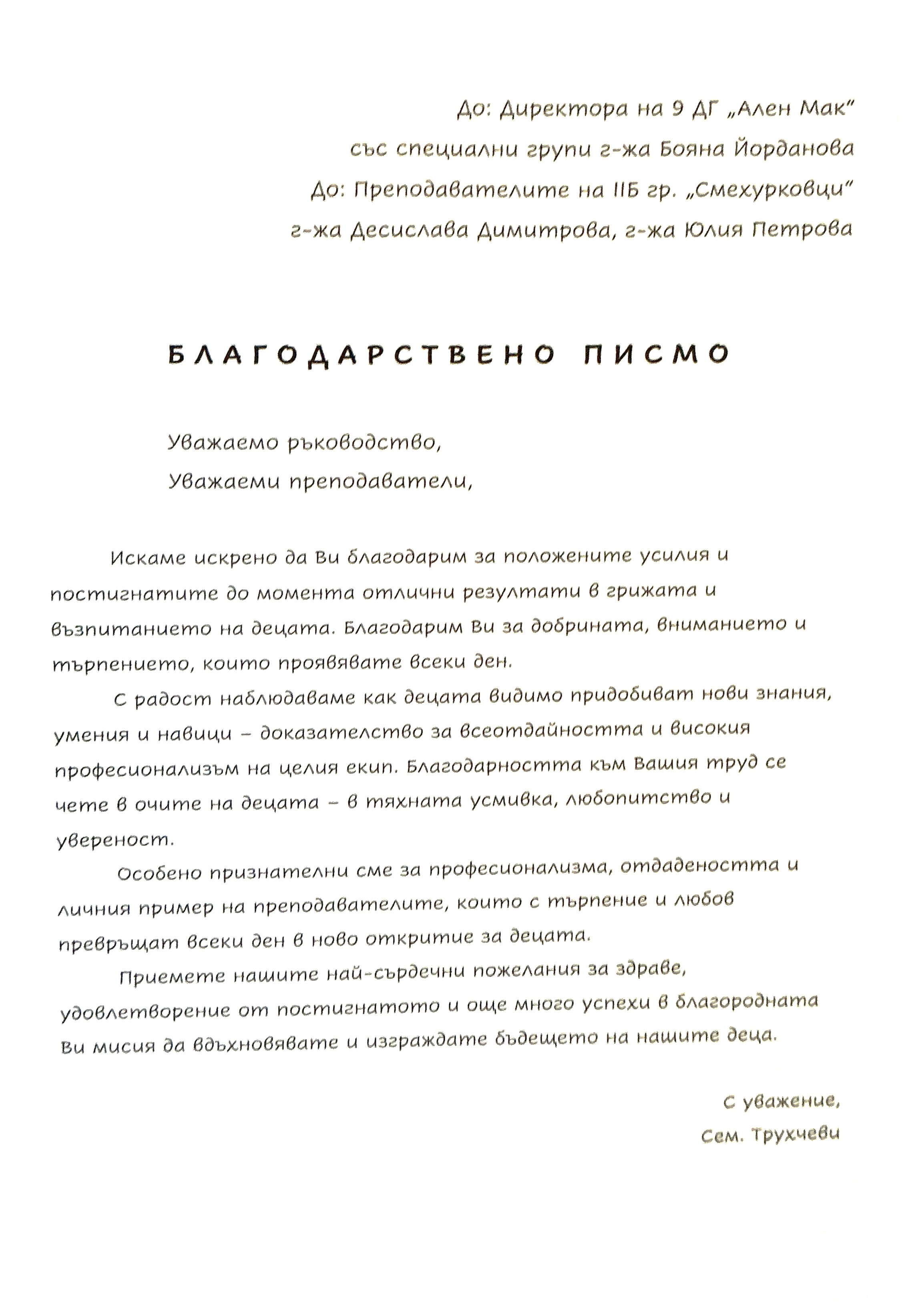 Благодарствено писмо към педагогическия екип на II Б група "Смехурковци"
