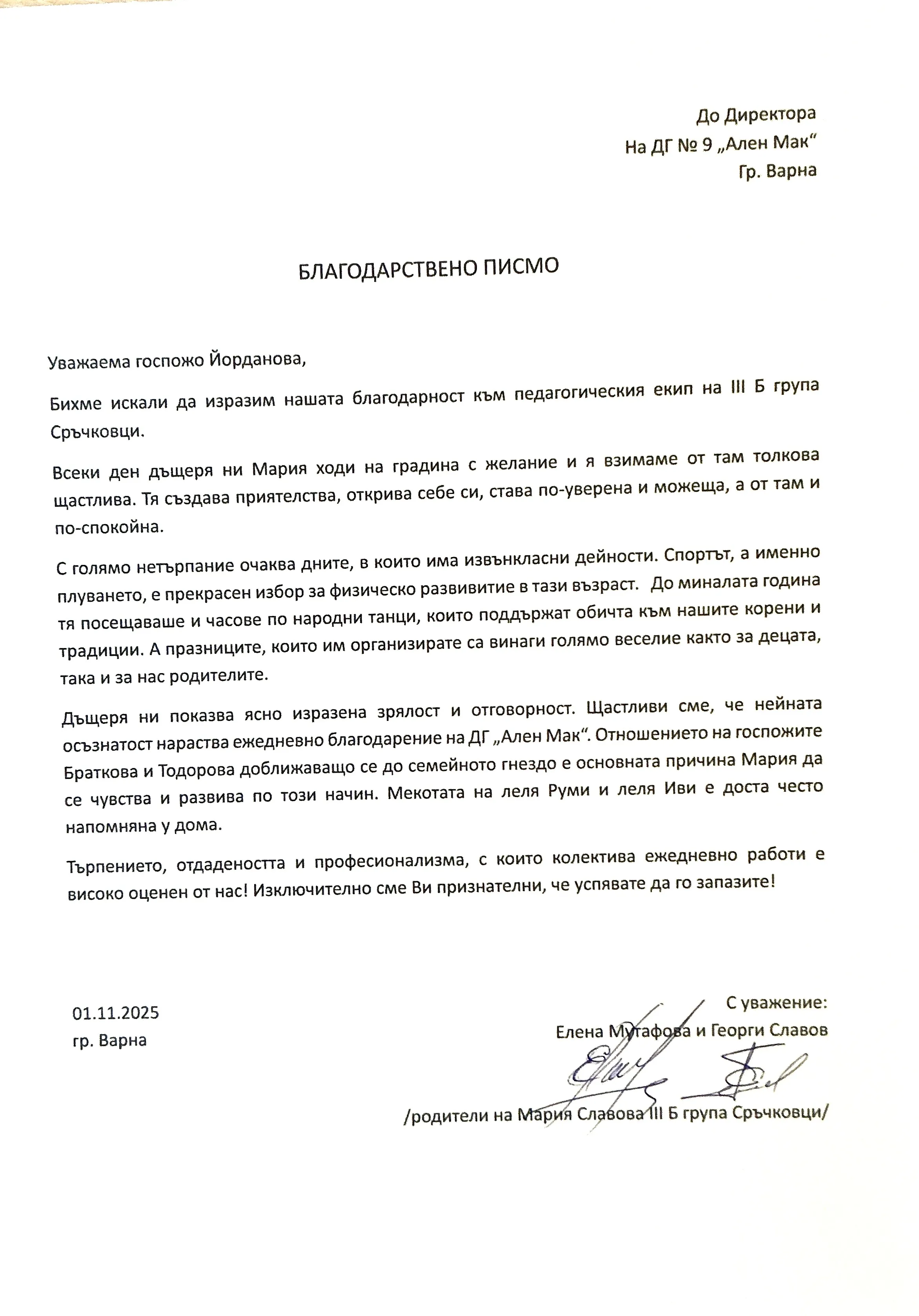 Благодарствено писмо към педагогическия екип на III Б група "Сръчковци"