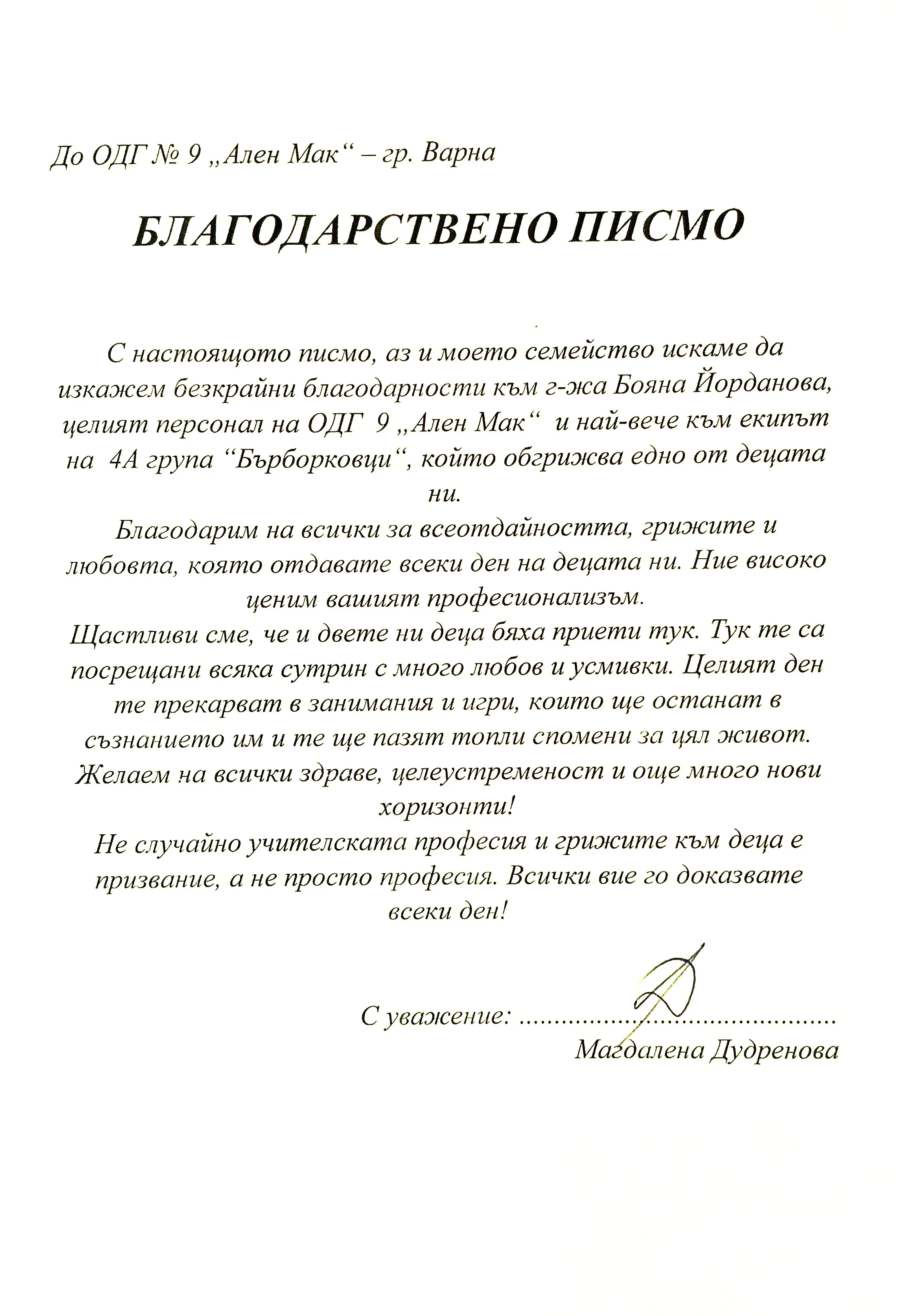 Благодарствено писмо към педагогическия екип на IV А група "Бърборковци"