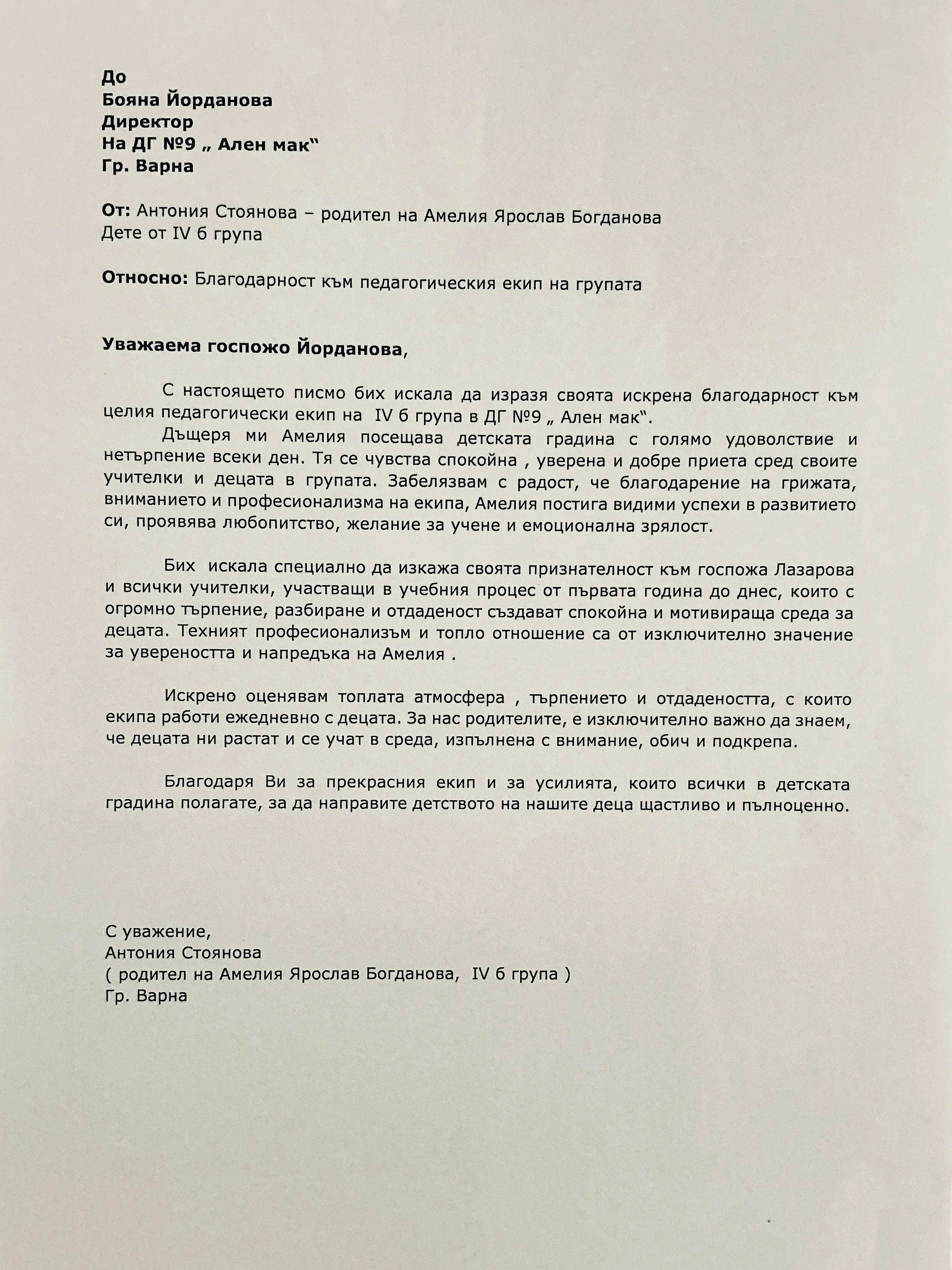 Благодарствено писмо към педагогическия екип на IV Б група "Сладури"