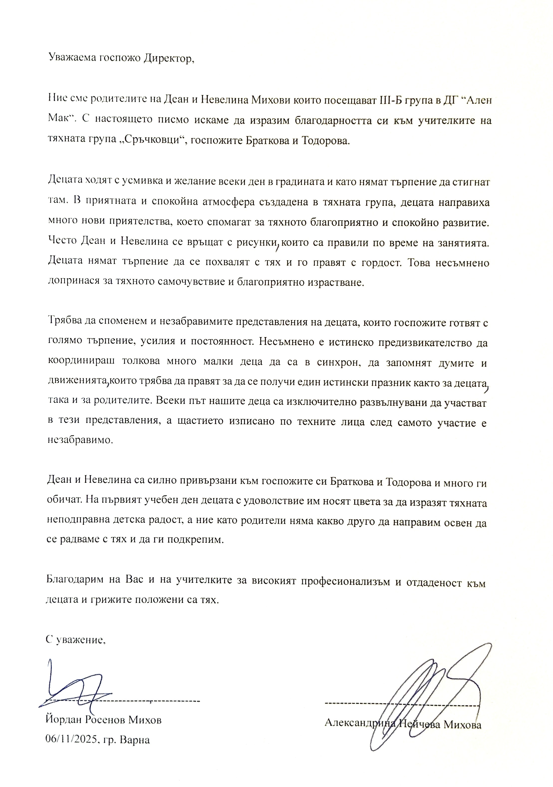 3. Благодарствено писмо към учителките на група "Сръчковци"