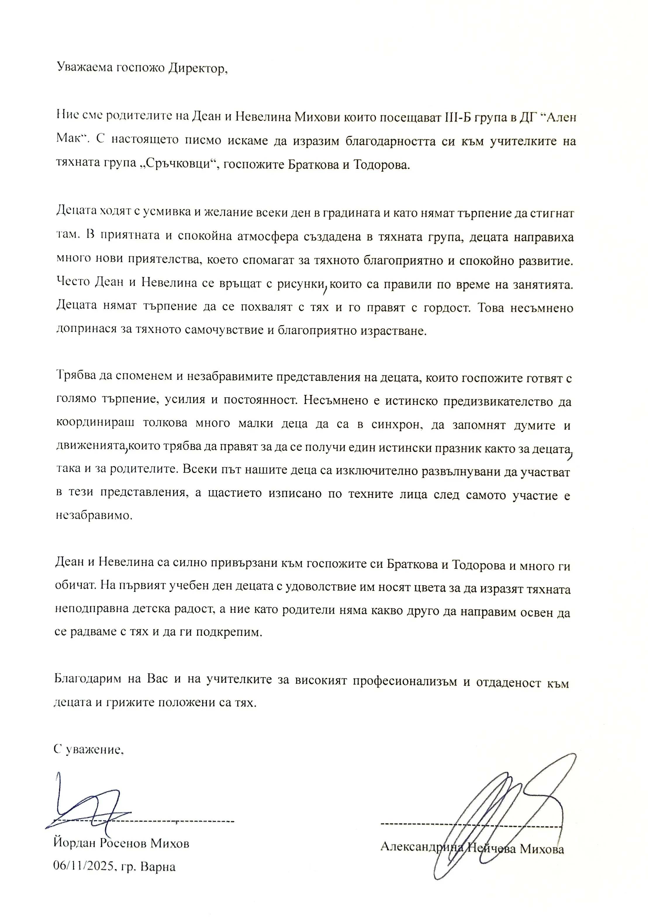 Благодарствено писмо към учителките на група "Сръчковци"