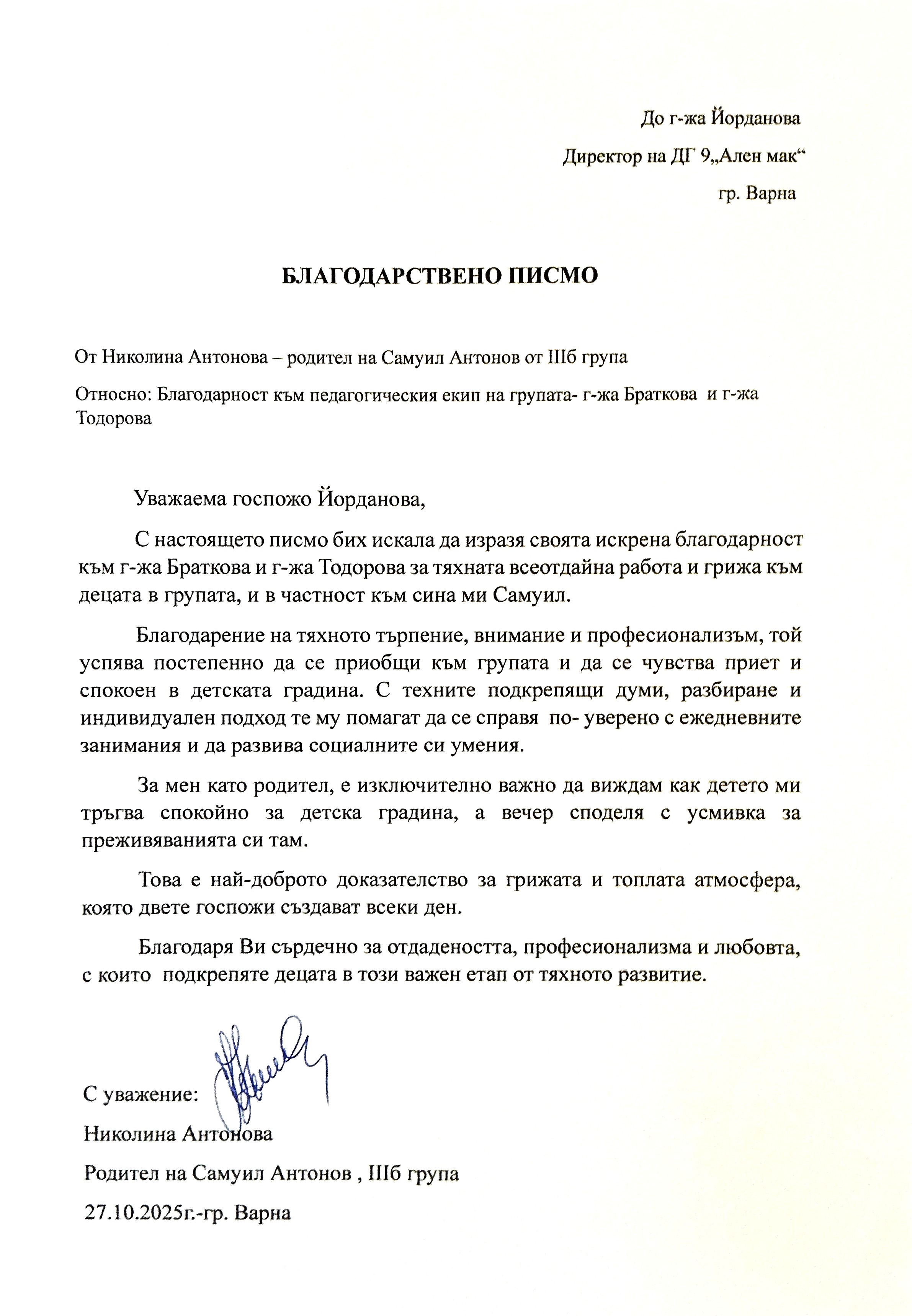 3. Благодарствено писмо от Николина Антонова- родител от група "Сръчковци"