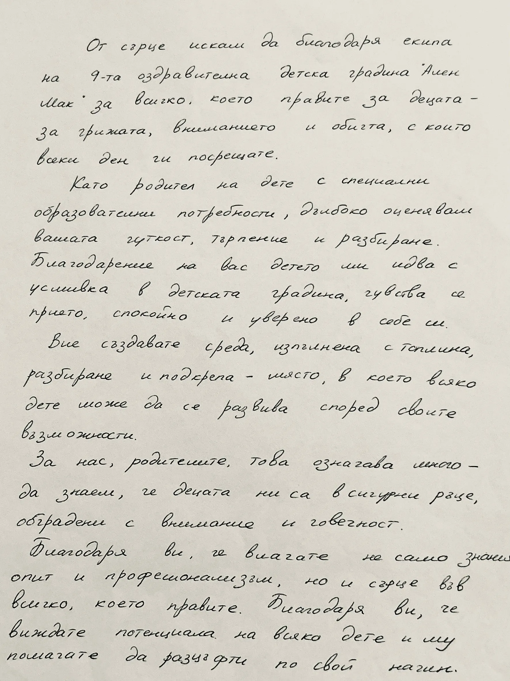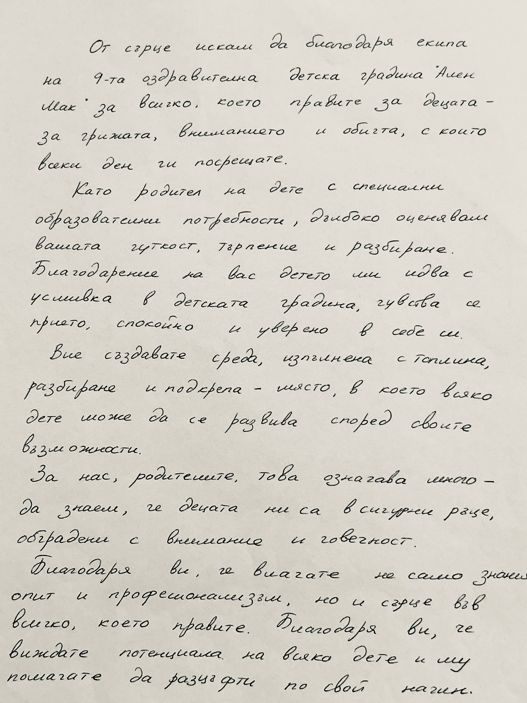 Благодарствено писмо от родител на дете със специални образователни потребности