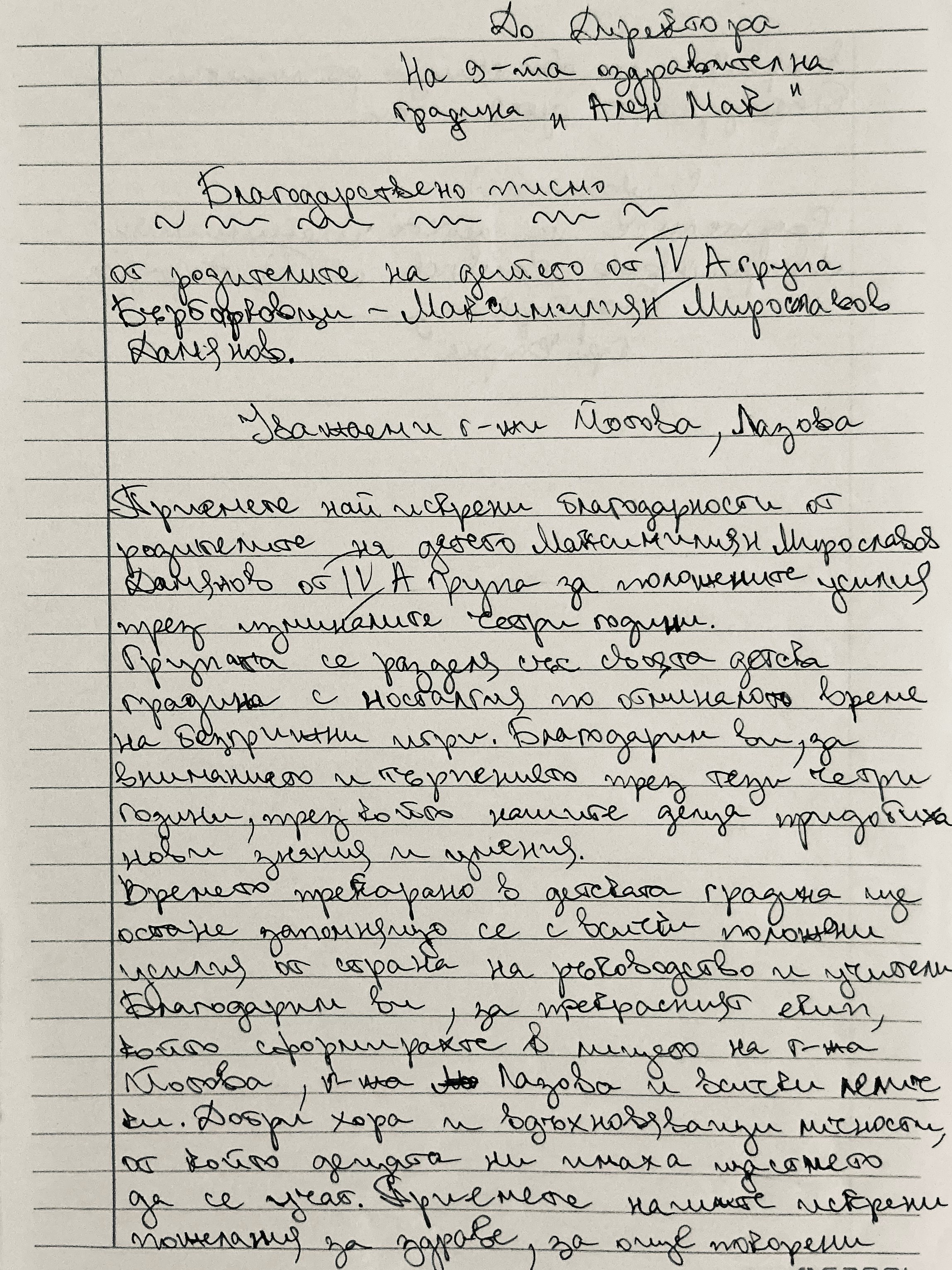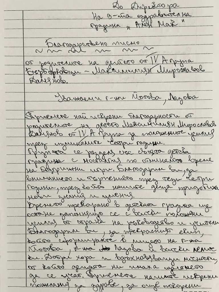 Благодарствено писмо от родители на дете от IV A група