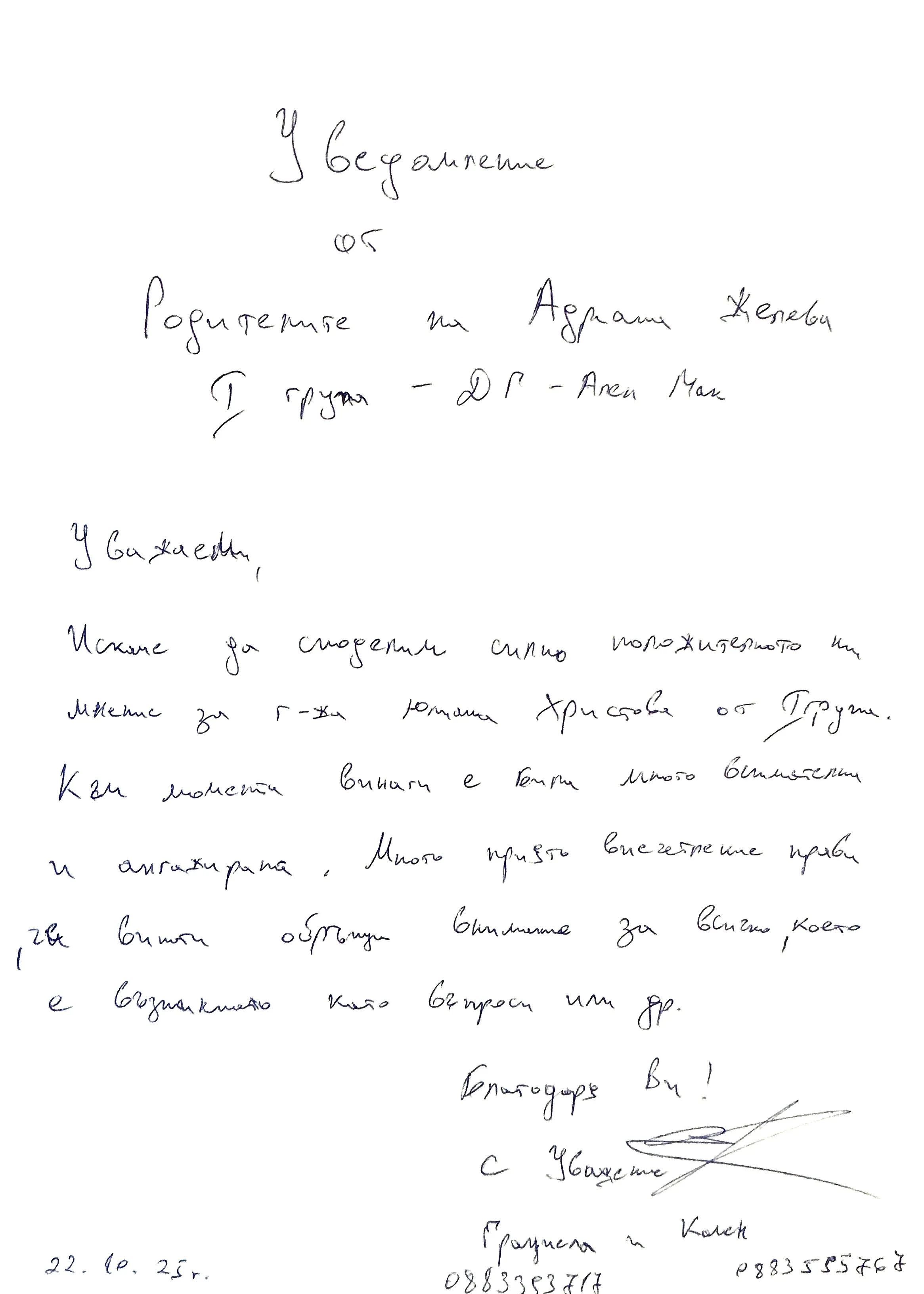 Благодарствено писмо от родителите на Адриана Желева - I група "Слънчовци"