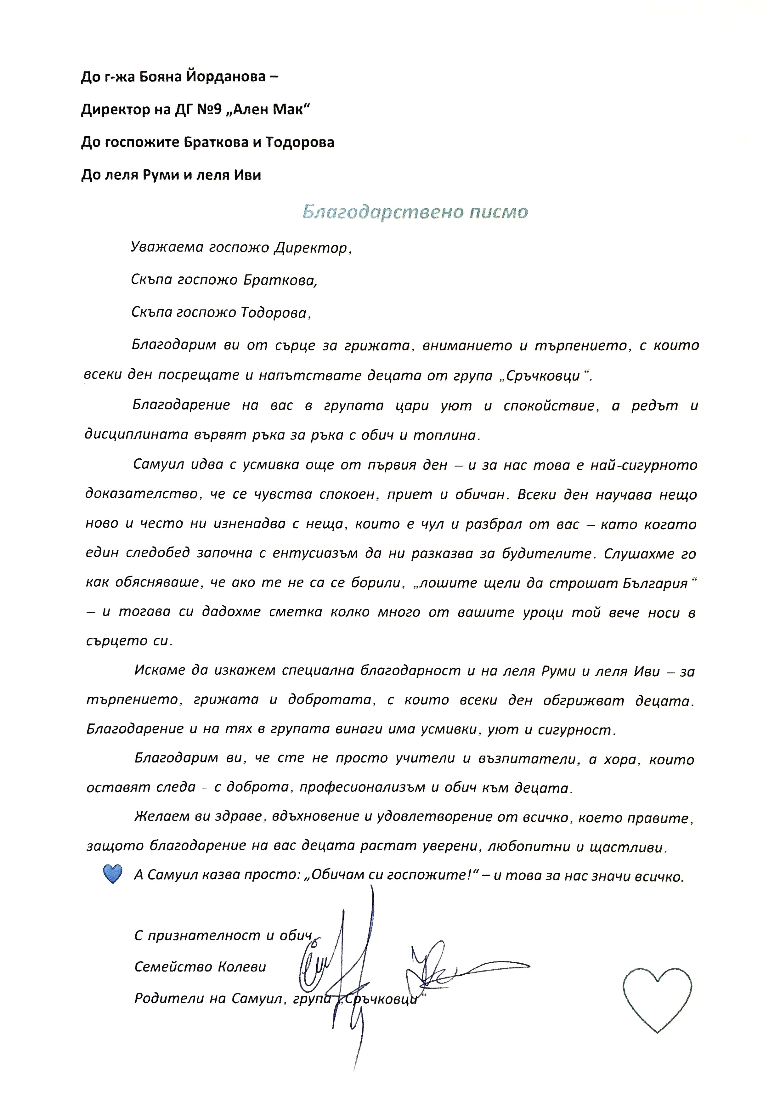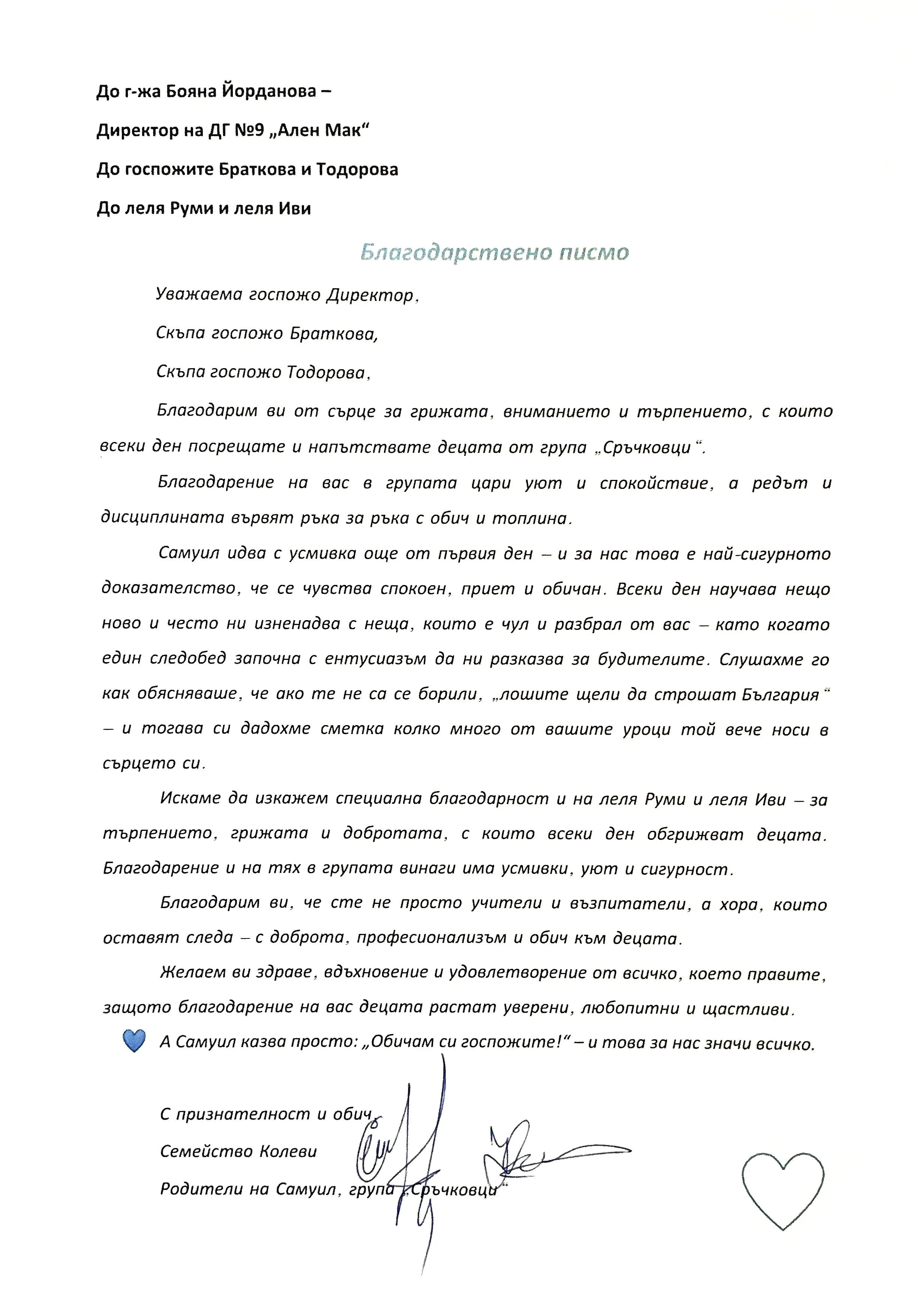 3. Благодарствено писмо от семейство Колеви- родители от III Б група "Сръчковци"