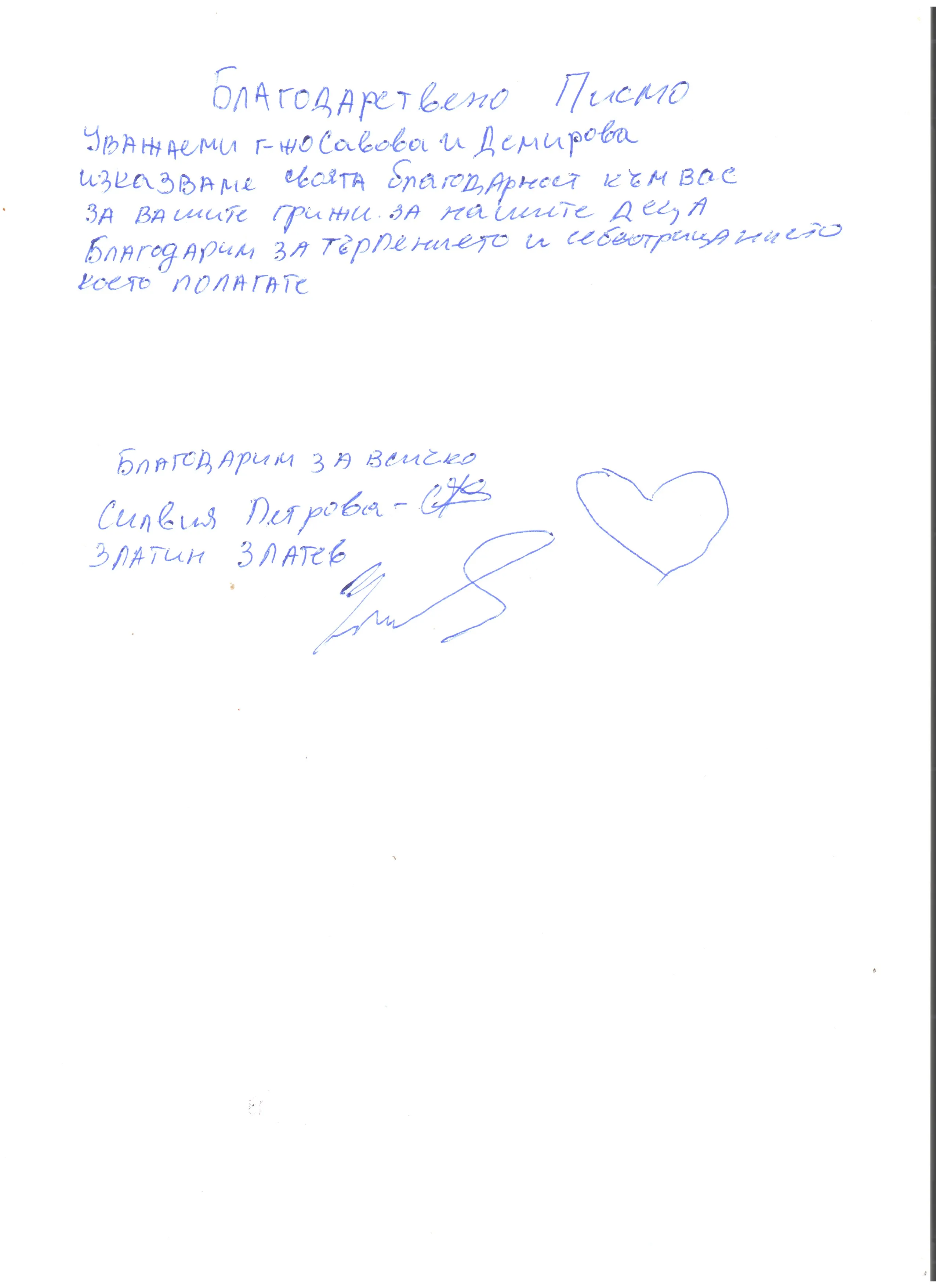 Благодарствено писмо от Силвия Петрова- майка на дете от група "Ягодки Б"