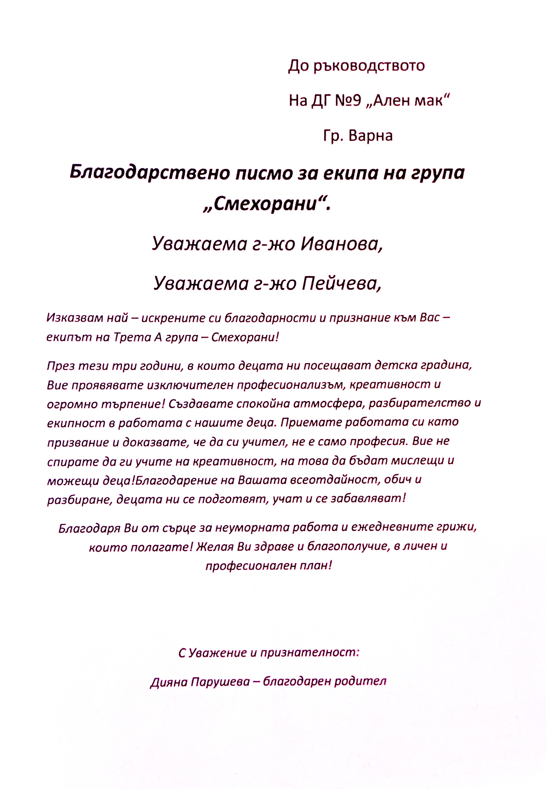 3. Благодарствено писмо за екипа на група "Смехорани"
