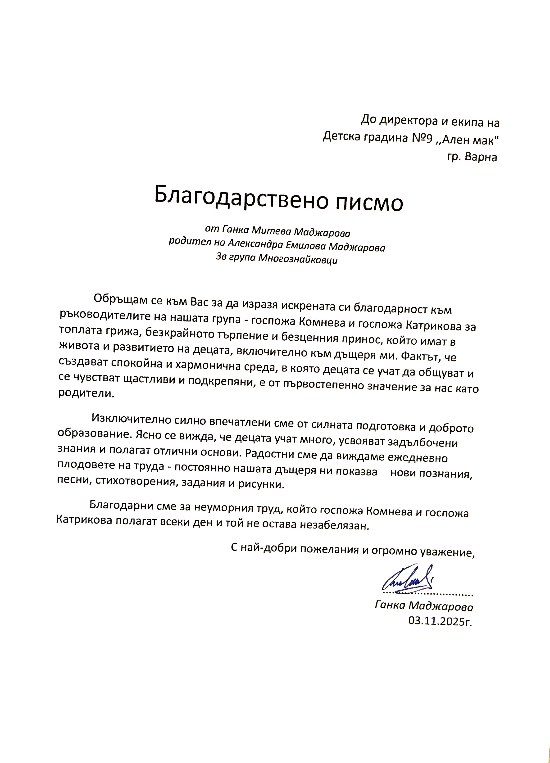 3. Благодарствено писмо за група "Многознайковци"