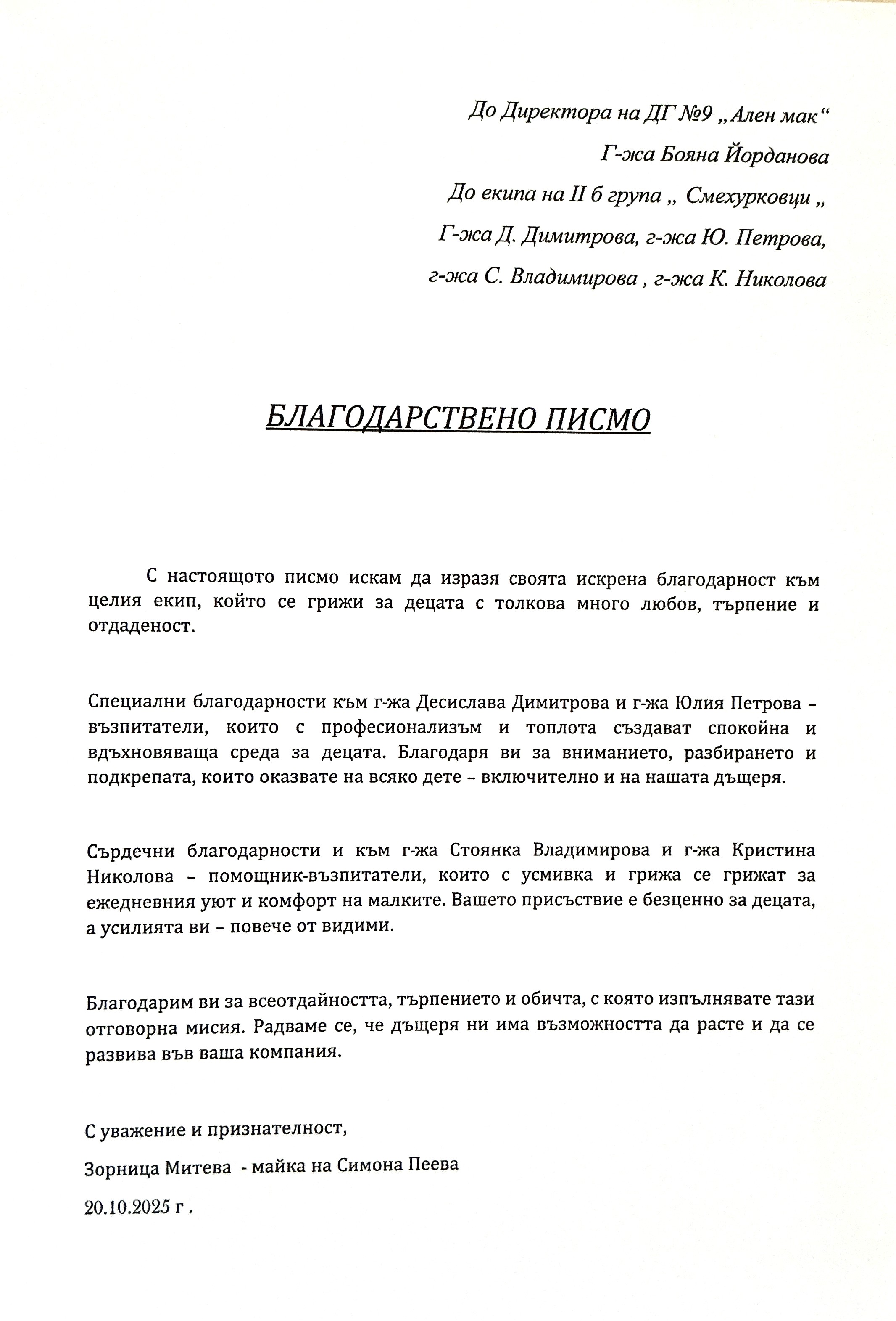 3. Благодарствено писмо за II Б група "Смехурковци"