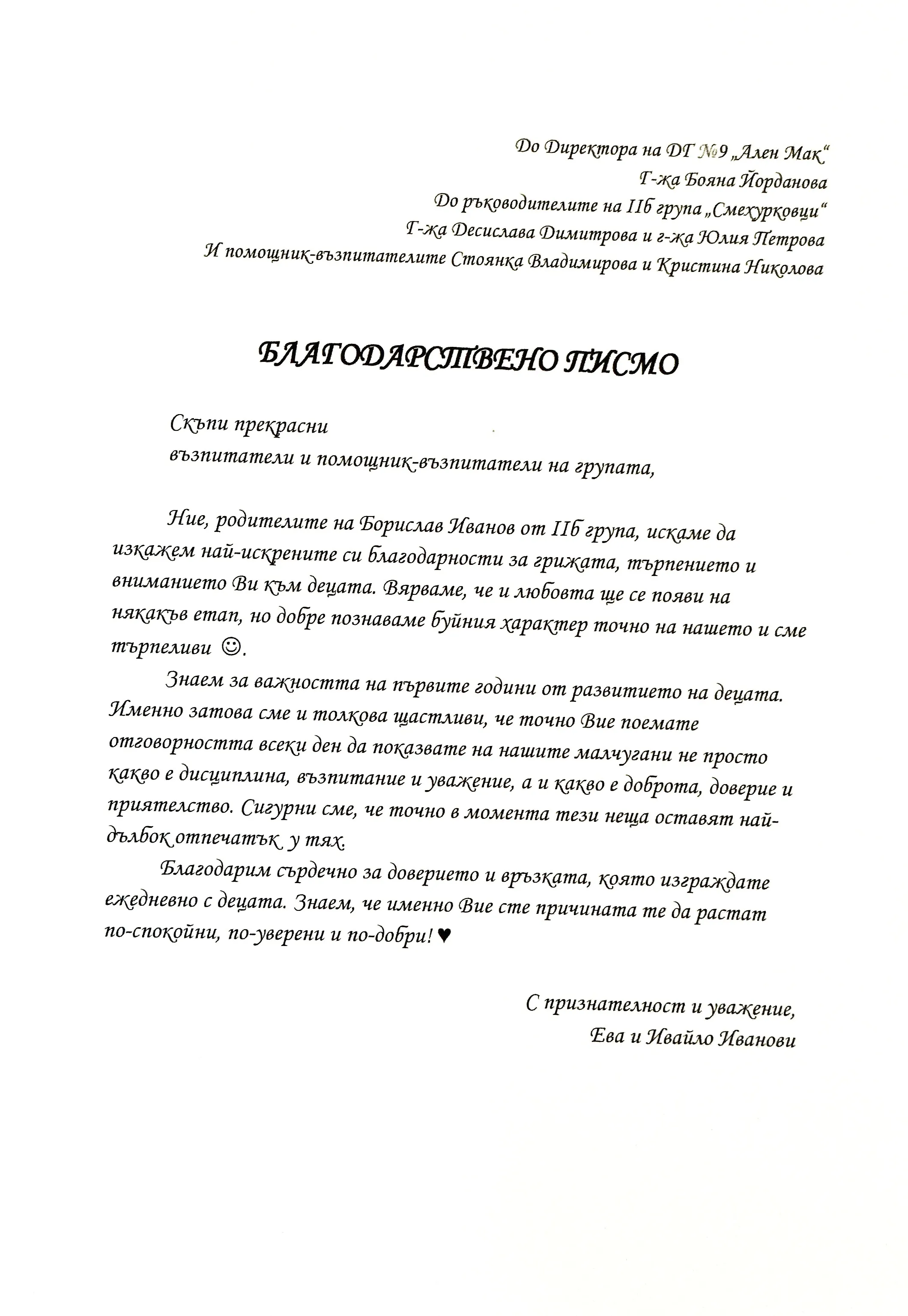 Благодарствено писмо за II Б група
