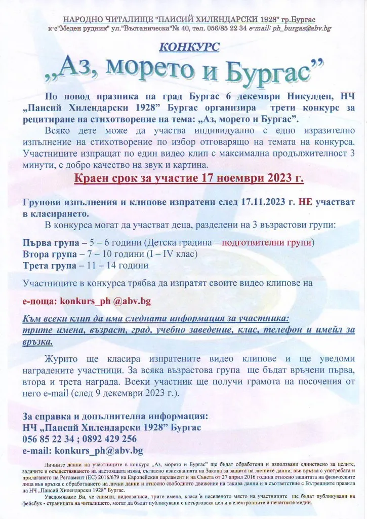 НЧ „Паисий Хилендарски 1928” – Бургас организира V-ти конкурс за рецитиране на стихотворение на тема: