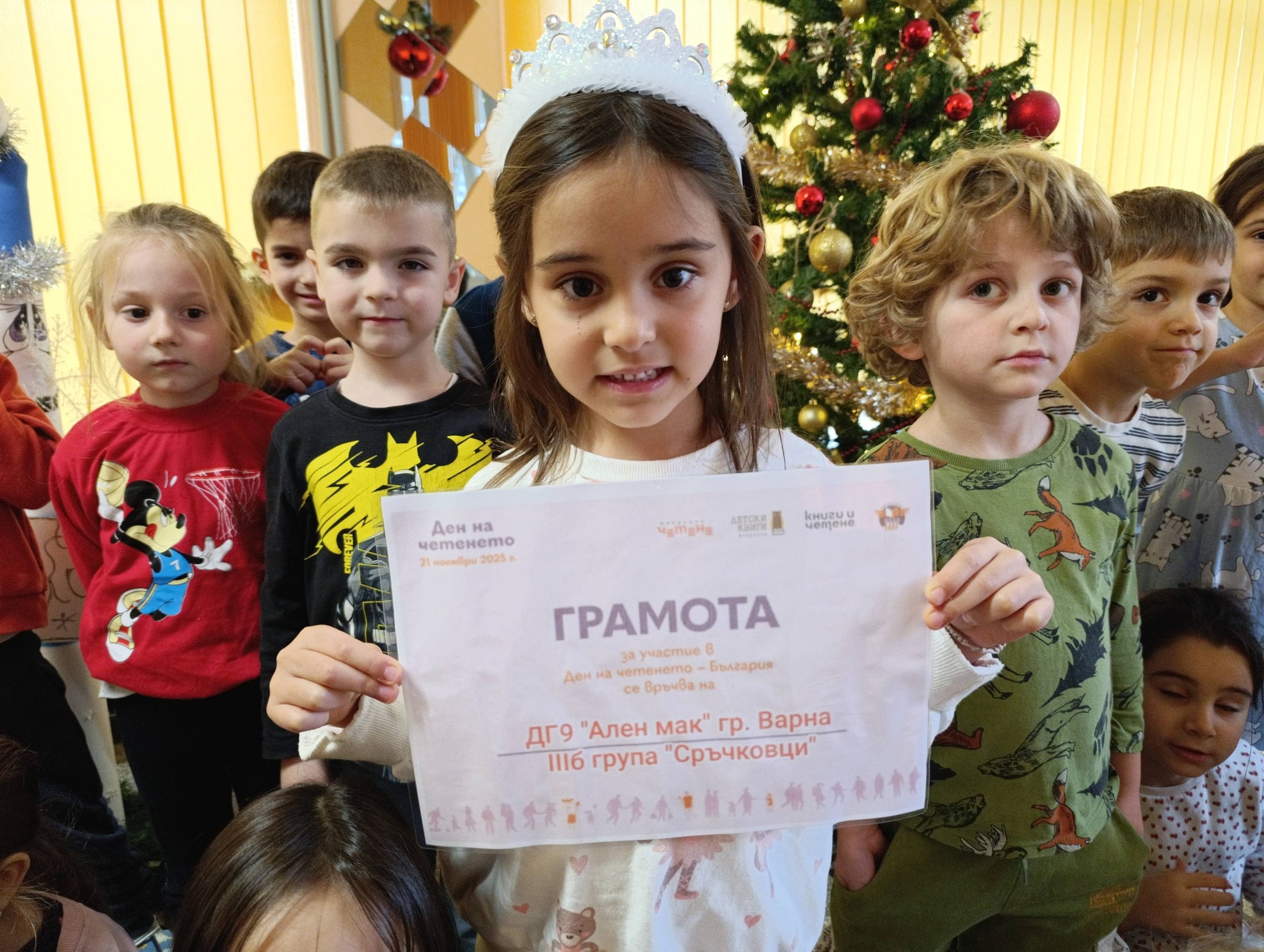 Грамота за децата от III б група “Сръчковци” с учители Даниела Тодорова и Румяна Браткова, които с над десет разнообразни дейности представиха ДГ “Ален мак” на Националния ден на четенето!
