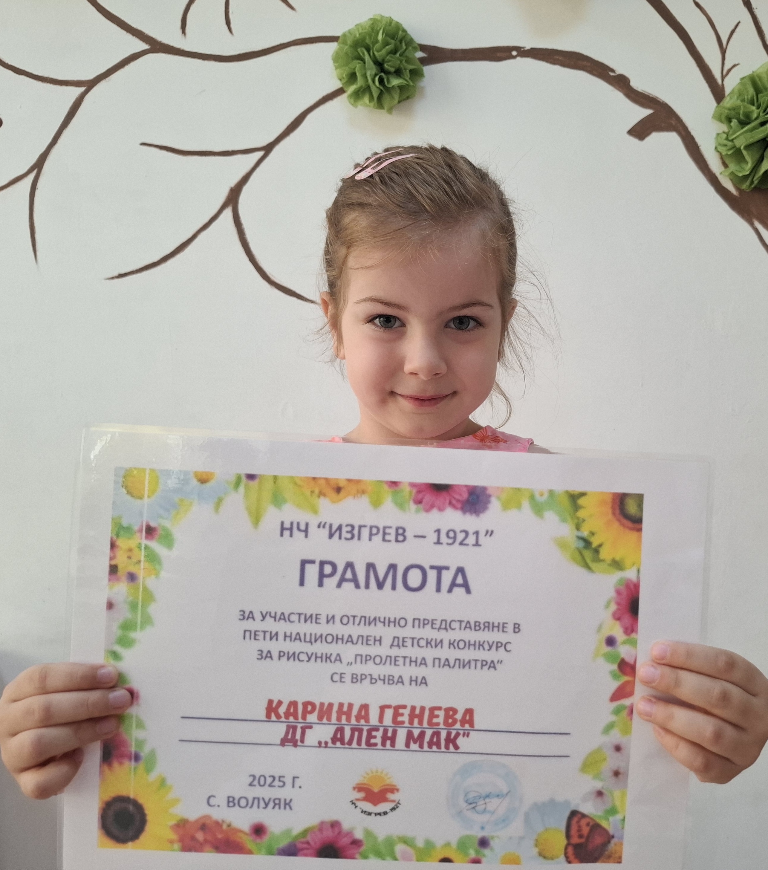 Теа Ганчева и Карина Генева получиха грамоти за отлично представяне в пети национален детски конкурс за рисунка “Пролетна палитра” 2025 г. село Волуяк
