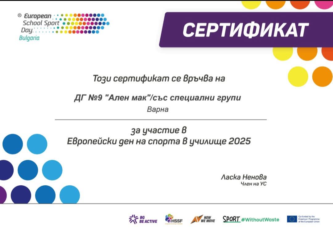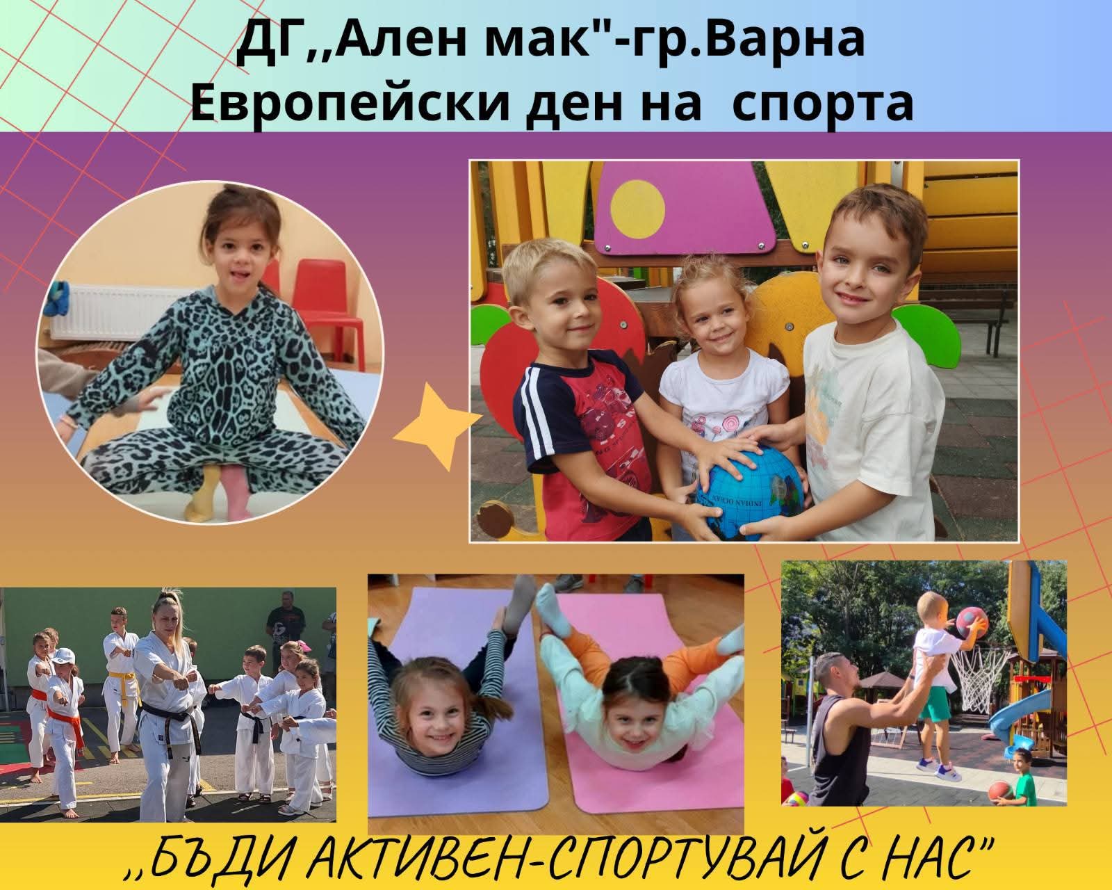 Под мотото „Бъди активен!” се включихме в отбелязването на Европейския ден на спорта /26 септември/. Сред всички участвали детски градини от страната ние сме класирани на ПЪРВО място за най-успешно планиране, разнообразие в дейностите и цялостно провеждане. Европейския ден на спорта е част от стремежа да възпитаваме у децата любов към движението, грижа за тялото и емоционална свързаност с околните. Здравето започва от детството – с игри, смях и спорт!