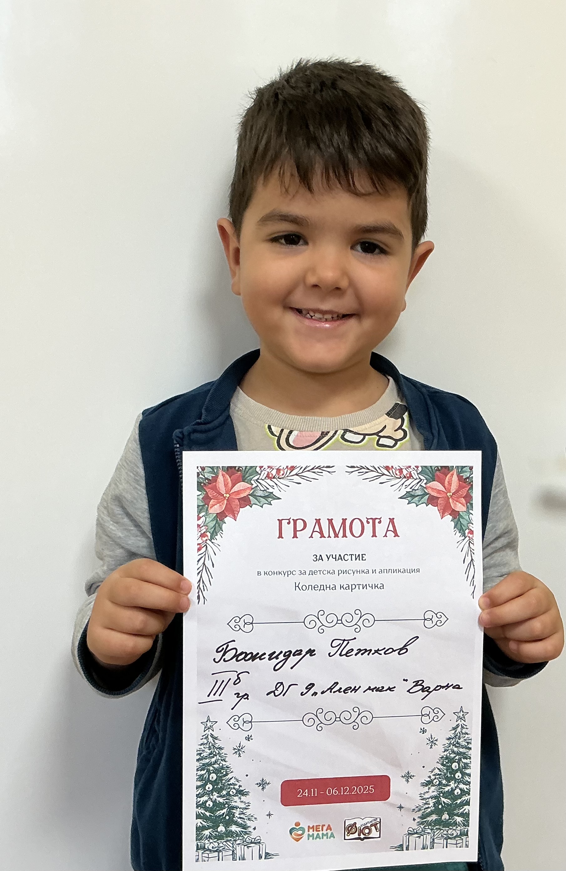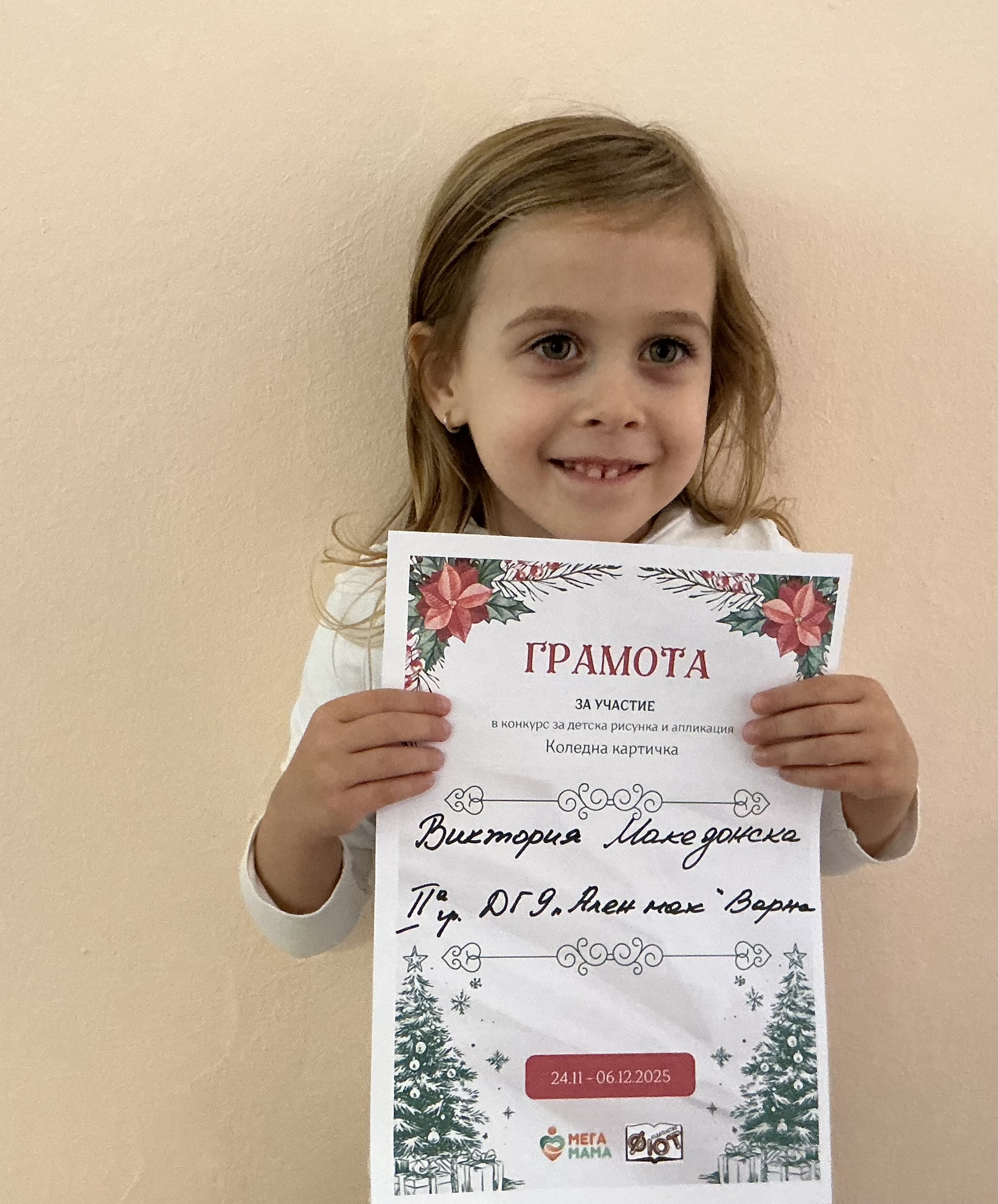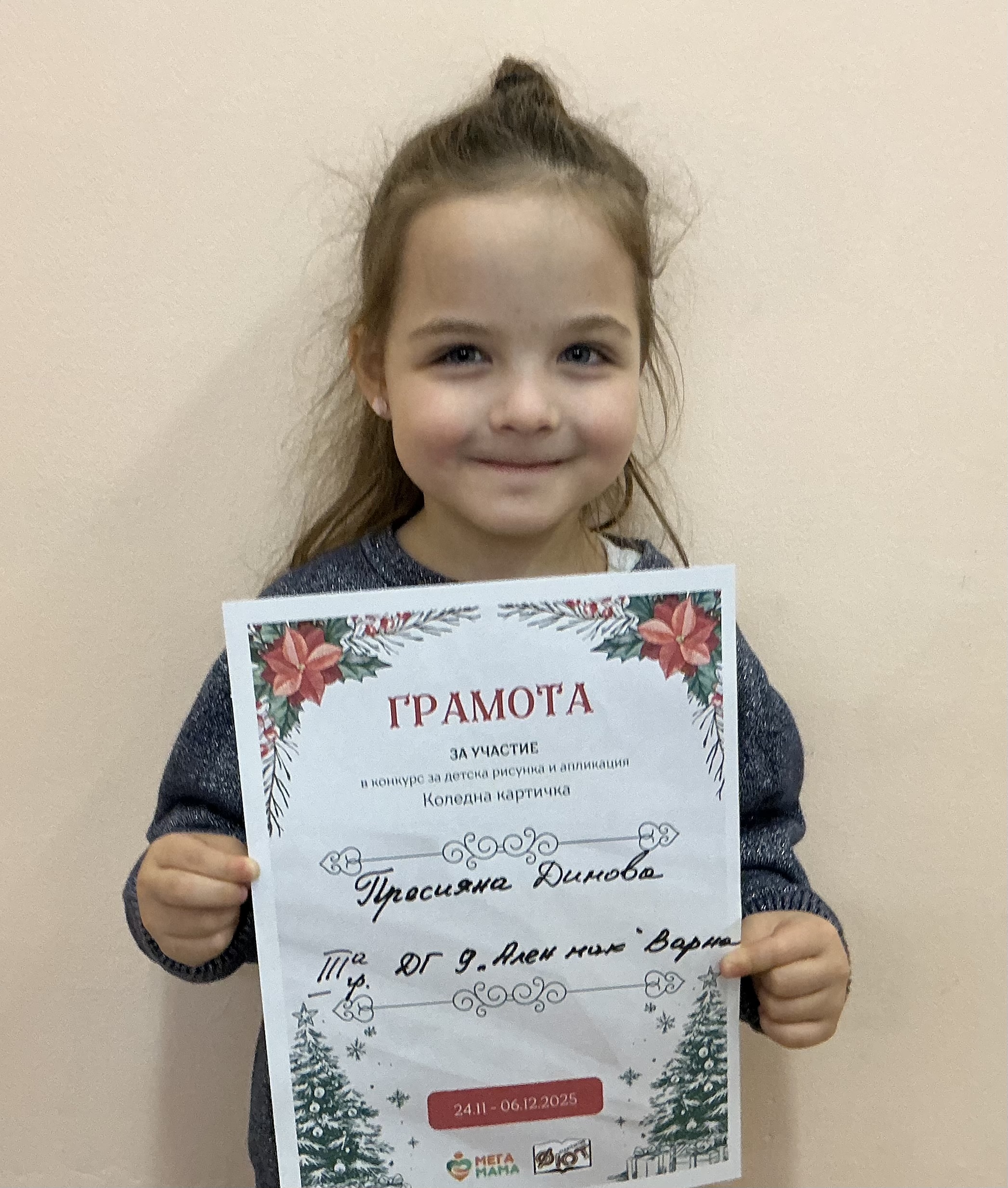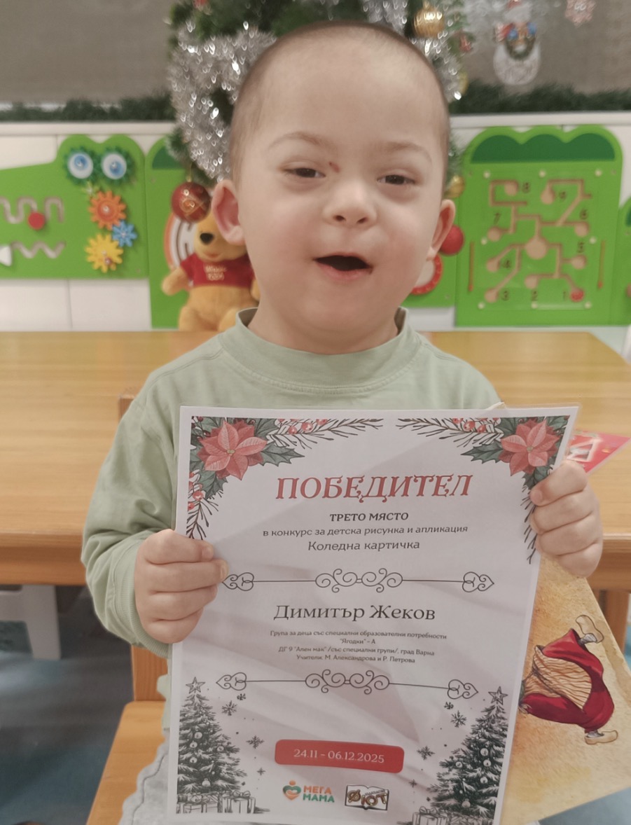 Деца от детска градина “Ален мак” взеха участие в конкурс Мега МАМА и издателство Фют за “Коледна картичка”. Всички деца участвали в конкурса получиха грамота за участие