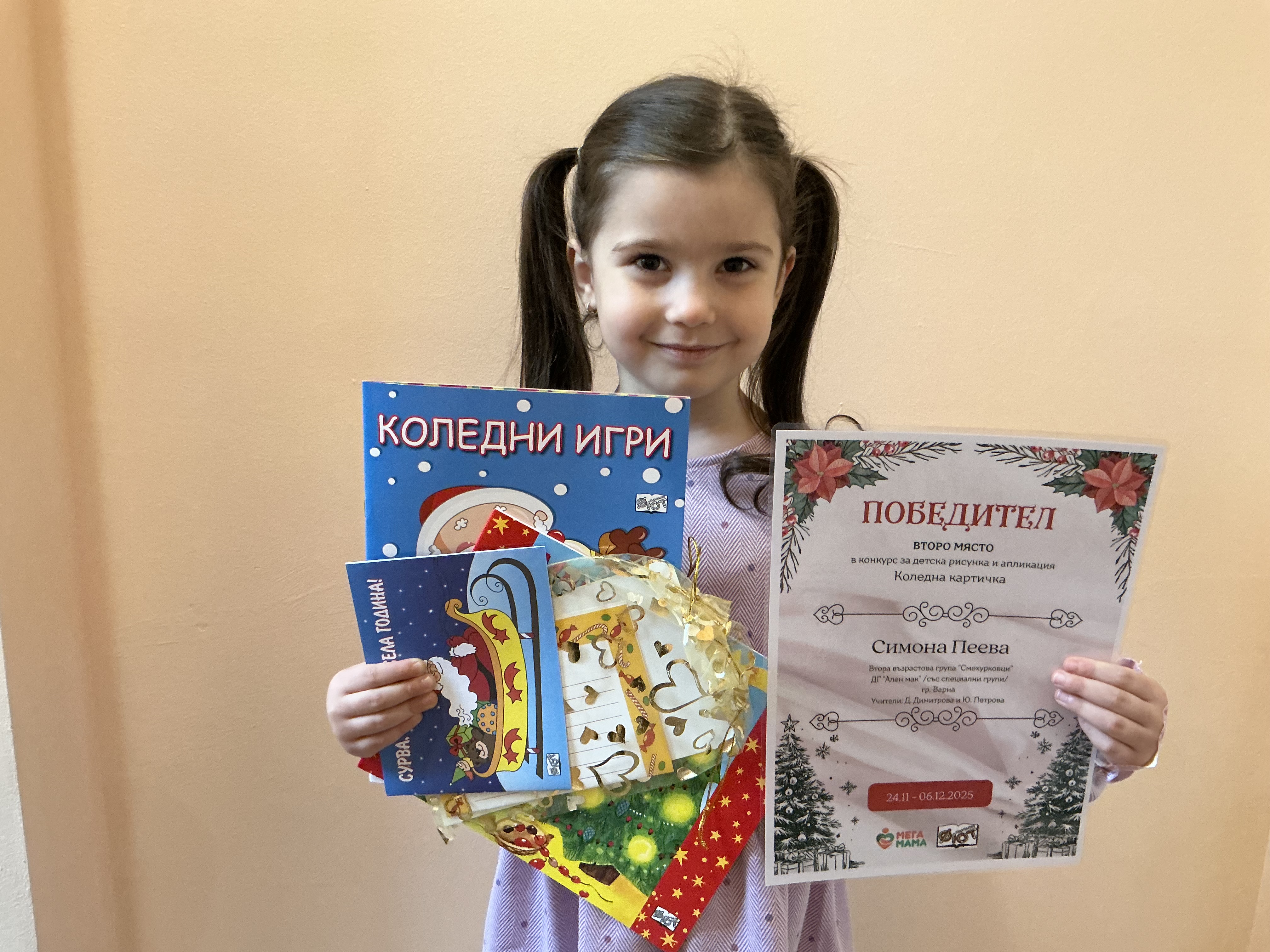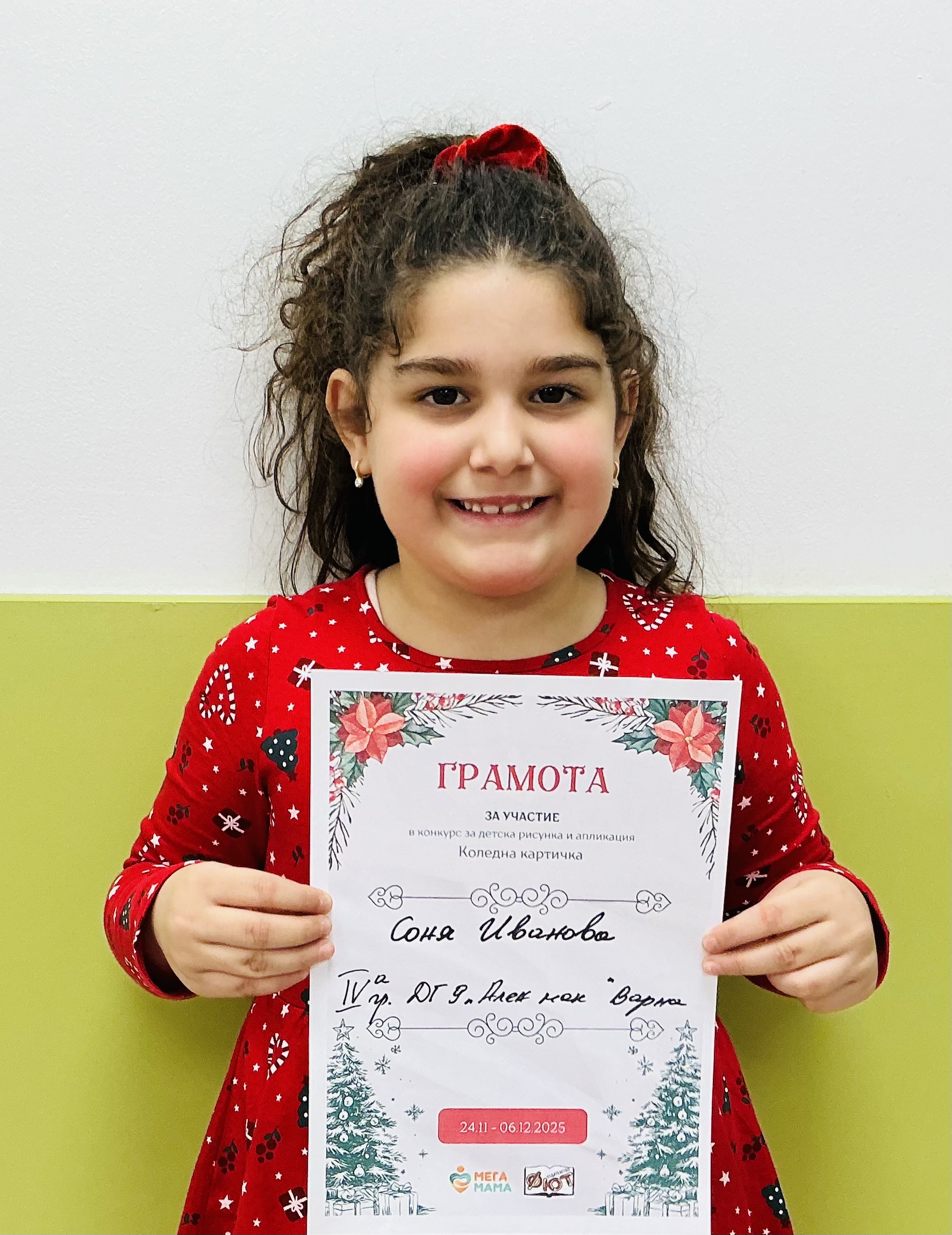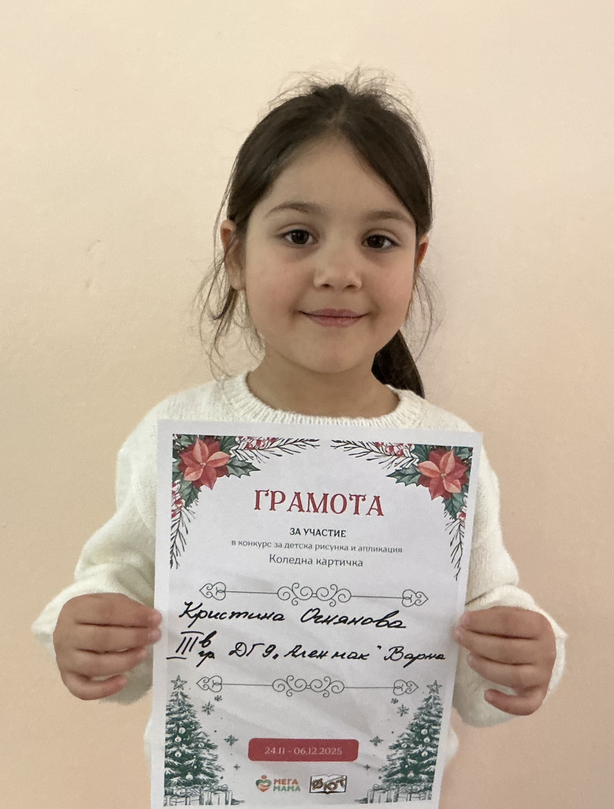 Деца от детска градина “Ален мак” взеха участие в конкурс Мега МАМА и издателство Фют за “Коледна картичка”. Всички деца участвали в конкурса получиха грамота за участие