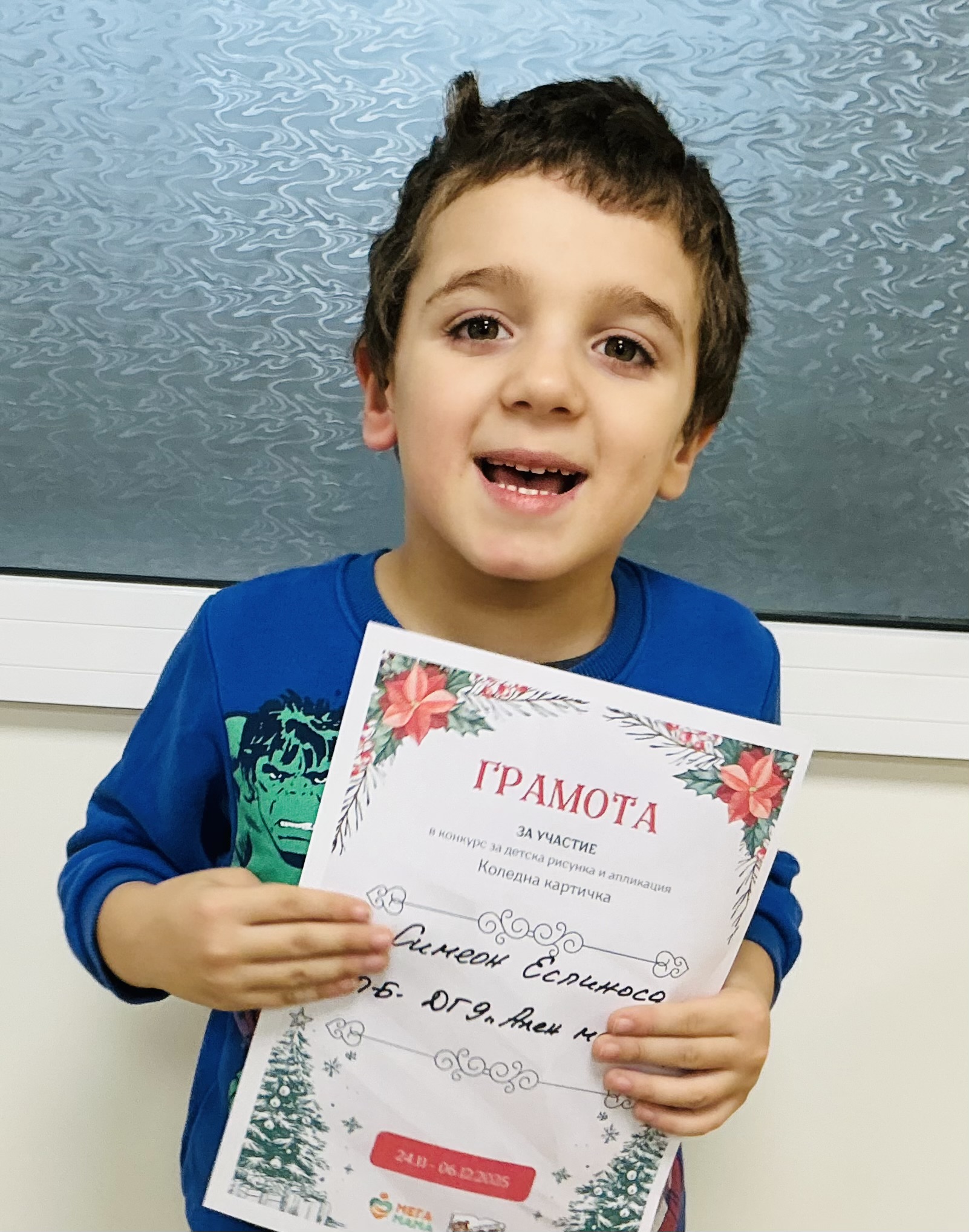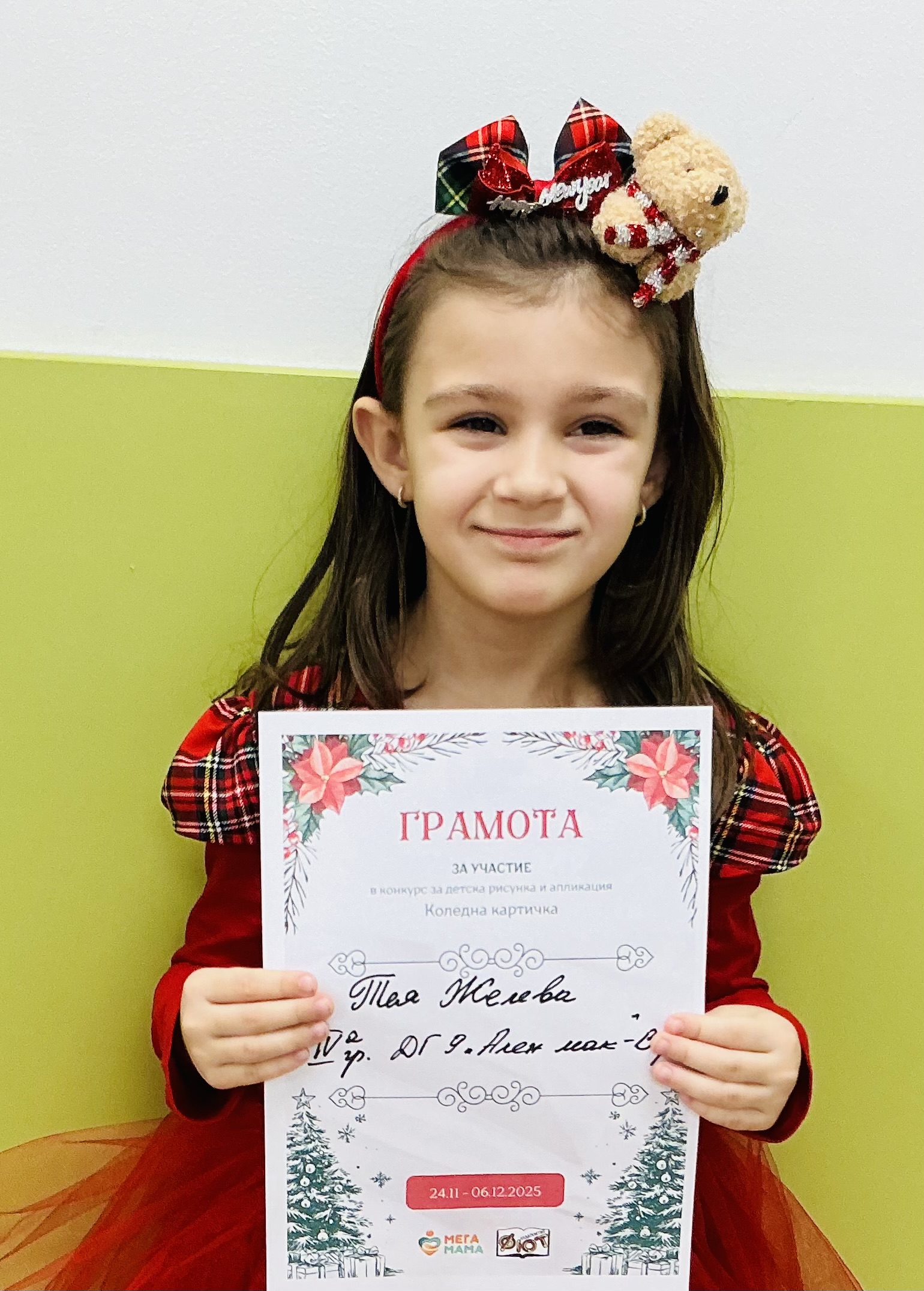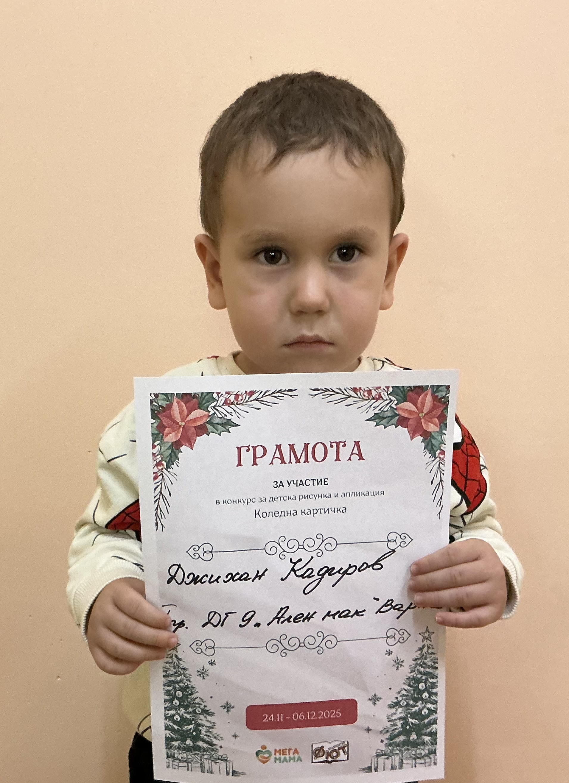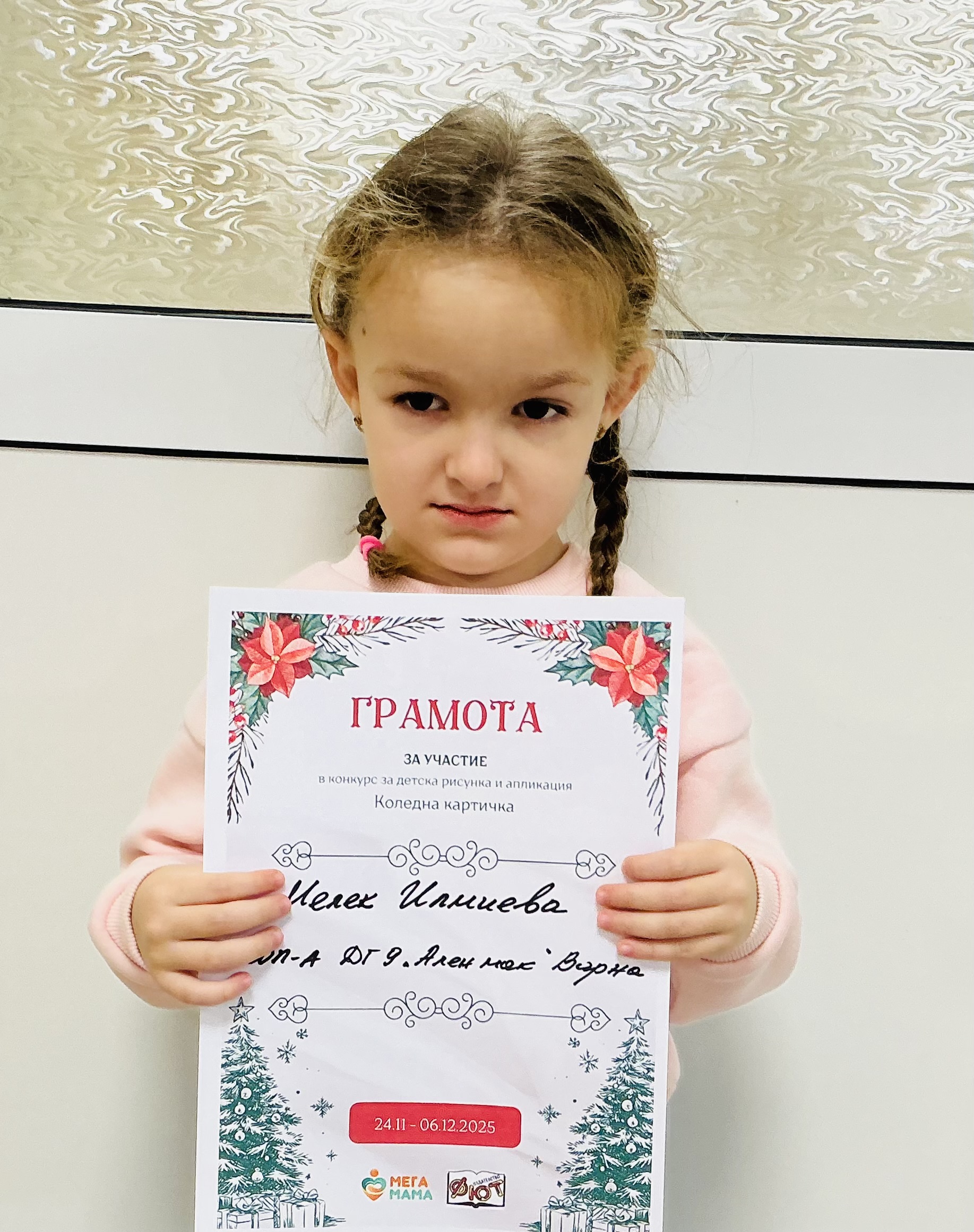 Деца от детска градина “Ален мак” взеха участие в конкурс Мега МАМА и издателство Фют за “Коледна картичка”. Всички деца участвали в конкурса получиха грамота за участие