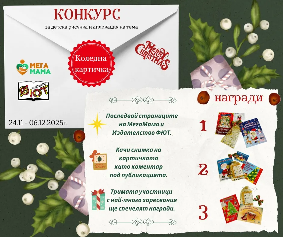 Конкурсът за детска рисунка се организира от Мега Мама на територията на Република България. Официален партньор на конкурса е Издателство “Фют”. Конкурсът е отворен за участие от 24.11- 06.12.2025 година. Край на конкурса 06.12.2025 година 10:00 часа