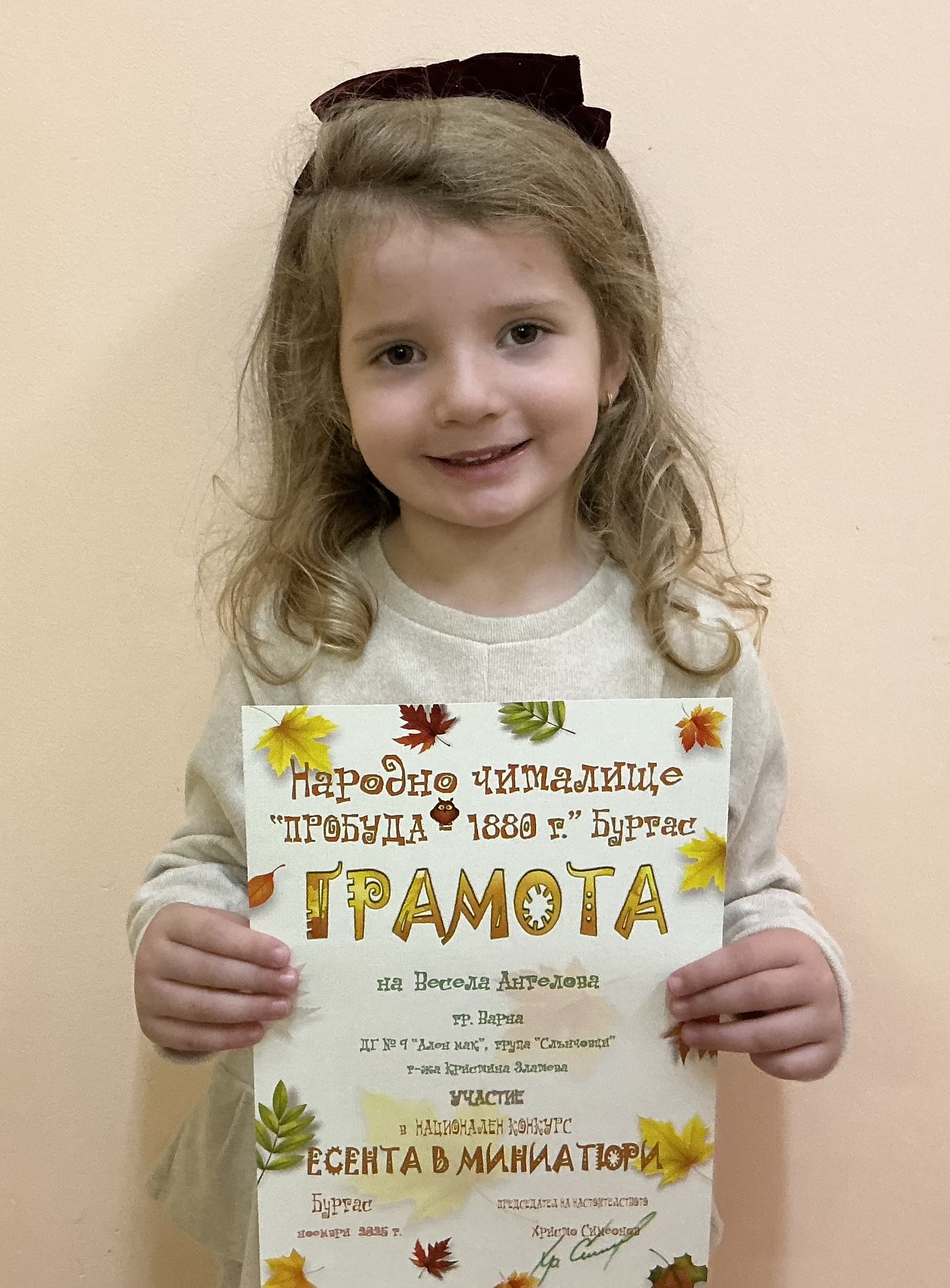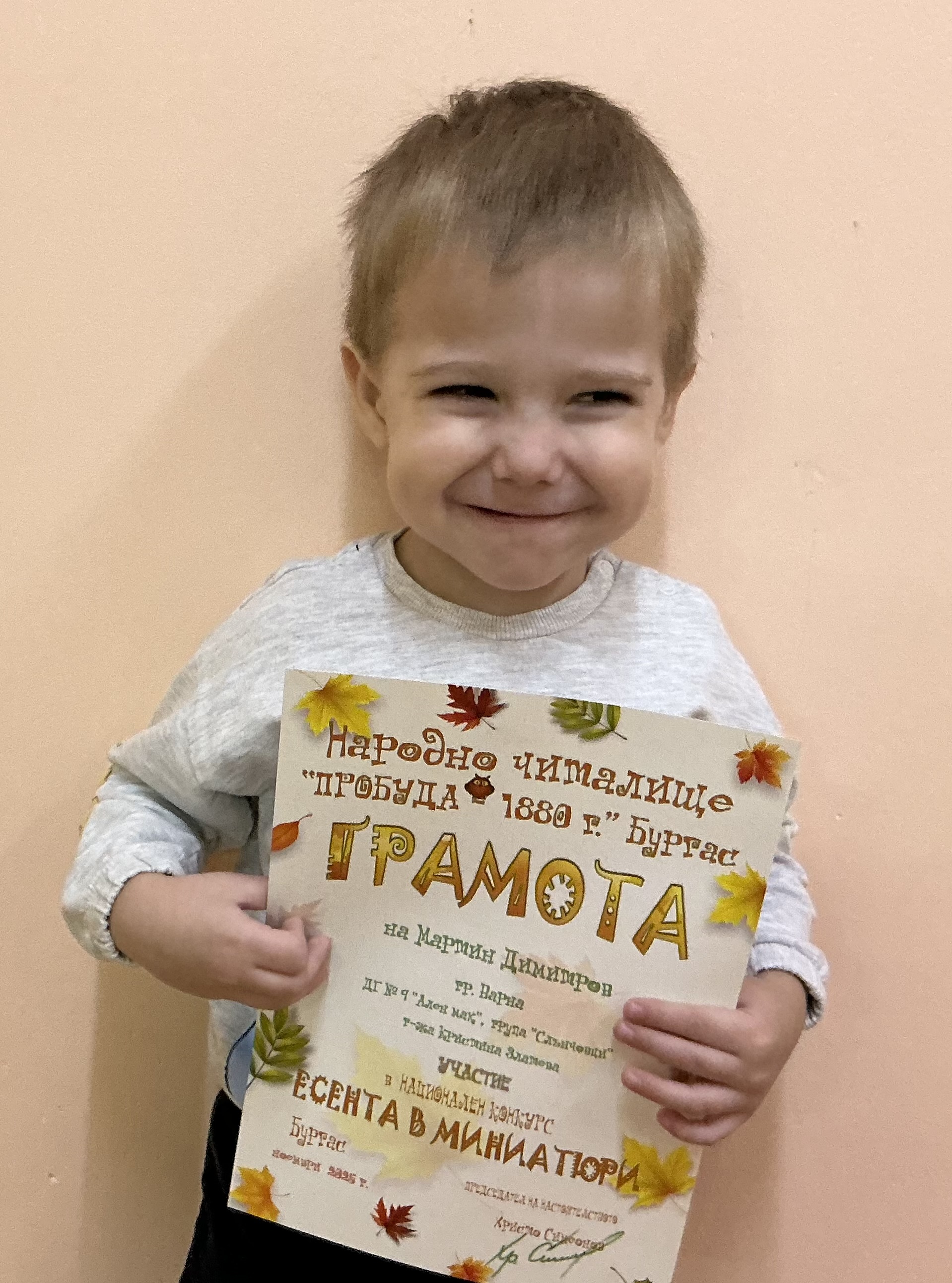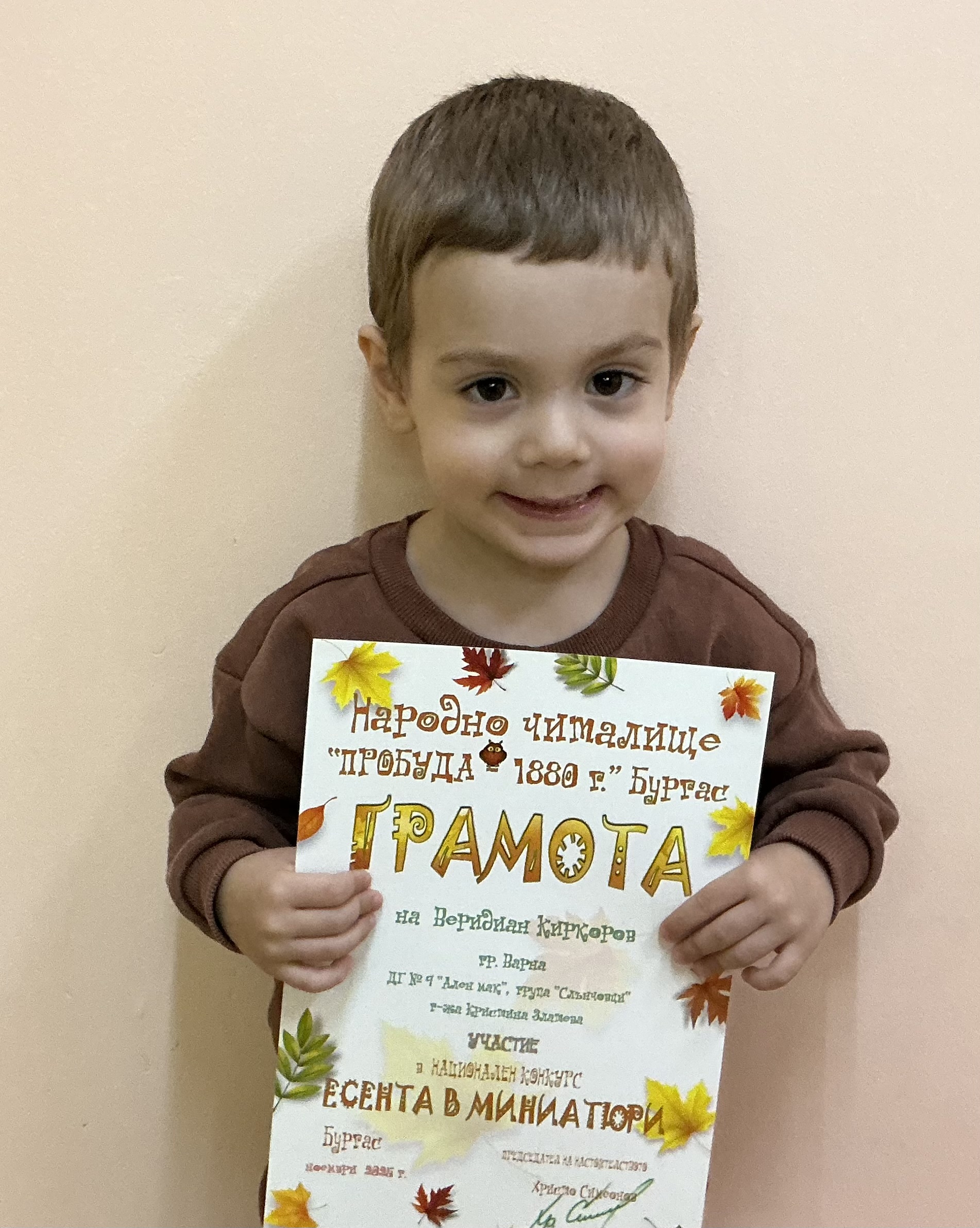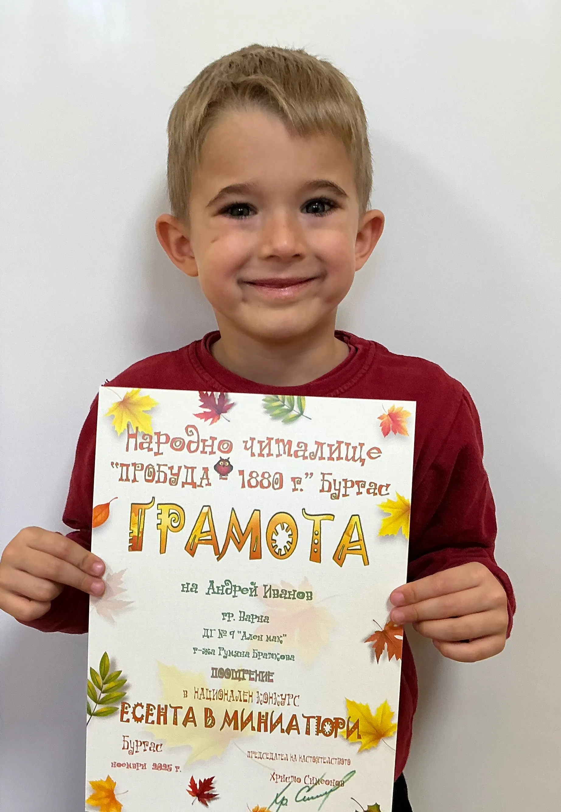 Децата от втора и трета група на детска градина “Ален мак” взеха участие в национален конкурс “Есента в миниатюри”, организиран от Народно читалище “Пробуда- 1880г.” гр. Бургас. Андрей Иванв от III Б група получи поощрителна награда.