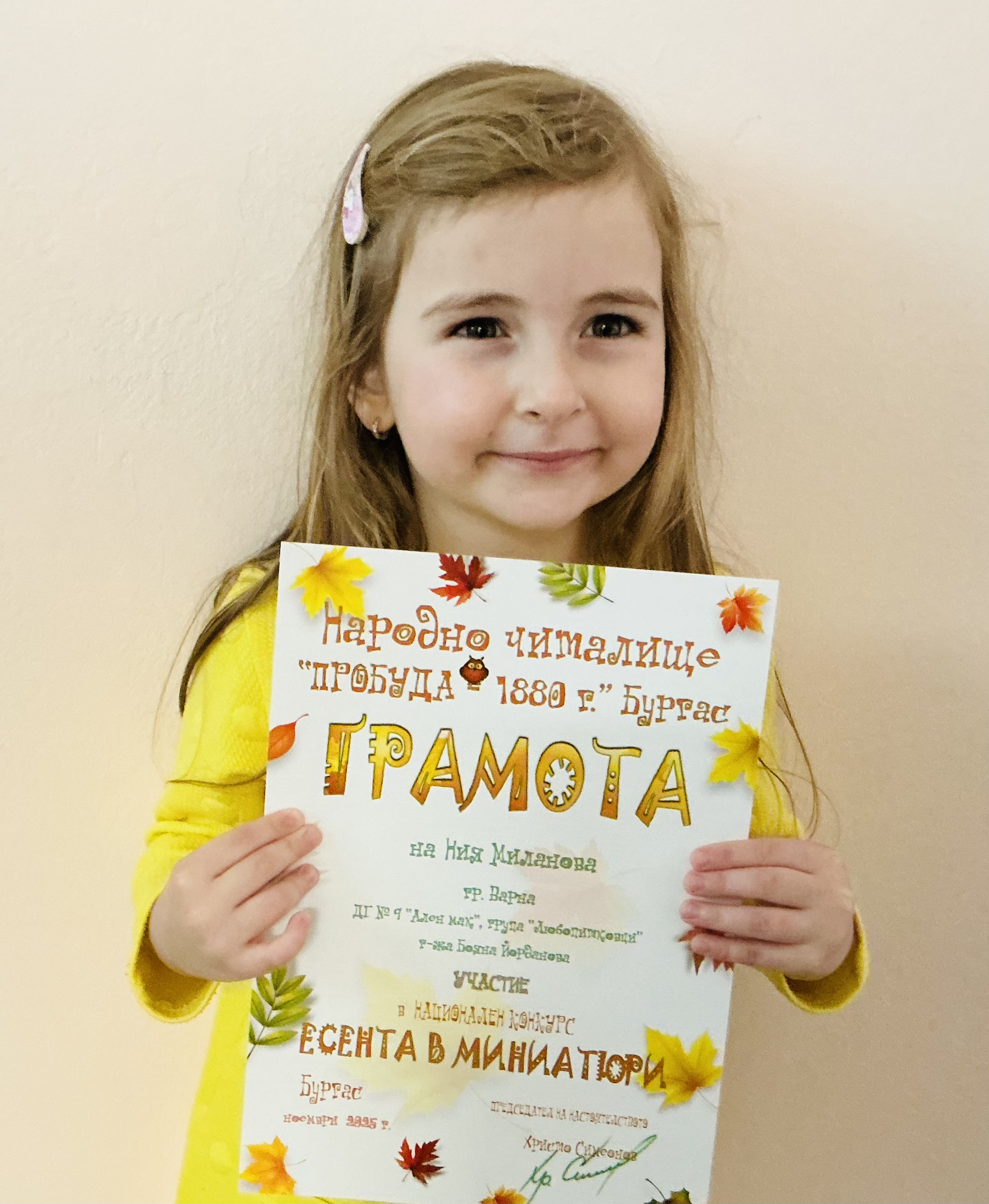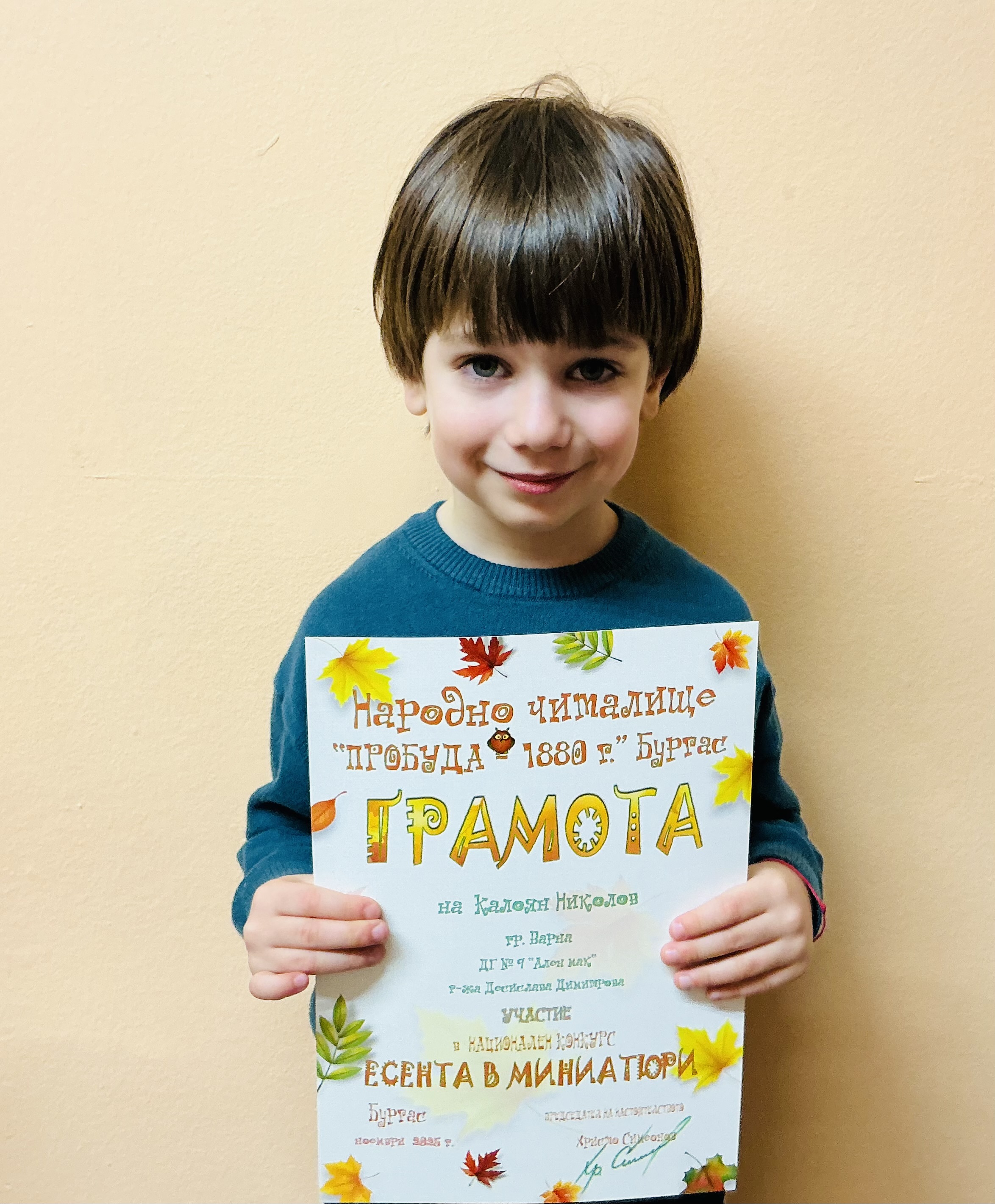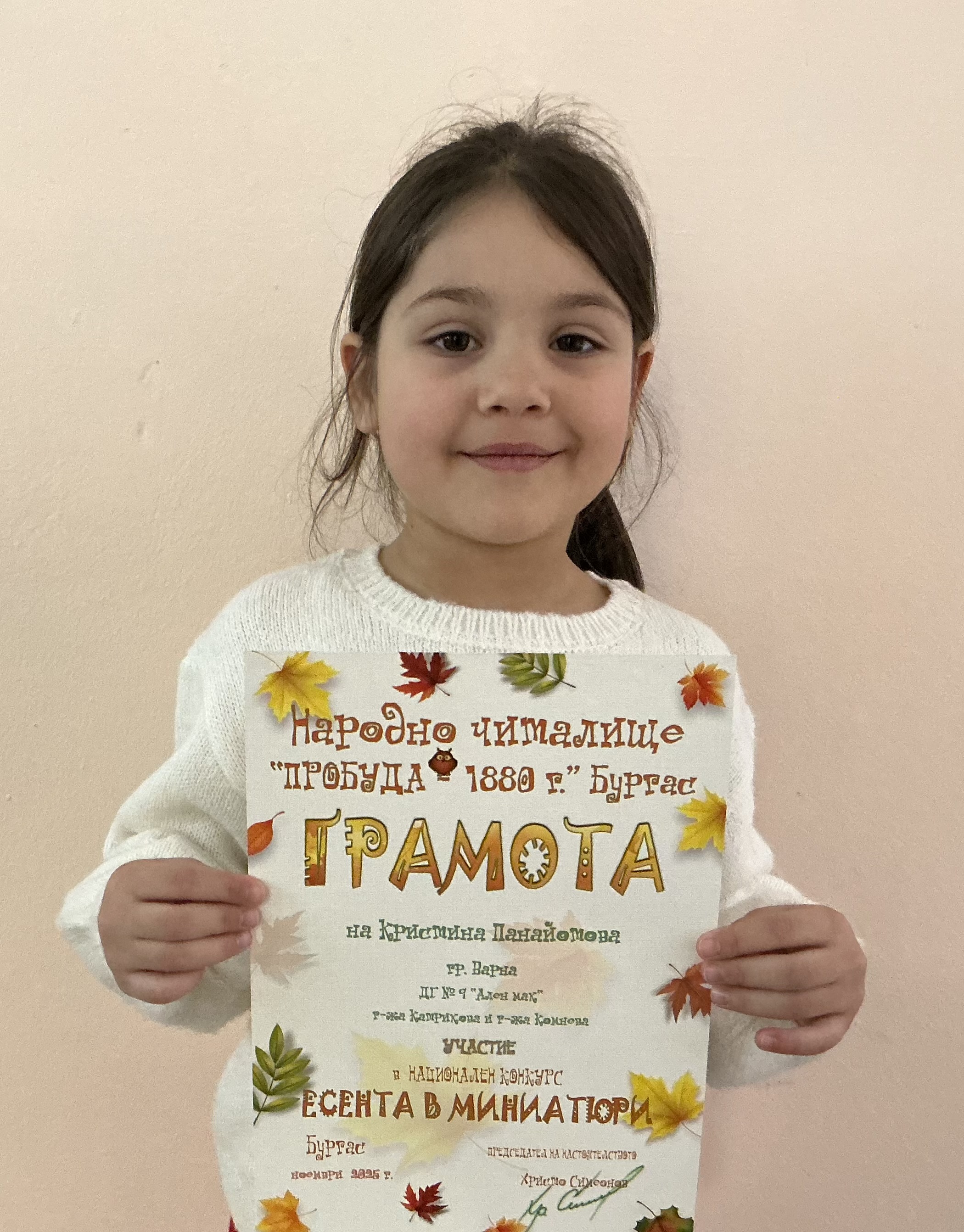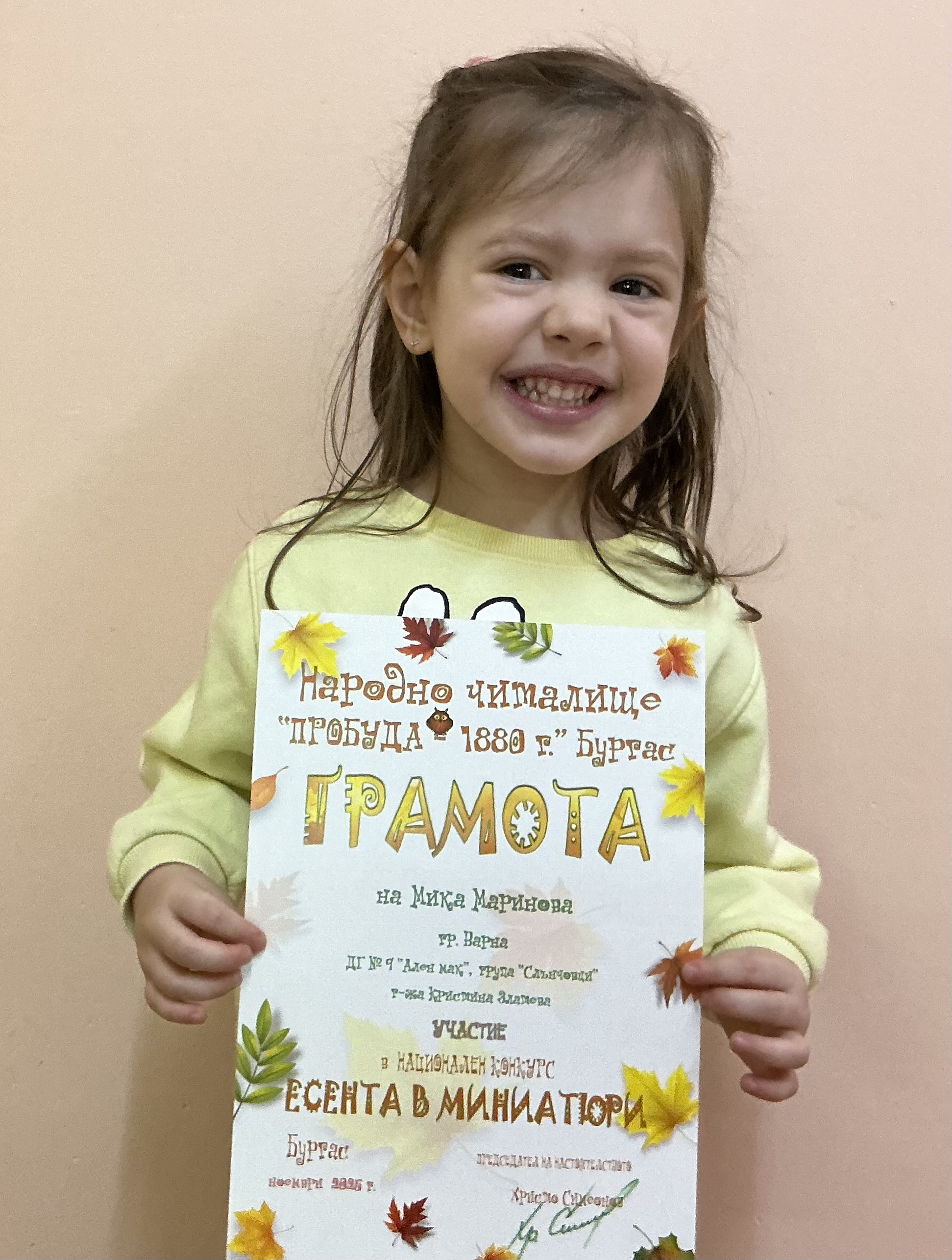 Децата от втора и трета група на детска градина “Ален мак” взеха участие в национален конкурс “Есента в миниатюри”, организиран от Народно читалище “Пробуда- 1880г.” гр. Бургас. Андрей Иванв от III Б група получи поощрителна награда.