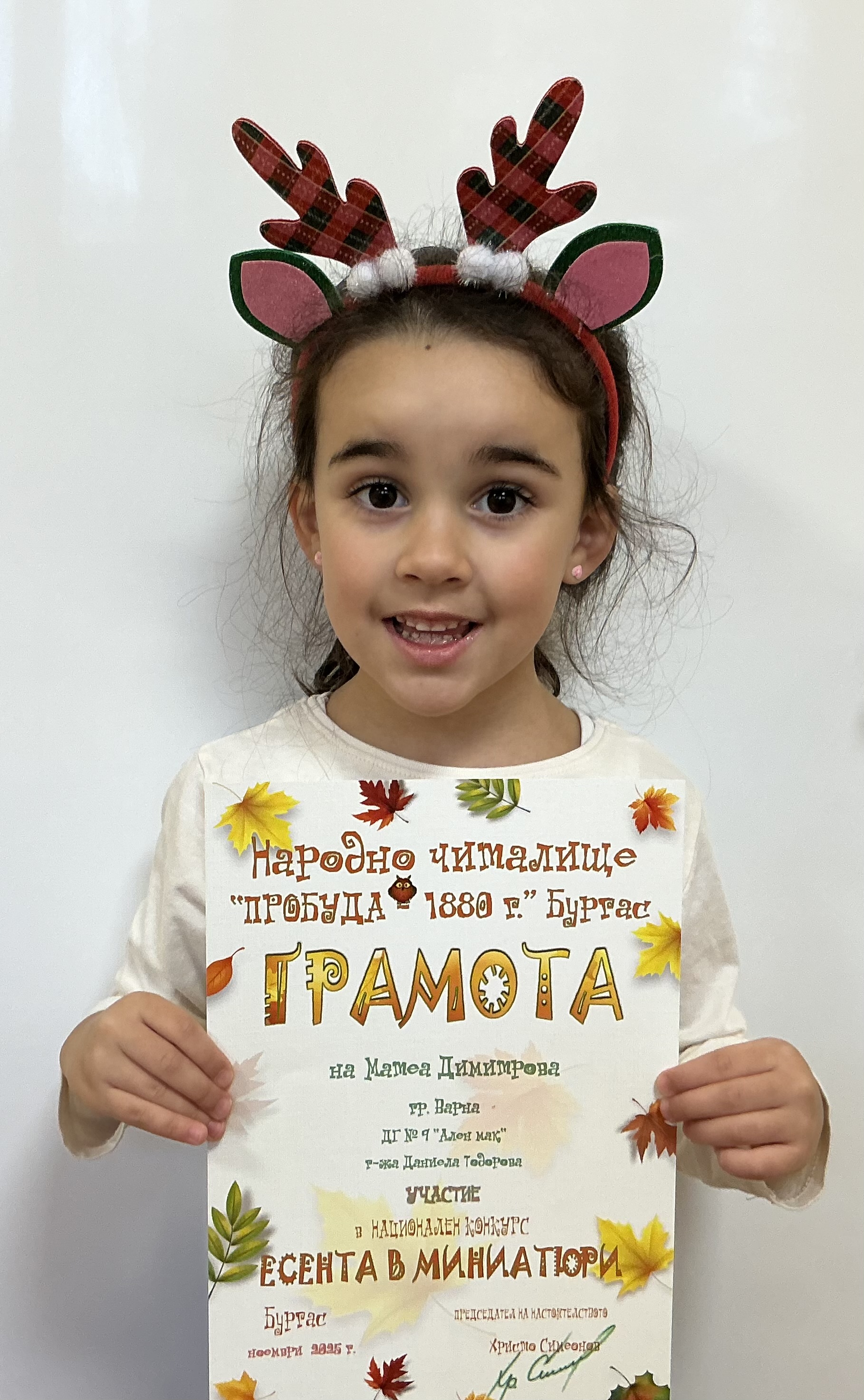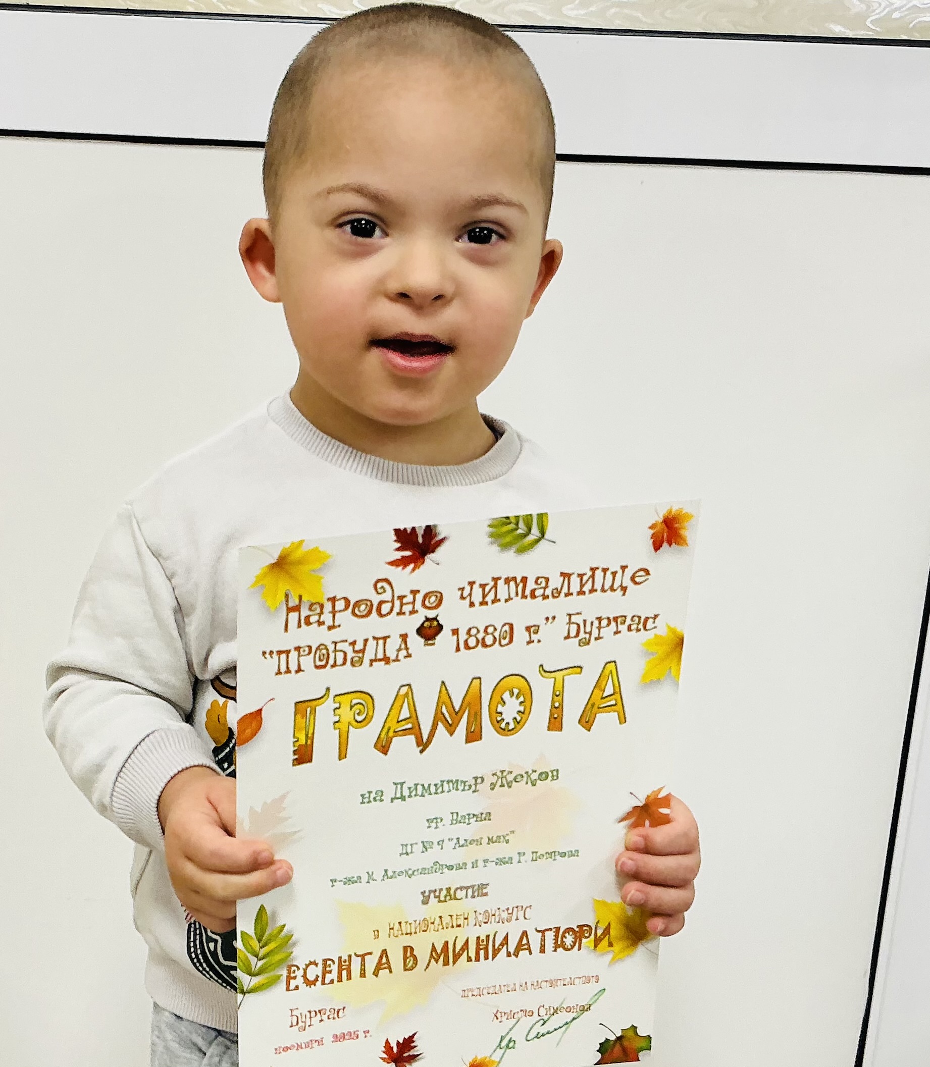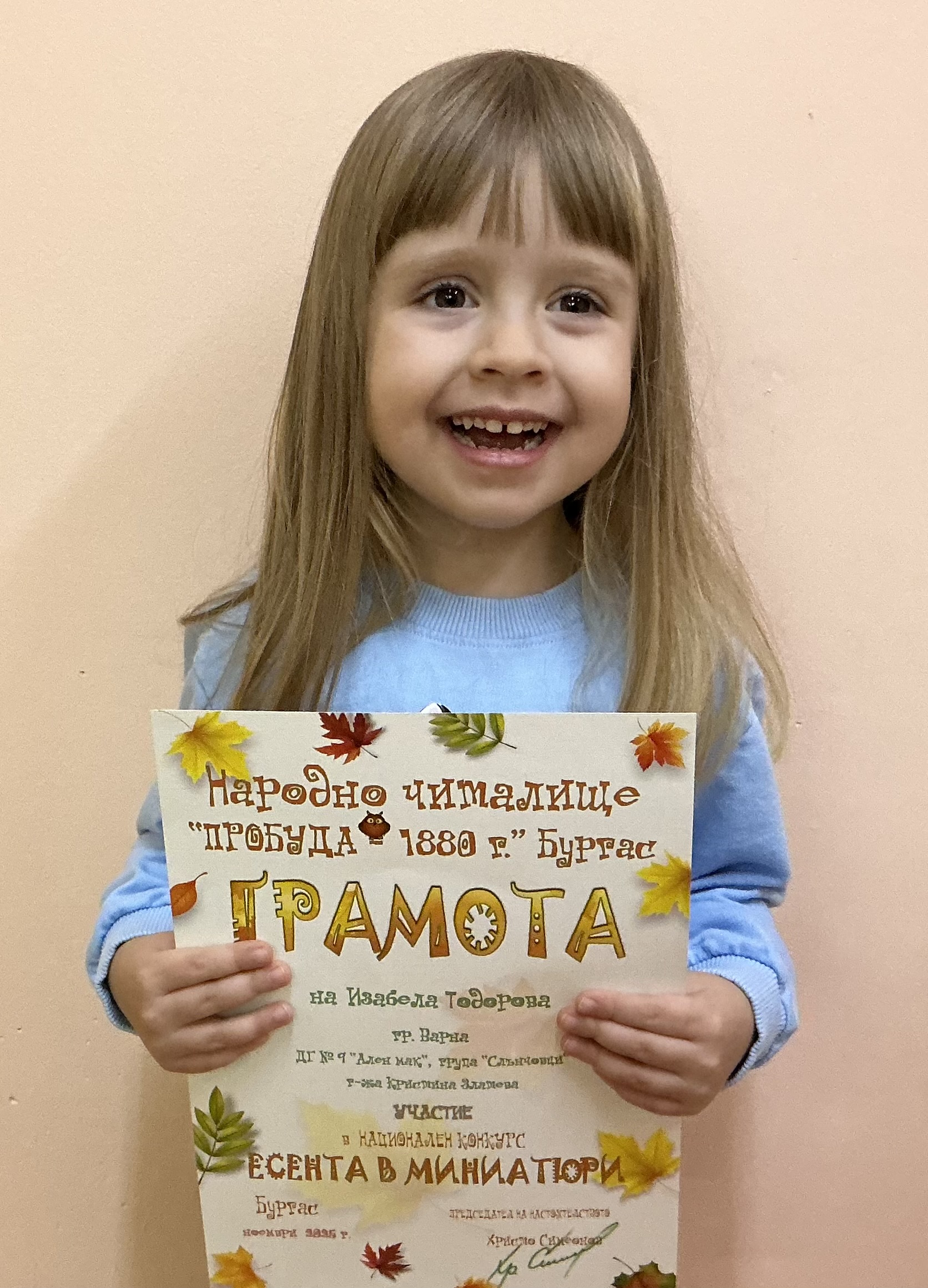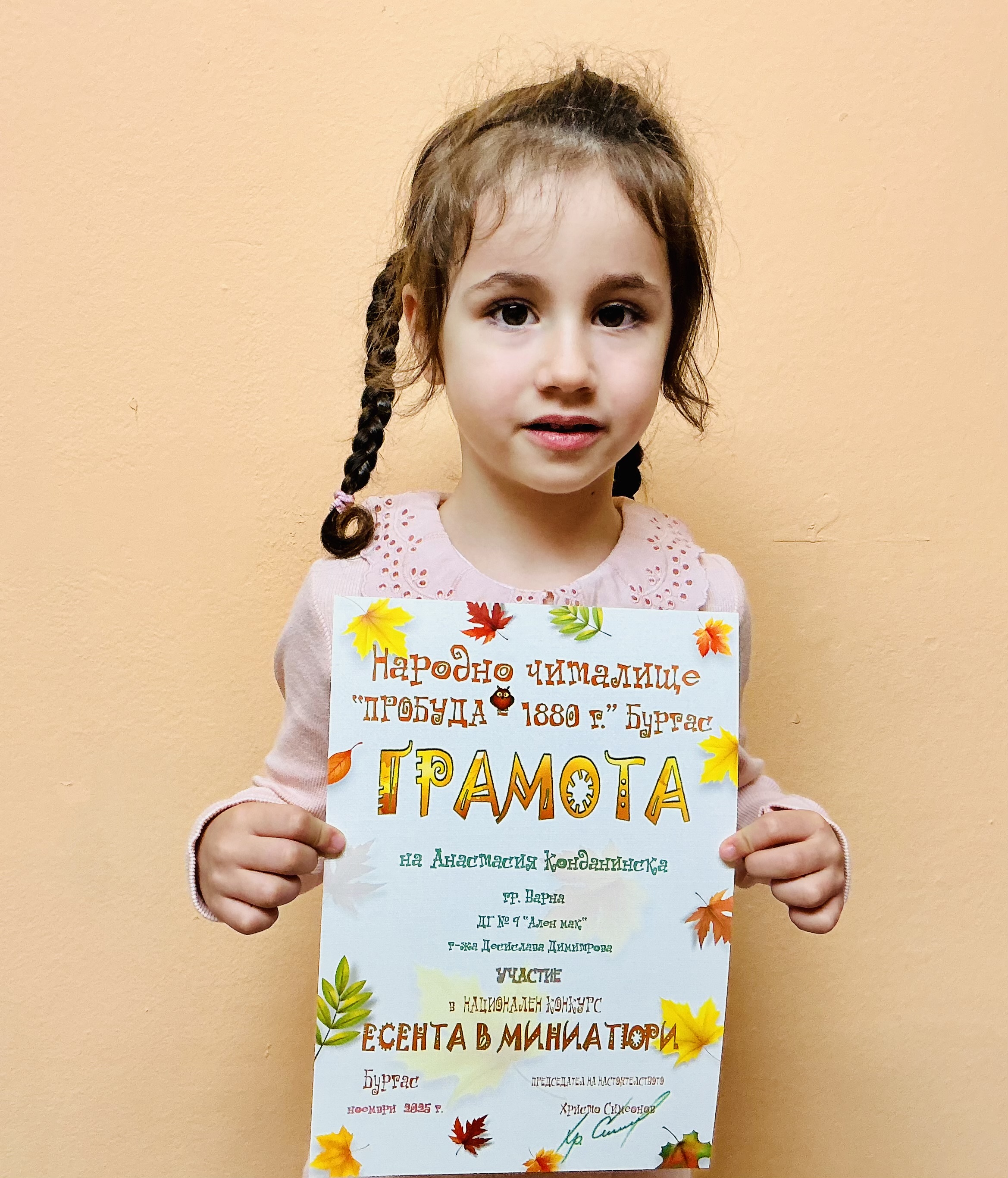 Децата от втора и трета група на детска градина “Ален мак” взеха участие в национален конкурс “Есента в миниатюри”, организиран от Народно читалище “Пробуда- 1880г.” гр. Бургас. Андрей Иванв от III Б група получи поощрителна награда.