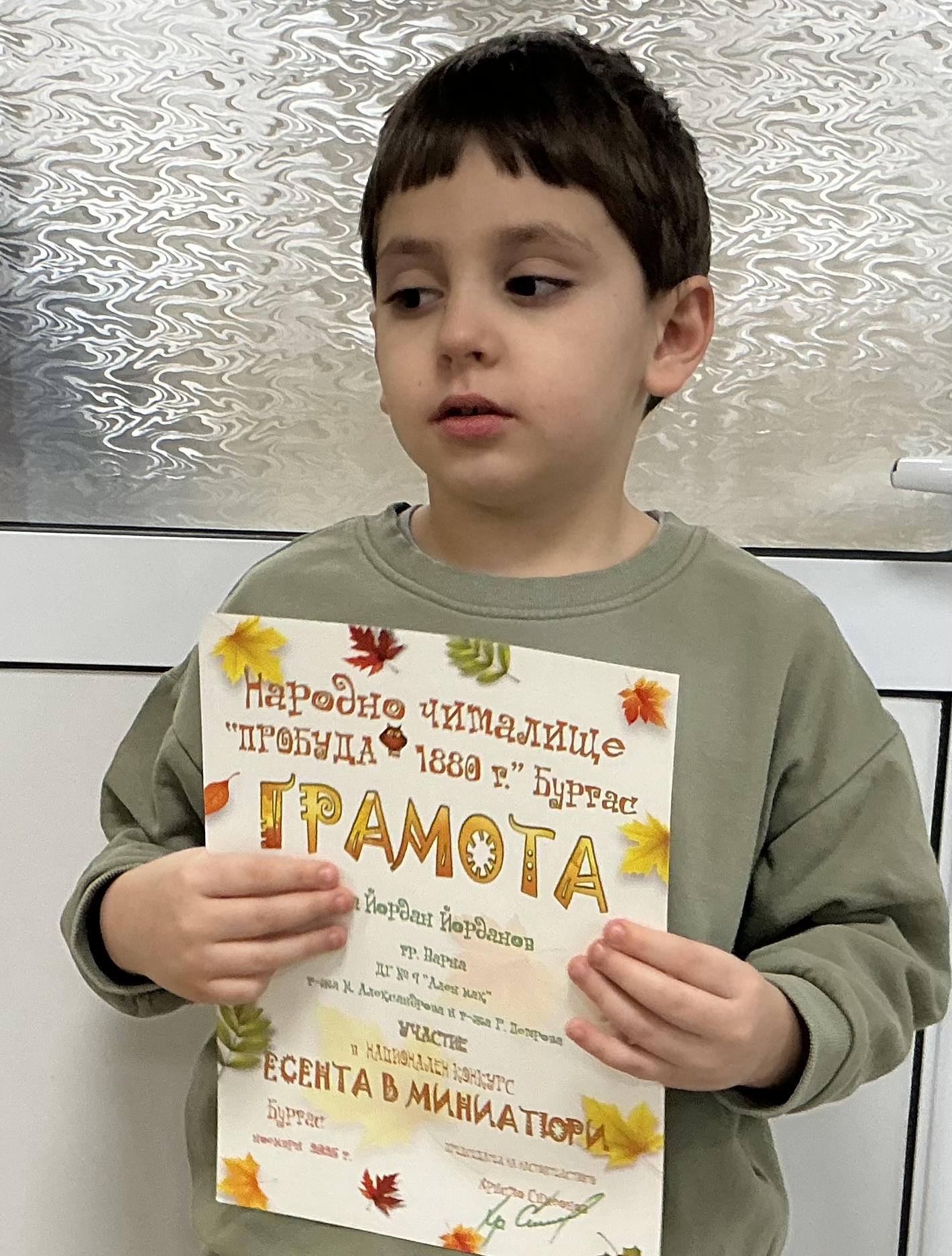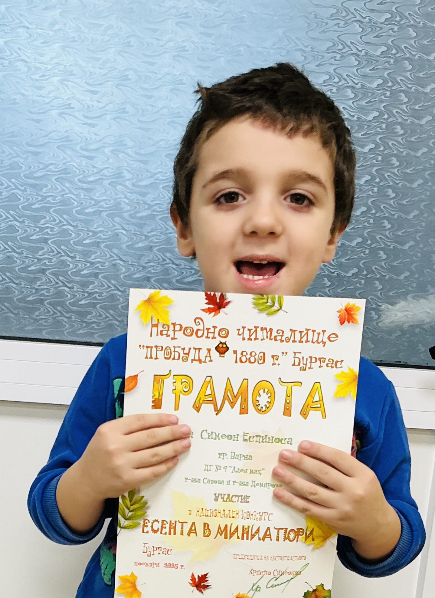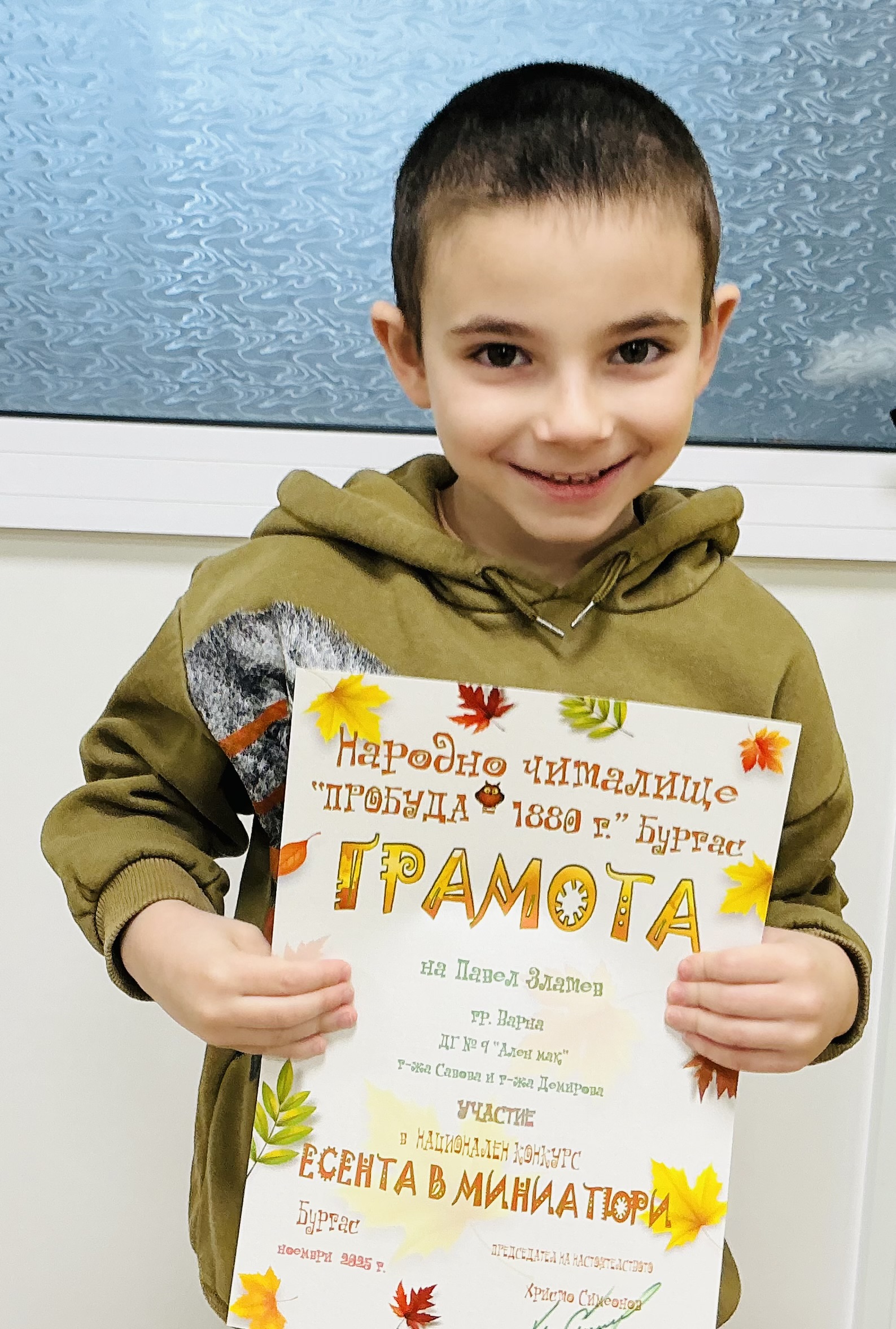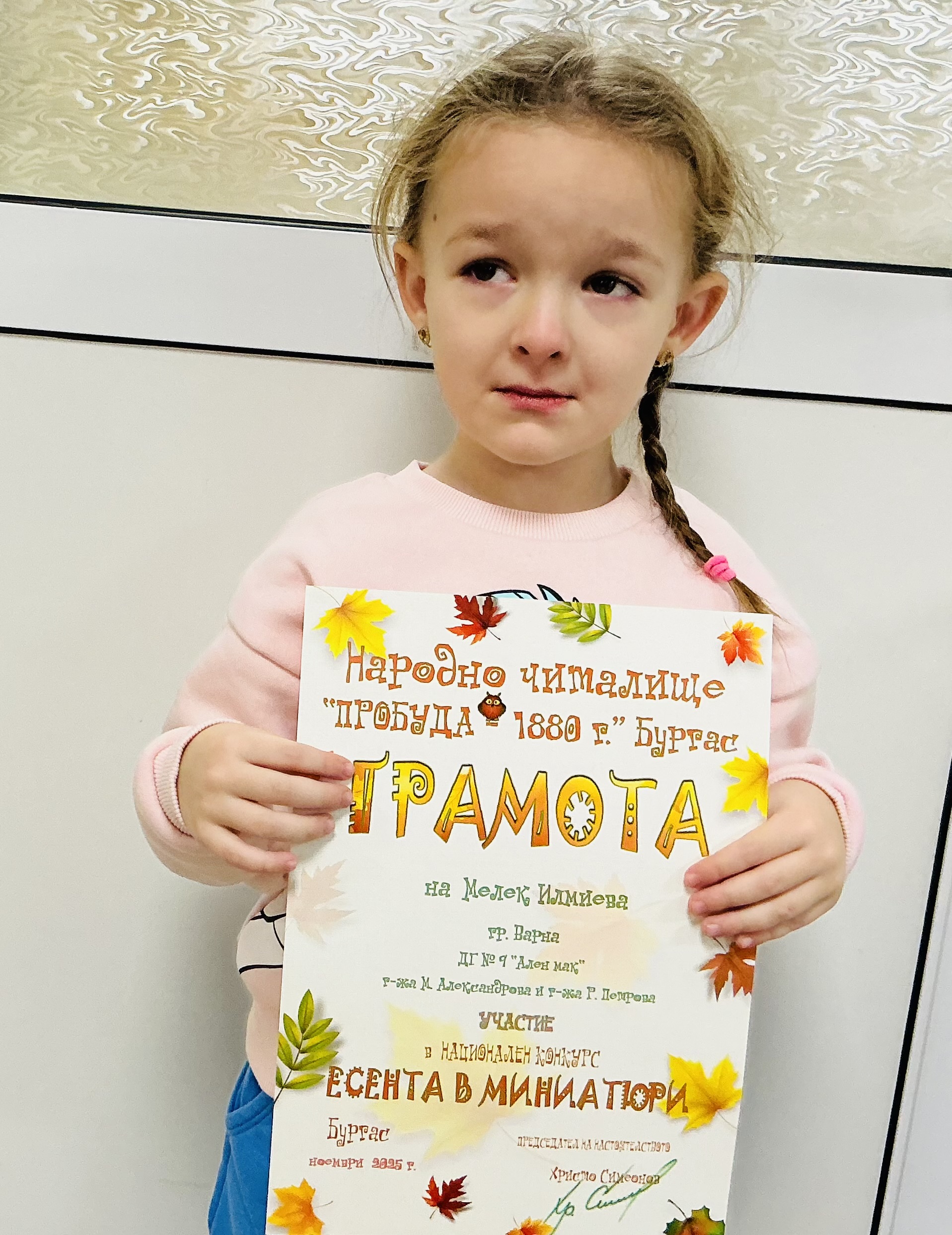 Децата от втора и трета група на детска градина “Ален мак” взеха участие в национален конкурс “Есента в миниатюри”, организиран от Народно читалище “Пробуда- 1880г.” гр. Бургас. Андрей Иванв от III Б група получи поощрителна награда.