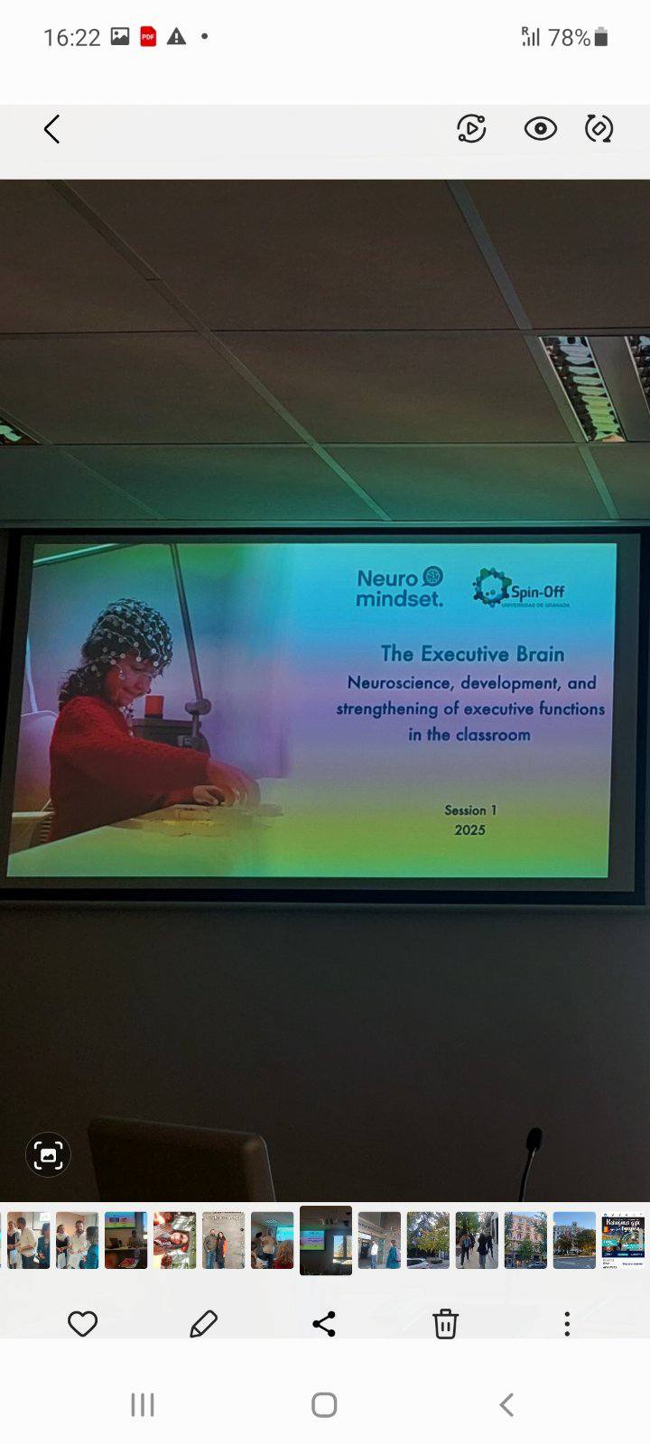 „В Центъра за трансфер на изследователски технологии към университета в Гранада участвахме в работилница посветена на детския мозък и развитие на вниманието и саморегулацията и тяхното влияние върху ученето, емоционалната регулация и социалните умения. Там ни представиха презентация, с която теоретично ни запознаха с изследванията, които провеждат относно развитието на детския мозък и когнитивните способности от най-ранна възраст.