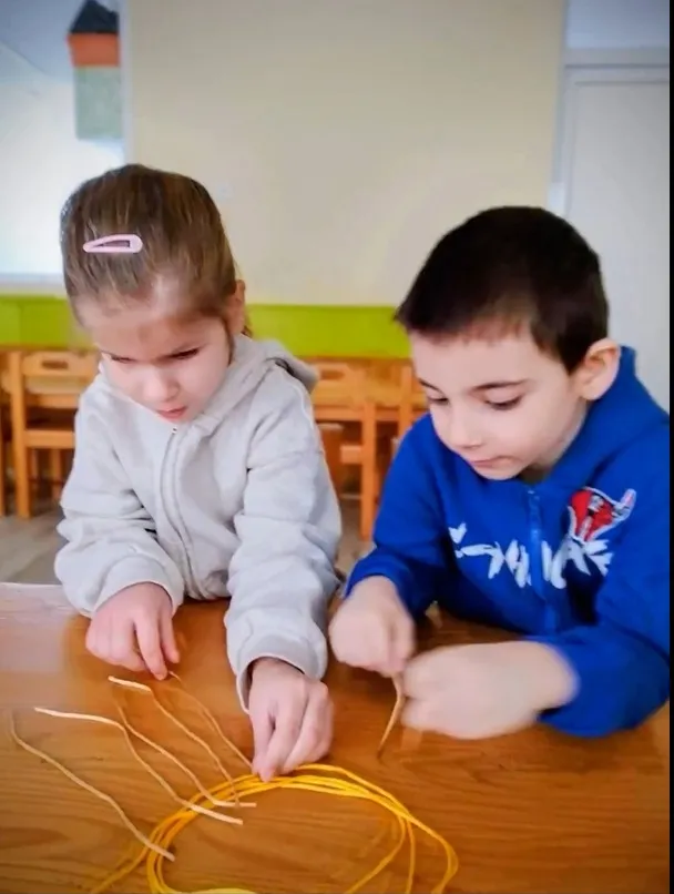 Горе на небето грее слънце. Долу по земята Зайко тегли си шейната. Кученце – отпред, котенце – отзад – сговорна са дружина по снежната пъртина. Детето вътре си играе, а снежното човече вън скучае.
