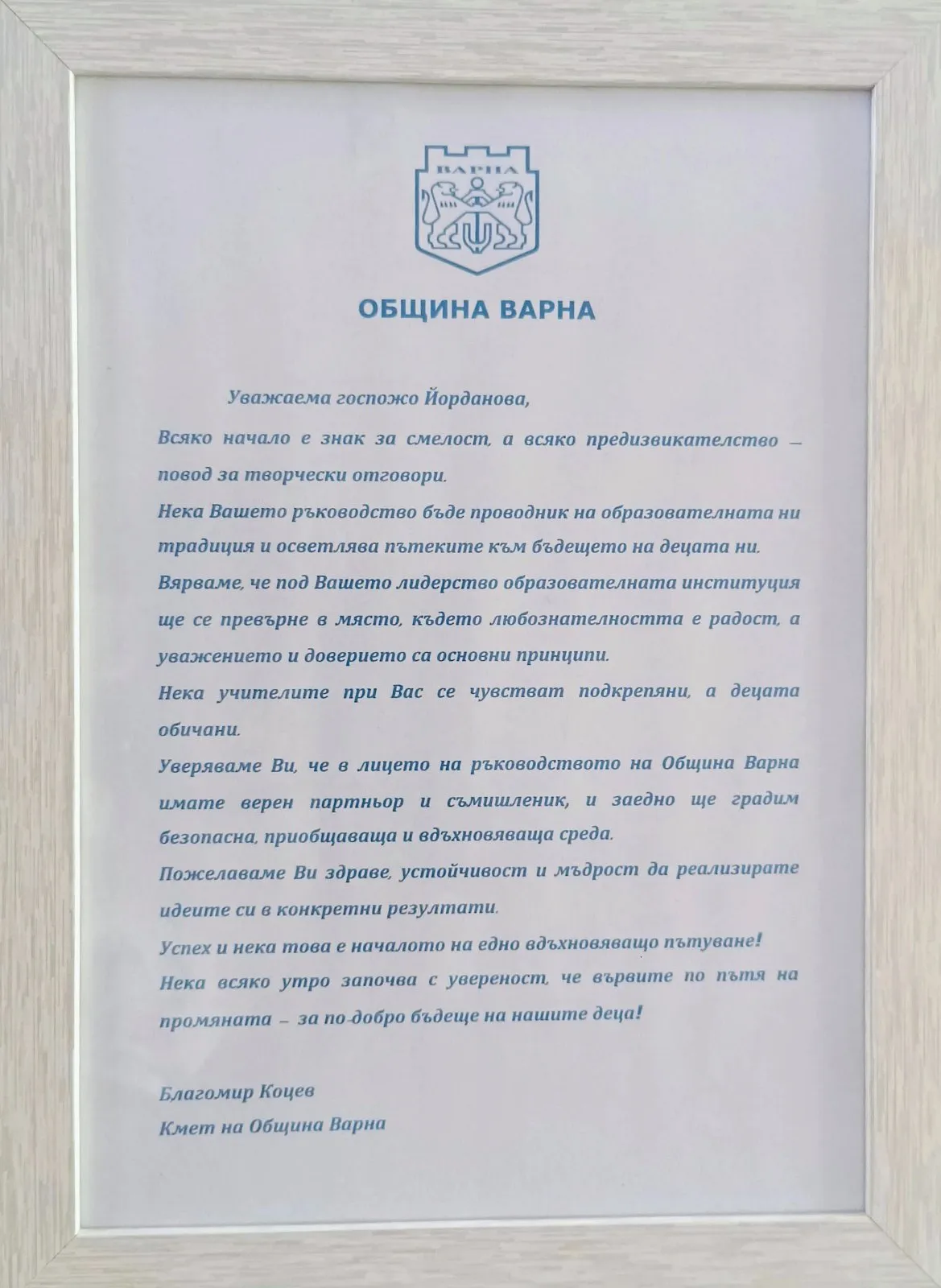 Поздравителен адрес от Община Варна по повод успешно издържан конкурс за директор на детската градина от г-жа Бояна Йорданова.