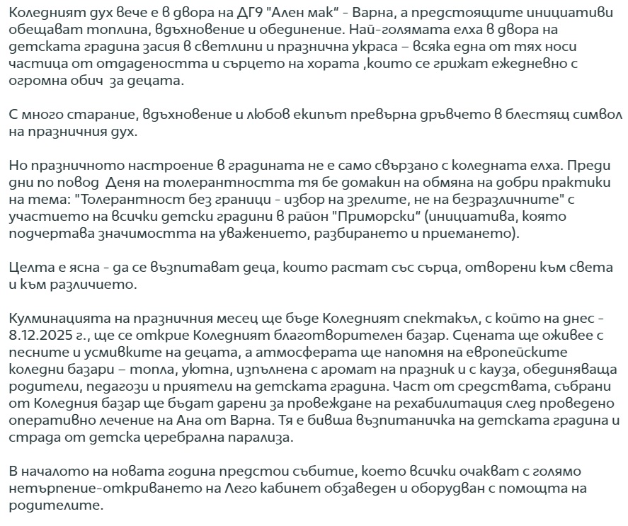 https://www.varna24.bg/novini/varna/Tova-e-nai-golyamata-koledna-elha-v-detska-gradina-vuv-Varna-2813015?fbclid=IwY2xjawOjo85leHRuA2FlbQIxMQBzcnRjBmFwcF9pZBAyMjIwMzkxNzg4MjAwODkyAAEeh9H6Jg18Wh4lvfqVbGWgVu8rfBe0QBRicv6agRbOL0DpSsQvZh0zMoy6uJE_aem_QtQOwePdySmESSisILZfCw