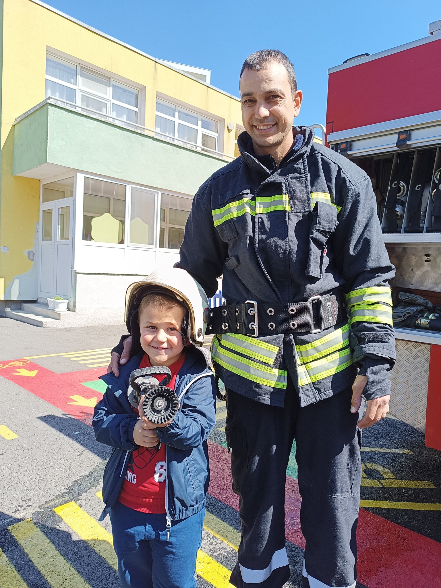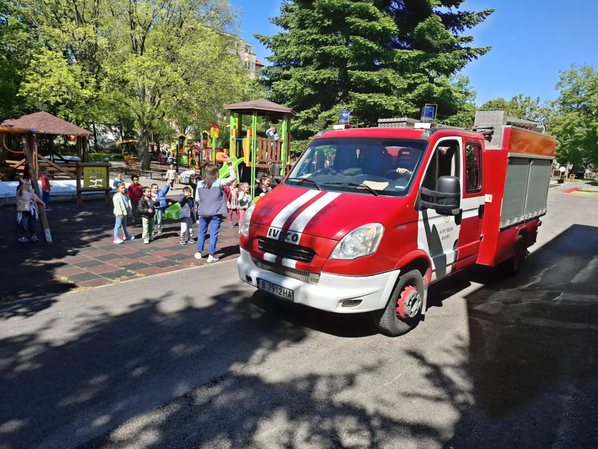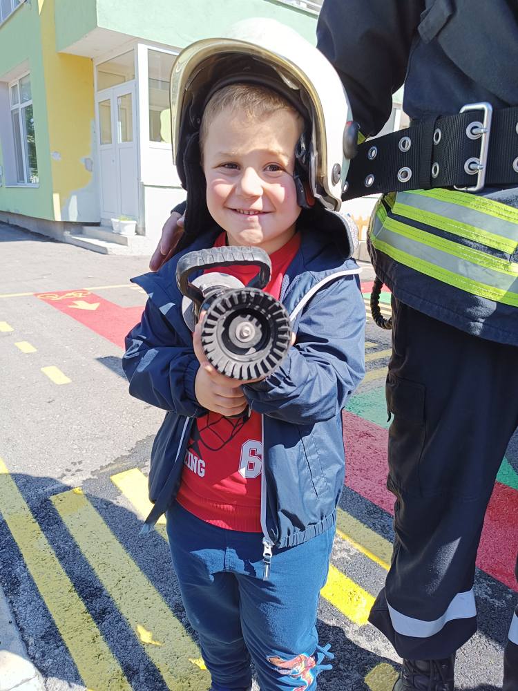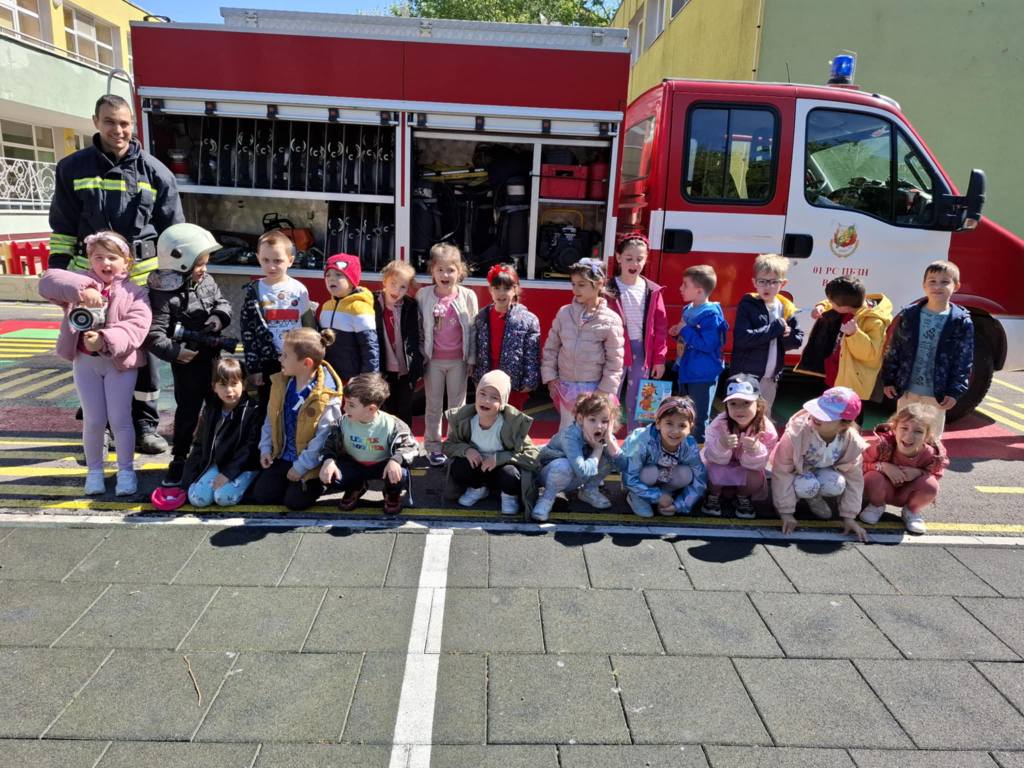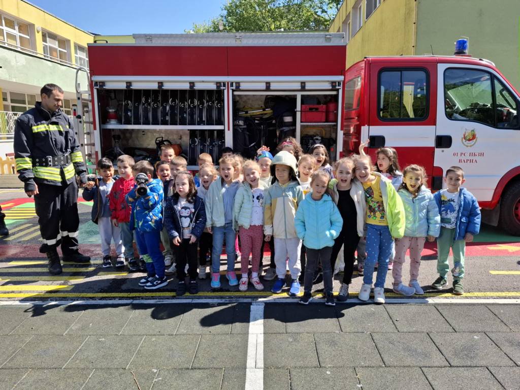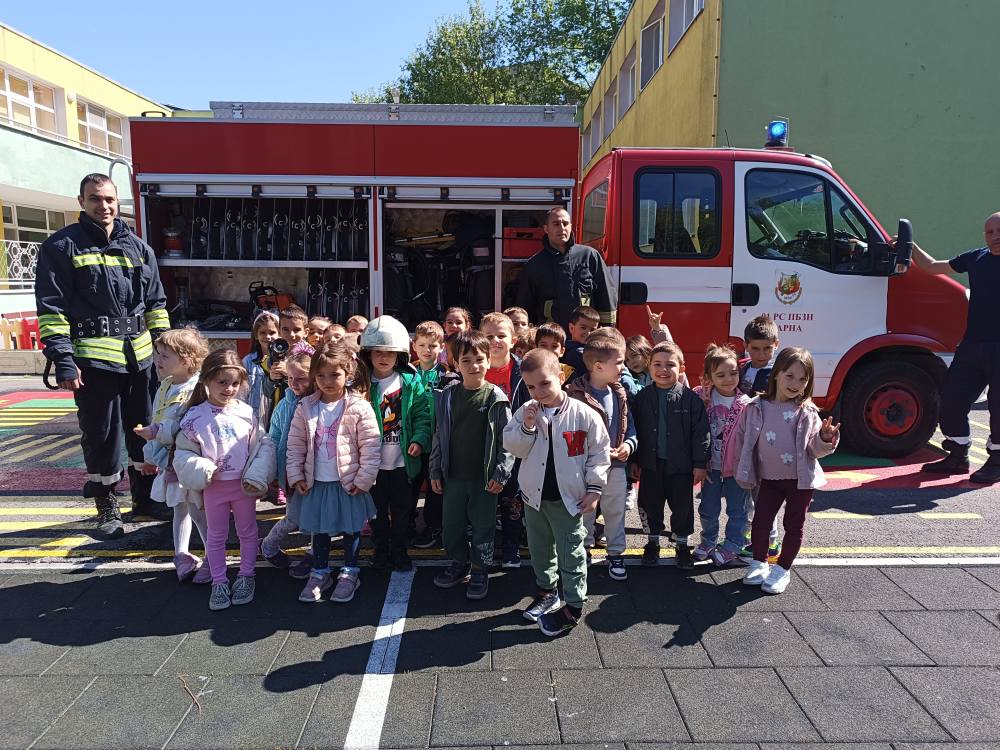 Децата присъстваха на демонстрация по гасене на пожар и спасяване на хора в горяща сграда. Докоснаха се до пожарникарското оборудване и разгледаха пожарния автомобил. И спечелиха нови приятели – смелите огнеборци.